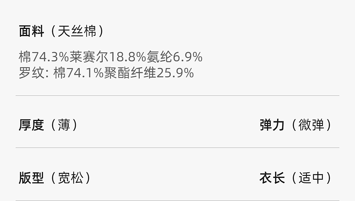 Material Composition Cotton 74.3% Lyocell Fiber (Lyocell) 18.8% Polyurethane Elastic Fiber (Spandex) 6.9%