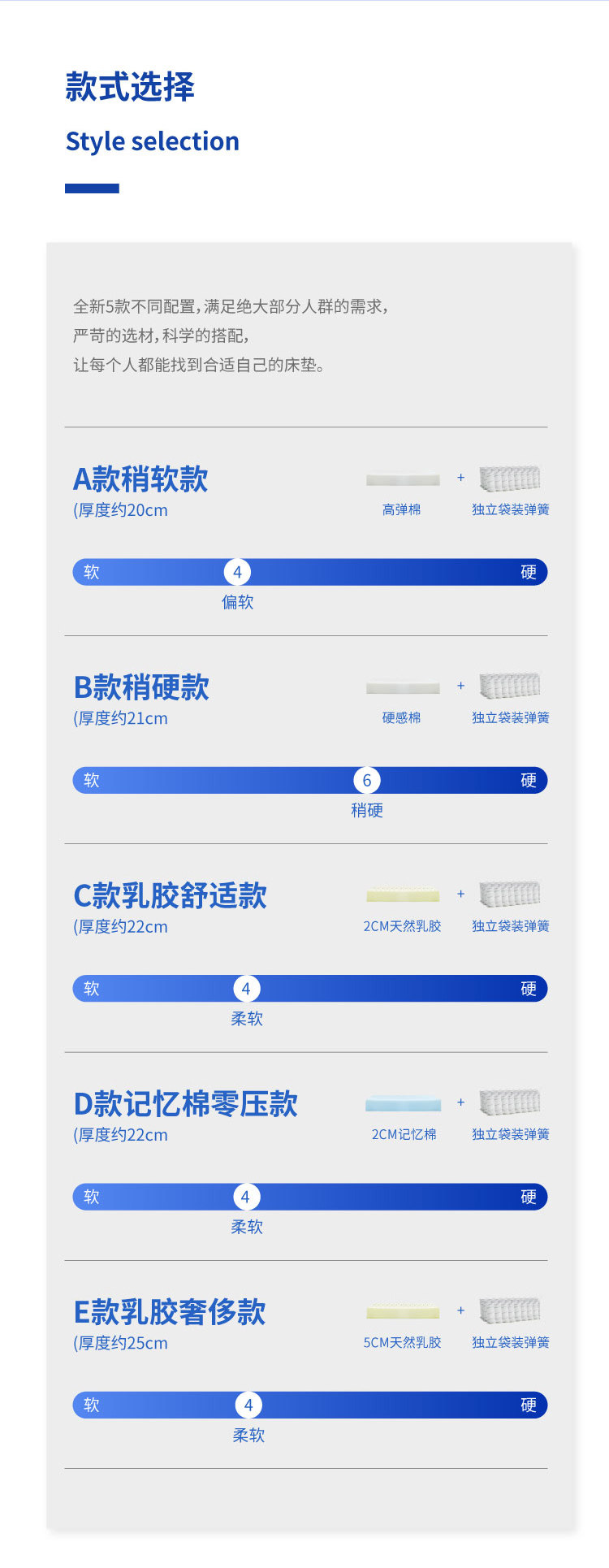 Sort by color A bag - soft style (thickness 20CM) practical choice,B1 bag - medium style (thickness 21CM) with moderate softness and hardness,B2 bag-hard model (thickness 22CM) protects the spine and develops,C bag - latex comfortable style (thickness 22CM) latex anti-mite,D bag-memory foam zero pressure model (thickness 22) recommended for master bedroom,E bag-5cm latex luxury model (25CM),B1 moderate bag (thickness 12CM) with moderate softness and hardness,B2 hard style bag (thickness 14CM) protects the spine and develops,C latex bag (thickness 14CM) comfortable and silent,D memory foam bag (thickness 14CM) recommended for master bedroom,A1 independent-soft model (thickness 20CM) is cost-effective,A2 independent-moderate model (thickness 21CM) with moderate softness and hardness,A2 independent-hard model (thickness 22CM) spine protection development,A3 independent-latex comfortable style (thickness 22CM) latex anti-mite,A4 independent-memory foam zero pressure model (thickness 22) recommended for master bedroom,A5 independent-5cm latex luxury model (25CM),A2 moderate model independent (thickness 12CM) with moderate softness and hardness,A2 hard style independent (thickness 14CM) spine protection development,A3 latex model independent (thickness 14CM) comfortable and silent,A4 memory foam independent (thickness 14CM) recommended for master bedroom