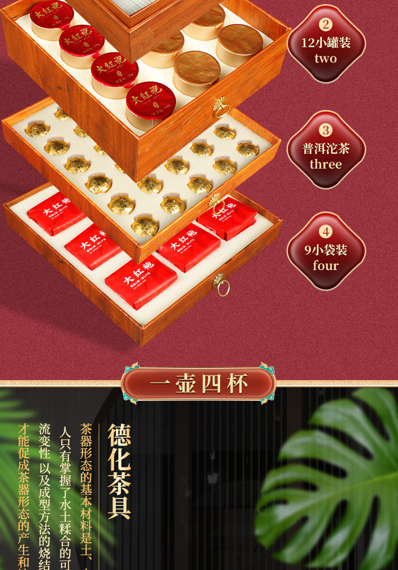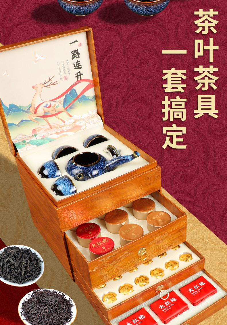 颜色分类 【四层一路连升礼盒】一壶四杯+大红袍+正山小种+普洱,【四层龙腾盛世礼盒】一壶四杯+大红袍+正山小种+普洱+小青柑,【御品天下】大红袍茶叶礼盒250g