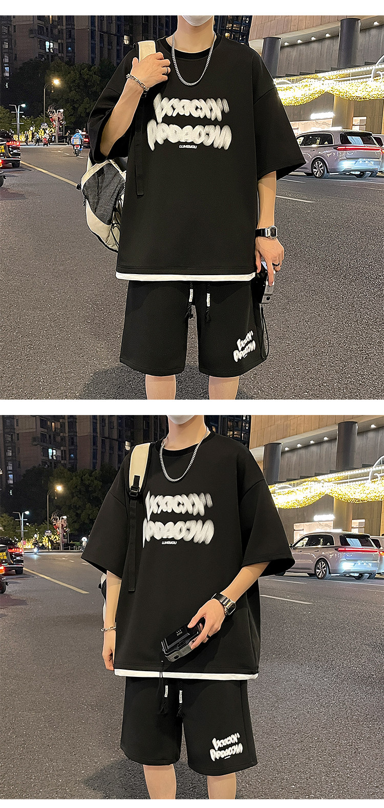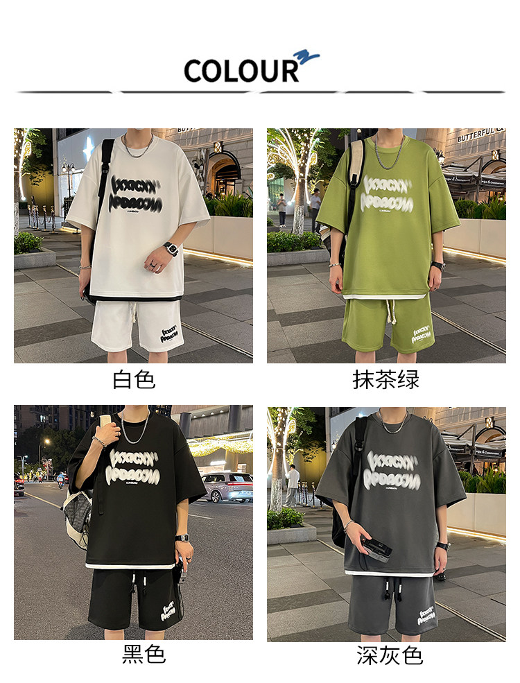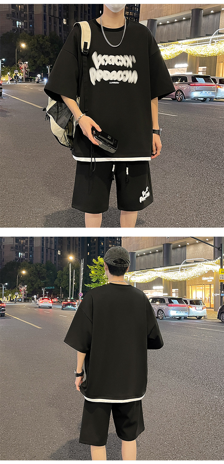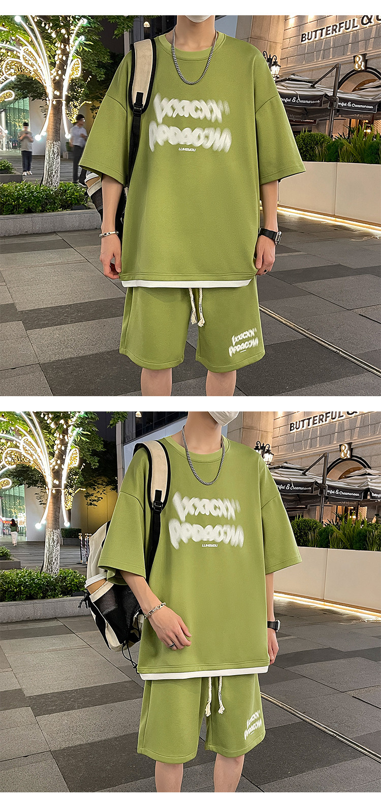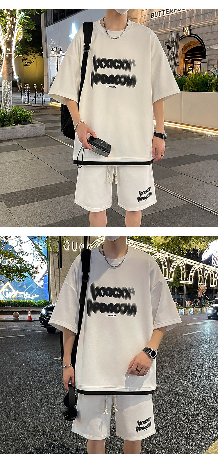 Fake Two-Piece Casual Sports Suit for Men, Summer Trendy Brand Short-Sleeve T-Shirt and Shorts, Men's High-End Style Matching Set