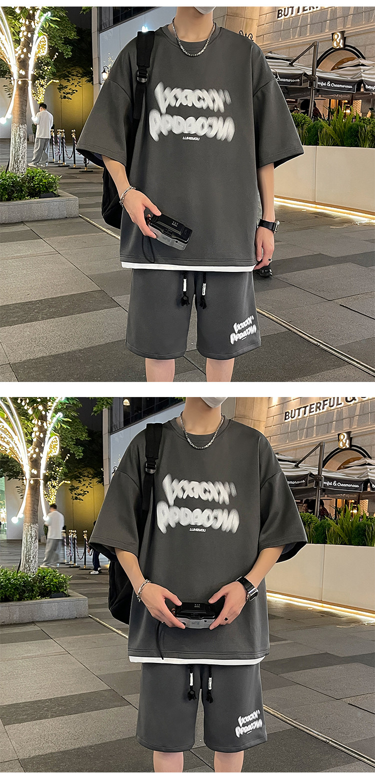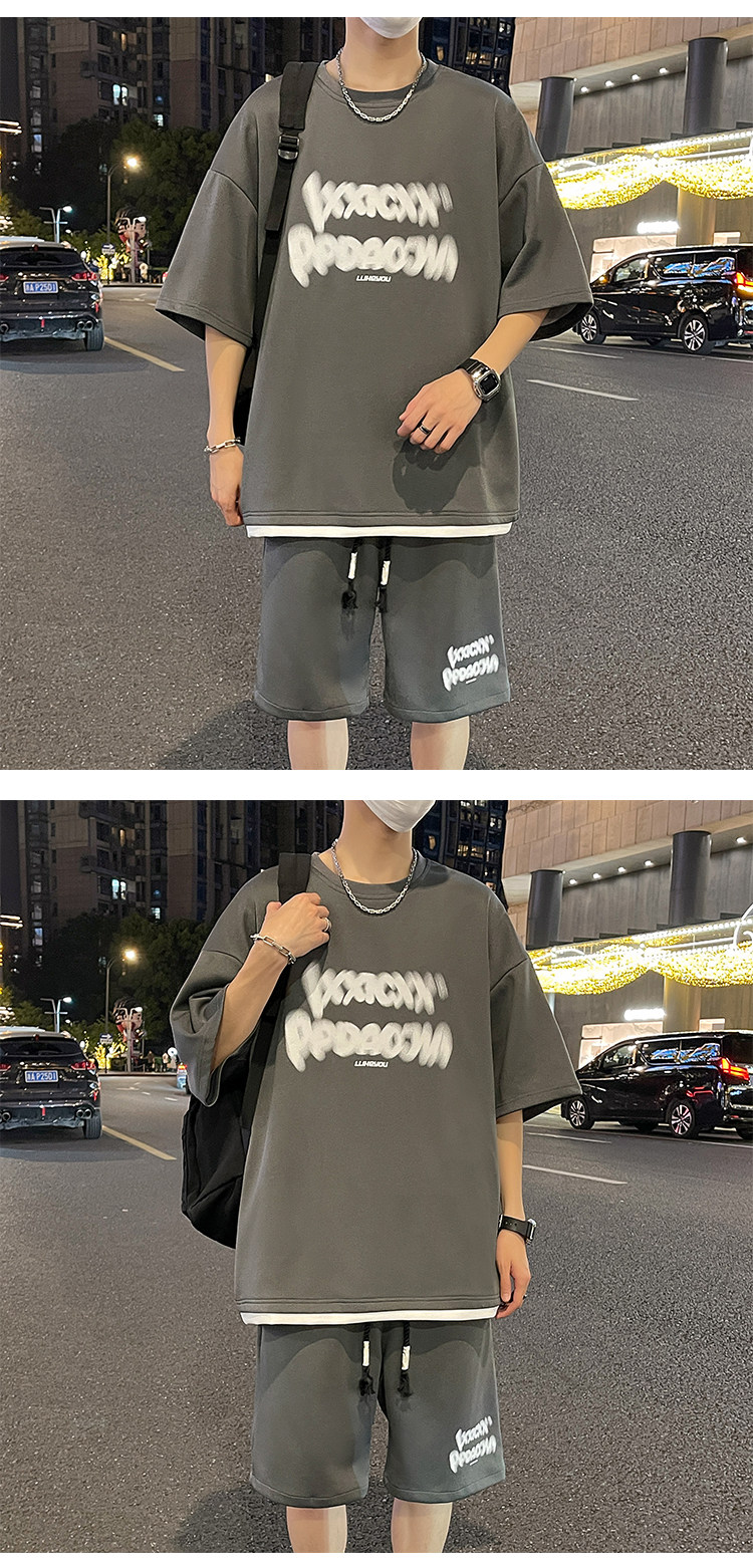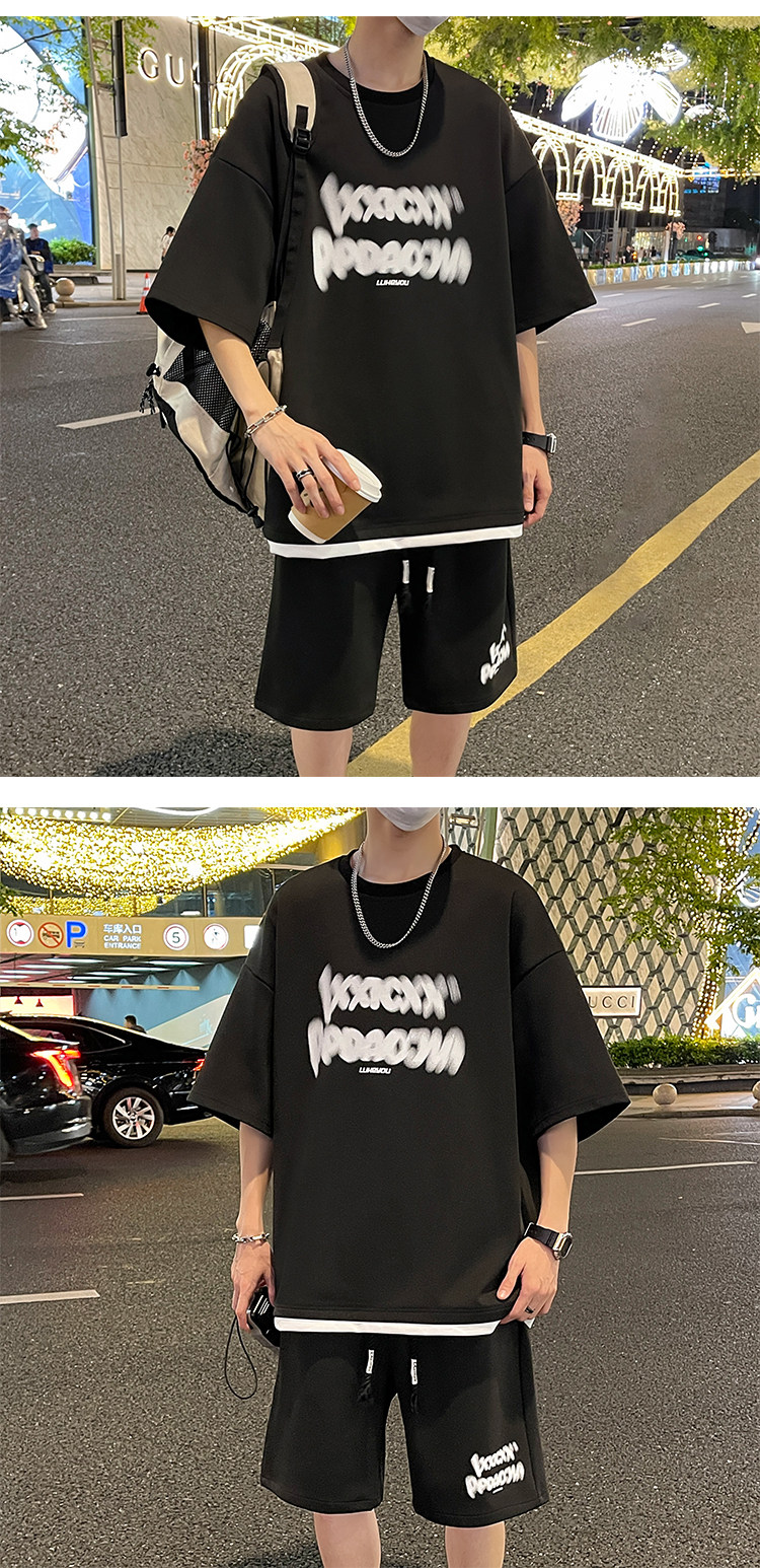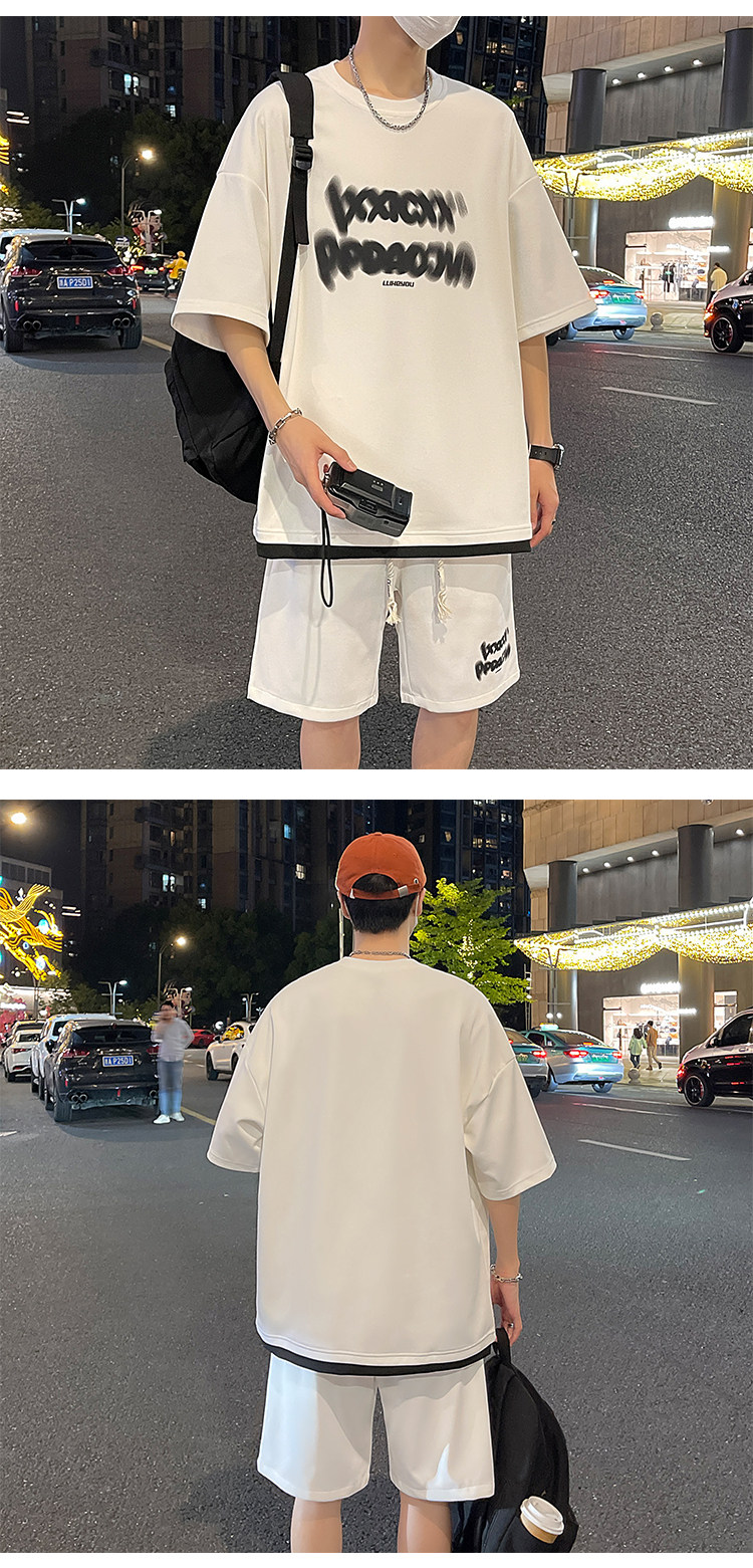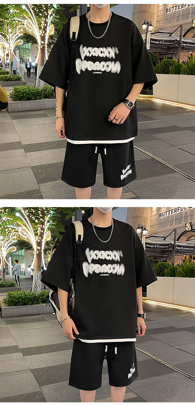 Fake Two-Piece Casual Sports Suit for Men, Summer Trendy Brand Short-Sleeve T-Shirt and Shorts, Men's High-End Style Matching Set