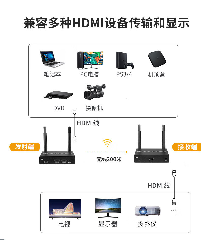 Color Classification [1080P/ 100m Version] 1 Transmitter + 1 Receiver,[1080P/ 100m Version] 1 Transmitter + 2 Receivers,[1080P/ 100m Version] 1 Transmitter + 3 Receivers,[1080P/ 100m Version] 1 Transmitter + 4 Receivers,[4K/ 100m Version] 1 Transmitter + 1 Receiver,[4K/ 100m Version] 1 Transmitter + 2 Receivers,[4K/ 100m Version] 1 Transmitter + 3 Receivers,[1080P/ 200m Version] 1 Transmitter + 1 Receiver,[1080P/ 200m Version] 1 Transmitter + 2 Receivers,[1080P/ 200m Version] 1 Transmitter + 3 Receivers,[1080P/ 200m Version] 1 Transmitter + 4 Receivers,[1080P/ 200m Version] 1 Transmitter + 5 Receivers,[1080P/ 200m Version] 1 Transmitter + 6 Receivers,[1080P/ 200m Version] 1 Transmitter + 7 Receivers,[1080P/ 200m Version] 1 Transmitter + 8 Receivers,[4K/ 200m Version] 1 Transmitter + 1 Receiver,[4K/ 200m Version] 1 Transmitter + 2 Receivers,[4K/ 200m Version] 1 Transmitter + 3 Receivers,[4K/ 200m Version] 1 Transmitter + 4 Receivers,[4K/ 200m Version] 1 Transmitter + 5 Receivers,[4K/ 200m Version] 1 Transmitter + 6 Receivers,[4K/ 200m Version] 1 Transmitter + 7 Receivers,[4K/ 200m Version] 1 Transmitter + 8 Receivers,Receiver: 1 Unit (Prices Vary by Specification, Please Contact Customer Service for Details)