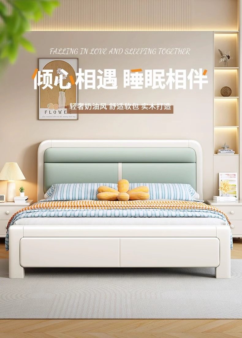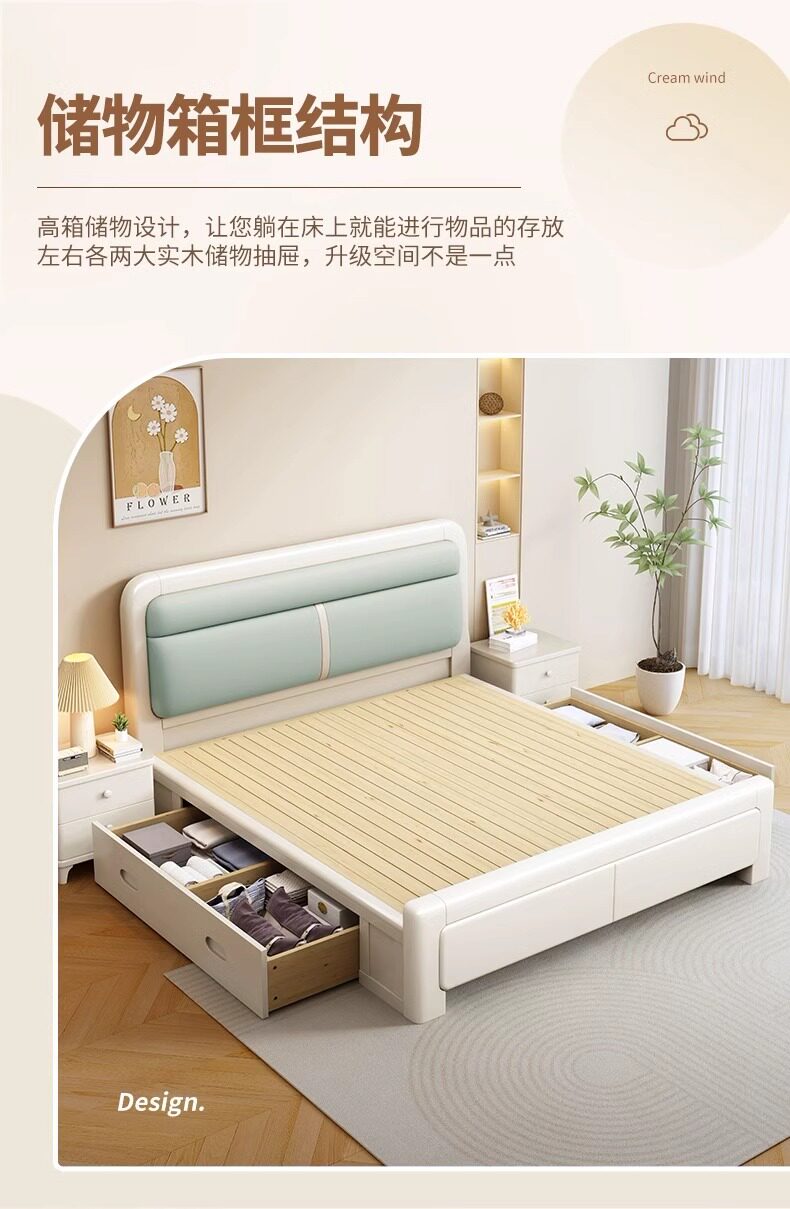 Nordic Solid Wood Bed with Soft Headboard, White 1.8m Master Bedroom Double Bed, Modern and Simple 1.5m Economical Storage Bed