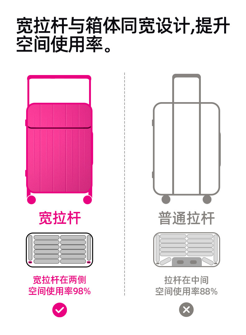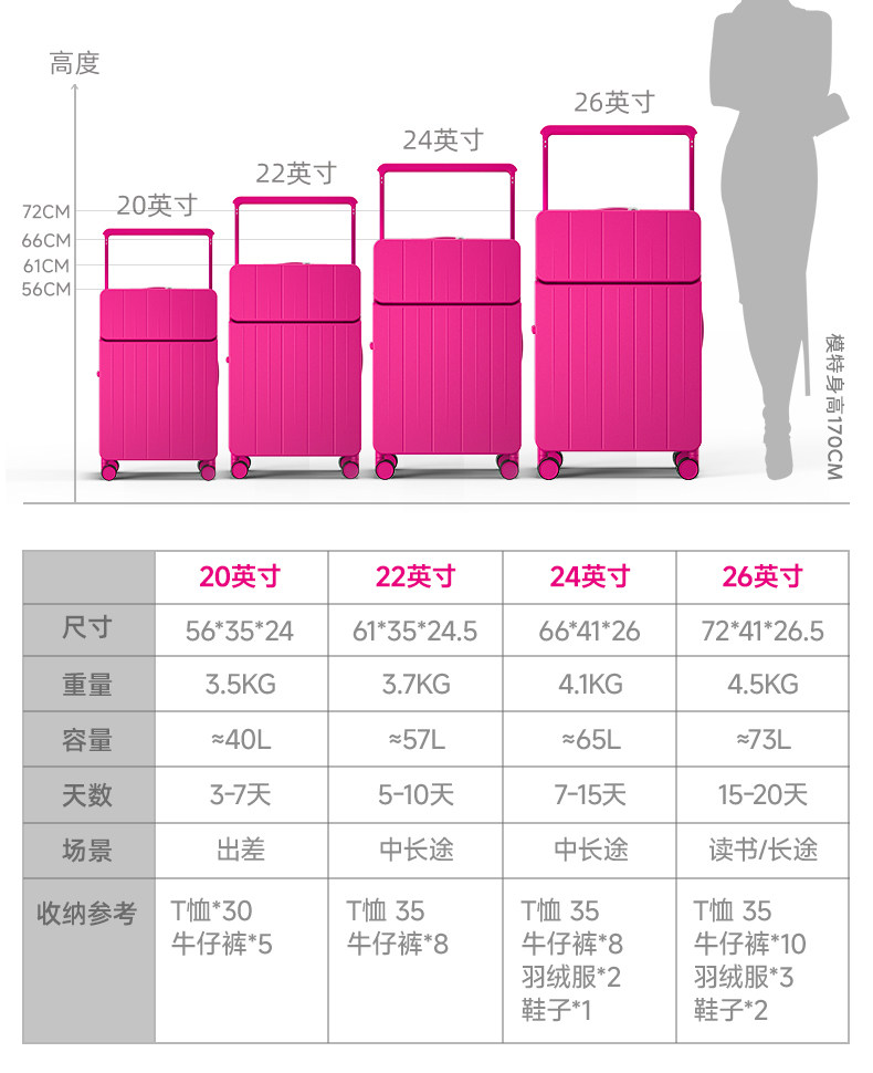 Size 20-inch-can-board, suitable for 3-7 days of travel, purchase and get dustproof box cover,22 inch - Need to be shipped Suitable for 5-10 days of travel, strict quality standards,24 inch - Need to be shipped Suitable for 7-15 days of travel, 15 days of worry-free return and exchange,26 inch - Need to be shipped Suitable for traveling for more than 15 days, lifelong warranty for accessories