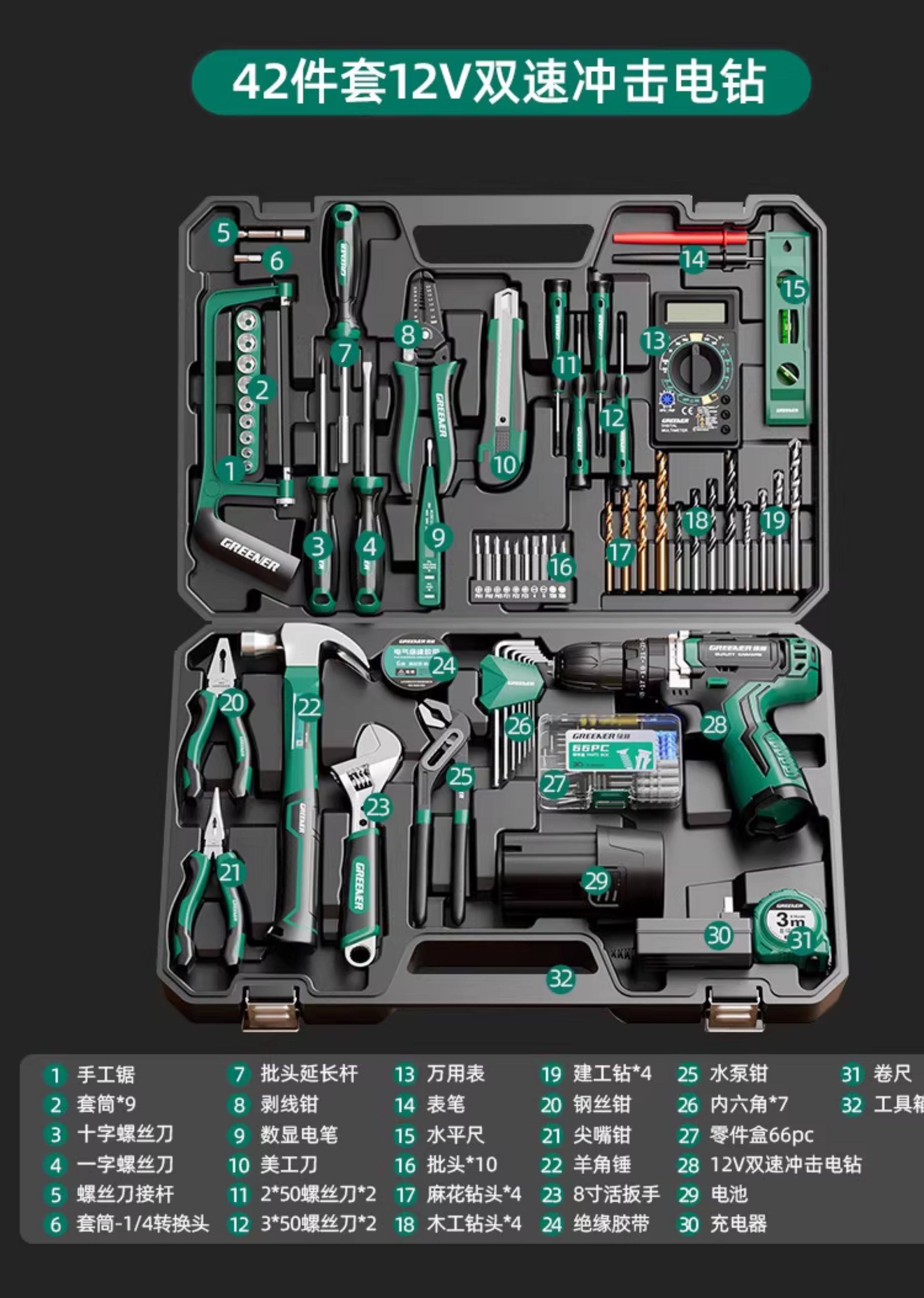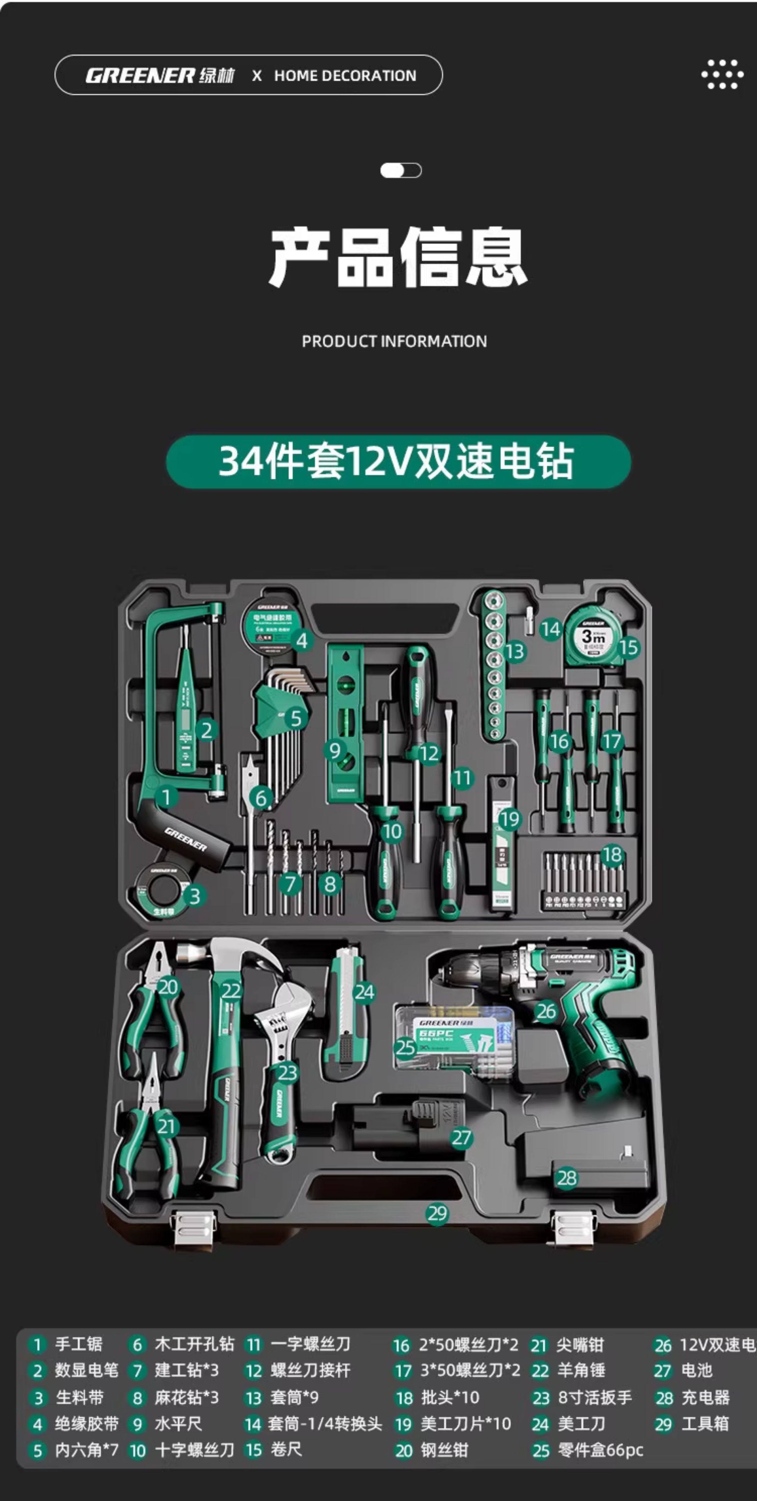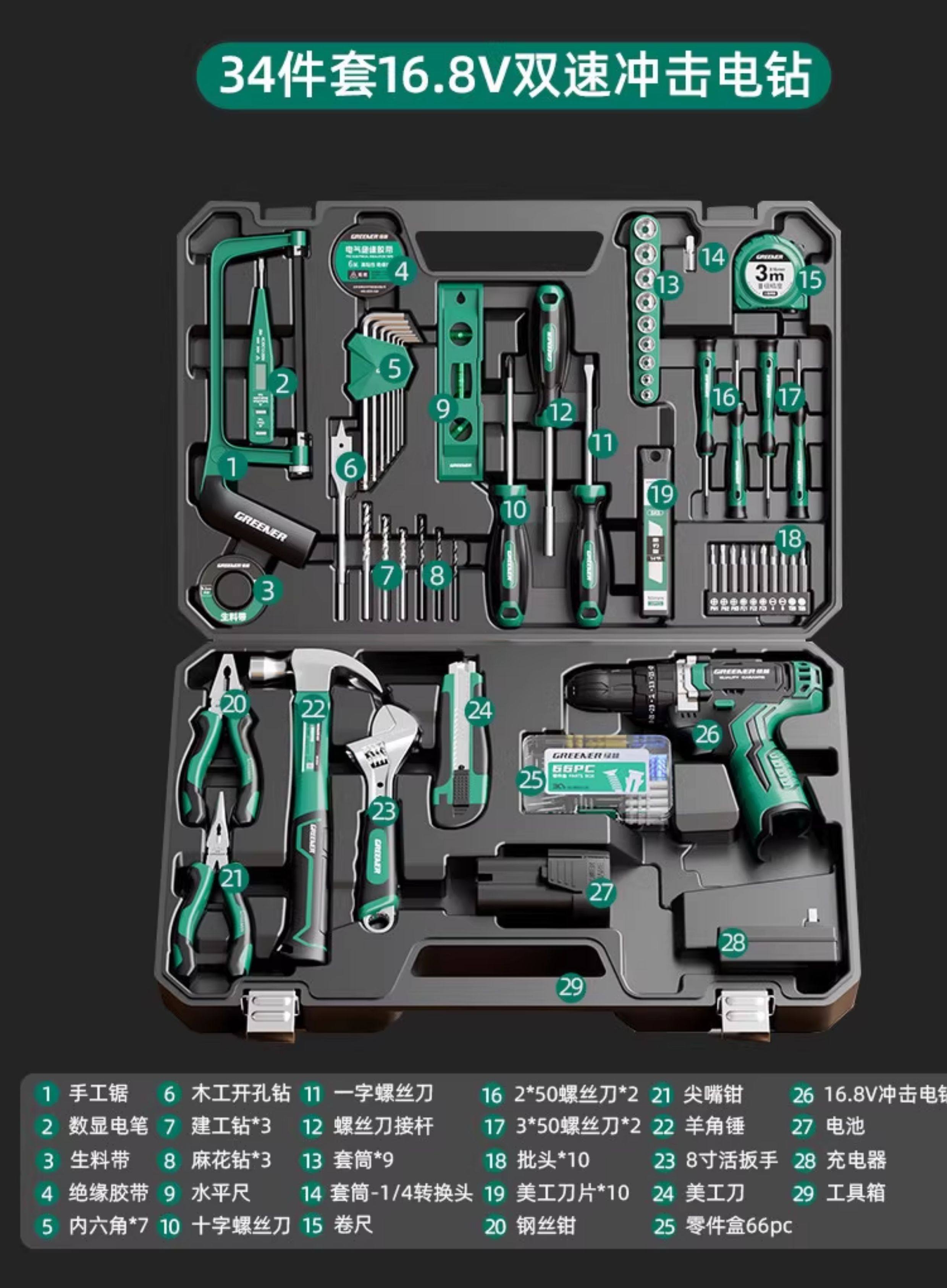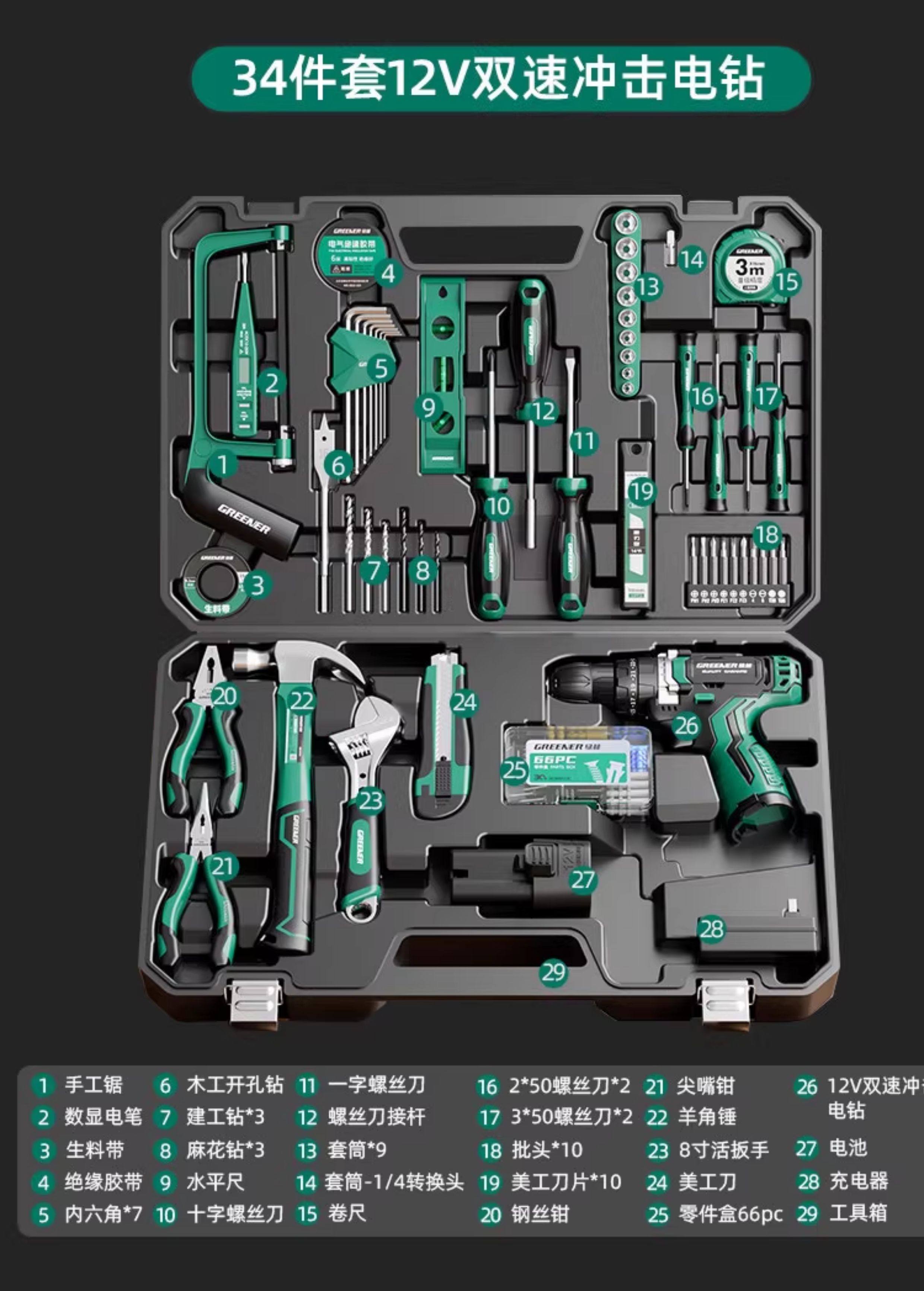 Color Classification 12V Dual-Speed Lithium Electric Drill-Professional 34-Piece Set,12V Impact Lithium Electric Drill-Professional 34-Piece Set,16.8V Impact Lithium Electric Drill-Professional 34-Piece Set,21V Impact Lithium Electric Drill-Professional 34-Piece Set,21V Brushless Impact Lithium Electric Drill-Practical 34-Piece Set,12V Dual-Speed Lithium Electric Drill-All-Round 42-Piece Set,12V Impact Lithium Electric Drill-All-Round 42-Piece Set,16.8V Impact Lithium Electric Drill-All-Round 42-Piece Set,21V Impact Lithium Electric Drill-All-Round 42-Piece Set,21V Brushless Impact Lithium Drill-Professional 42-Piece Set,【Includes Bit Set】12V Dual-Speed Professional 34-Piece Set,【Includes Bit Set】12V Impact Driver - Professional 34-Piece Kit,【Free Bit Set】16.8V Impact Driver - All-Purpose 42-Piece Kit,[Free Batch Set] 21V Brushless Impact-Professional 42-Piece Set,【Dual Battery, Extended Runtime】12V Dual-Speed Professional 34-Piece Set,【Dual Battery, Extended Runtime】21V Impact Driver - Professional 34-Piece Set,【Dual Battery, Extended Runtime】21V Impact Driver - All-In-One 42-Piece Set,【Dual Battery, Extended Runtime】21V Brushless Impact Driver - Professional 42-Piece Set,156-Piece Household Tool Set