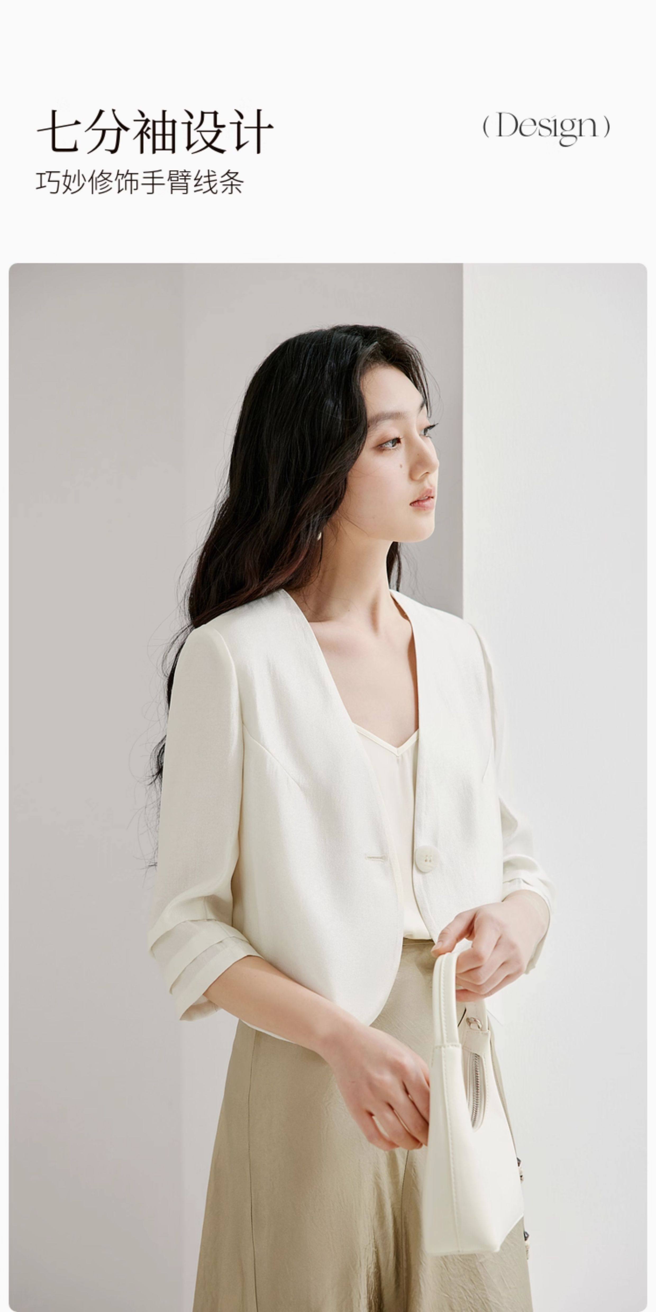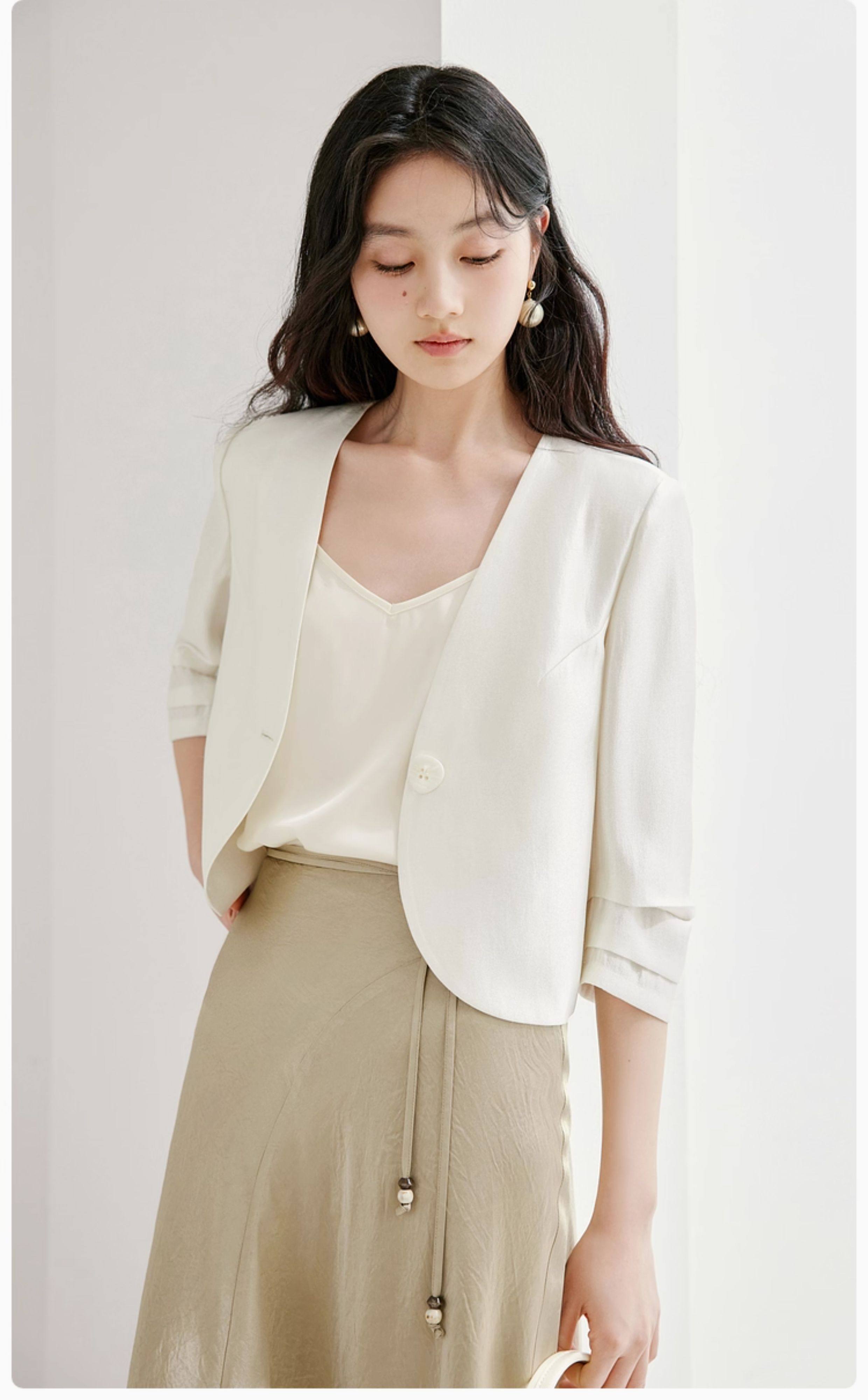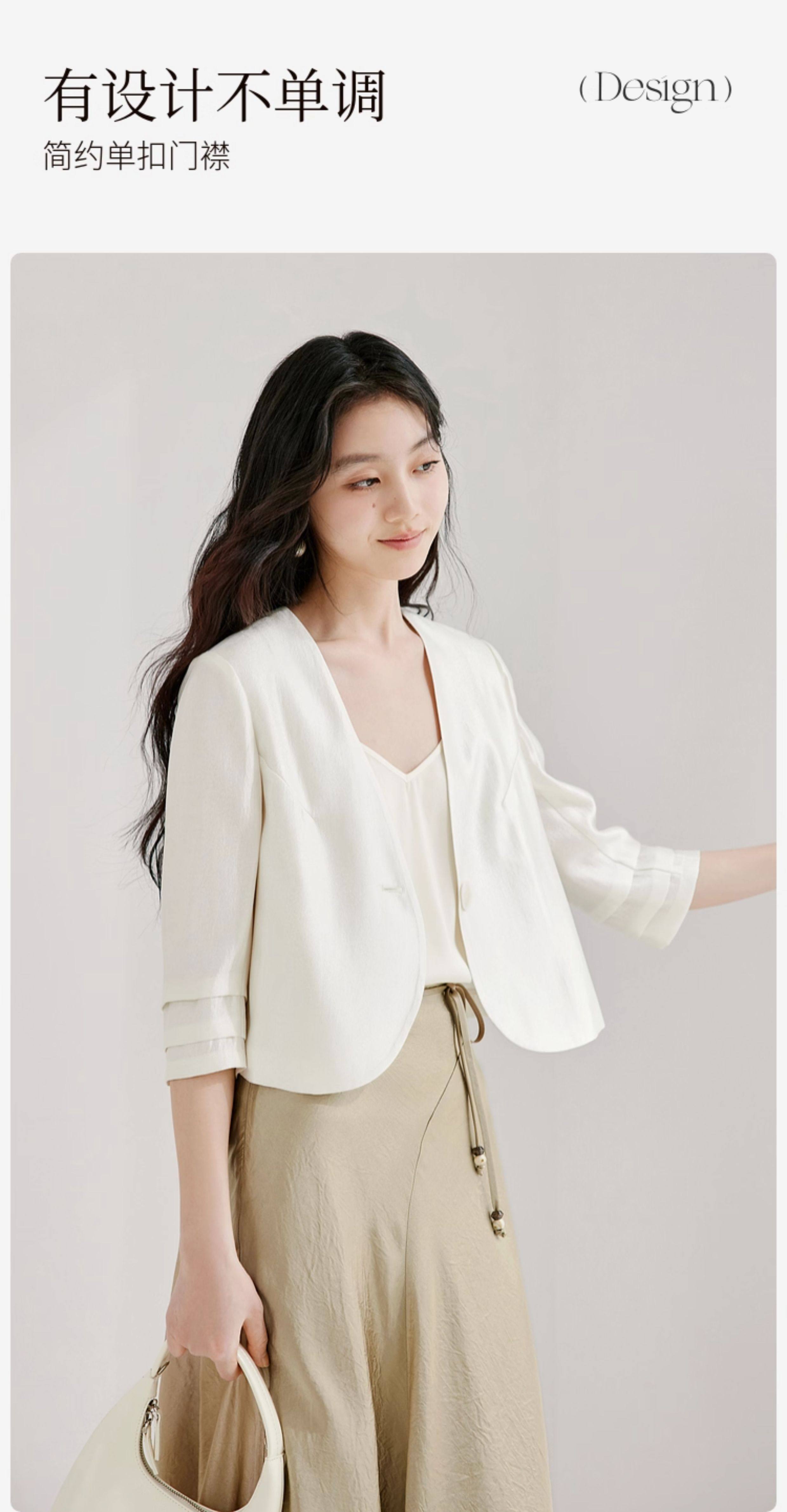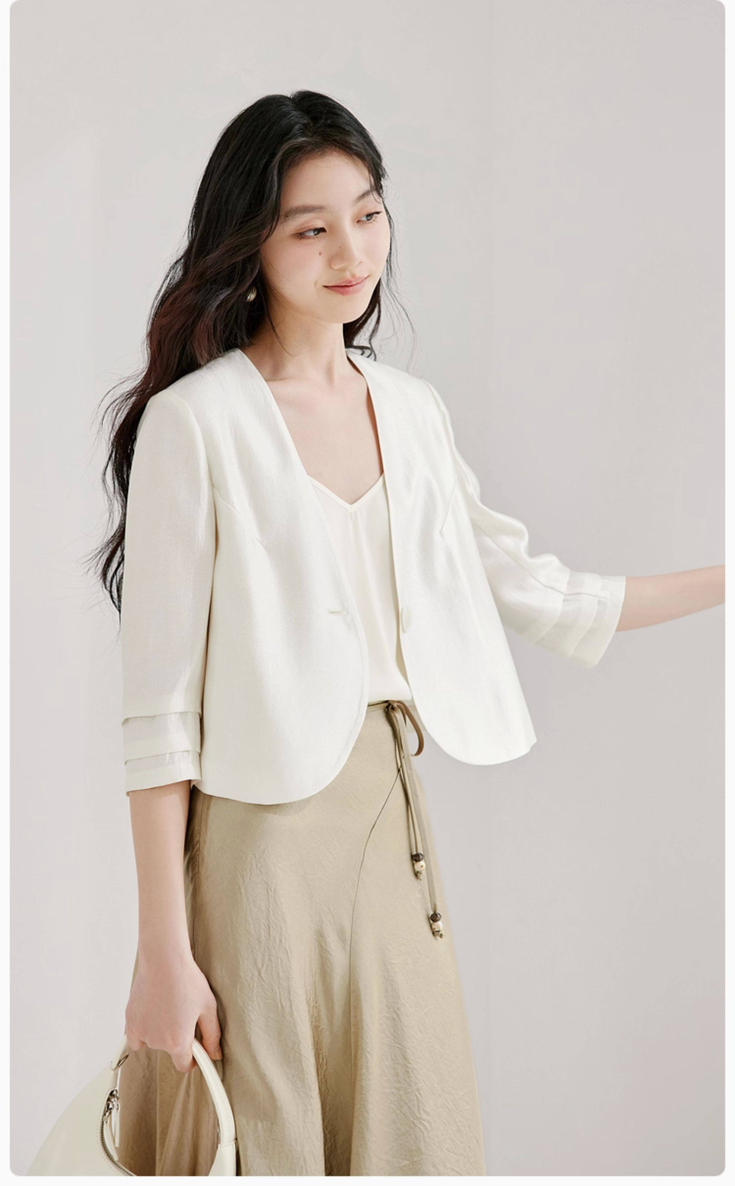 Xiangying, traje pequeño blanco, abrigo fino corto para mujer, primavera 2026, nuevo estilo antiguo de dinero, cinturón con tirantes y top de satén