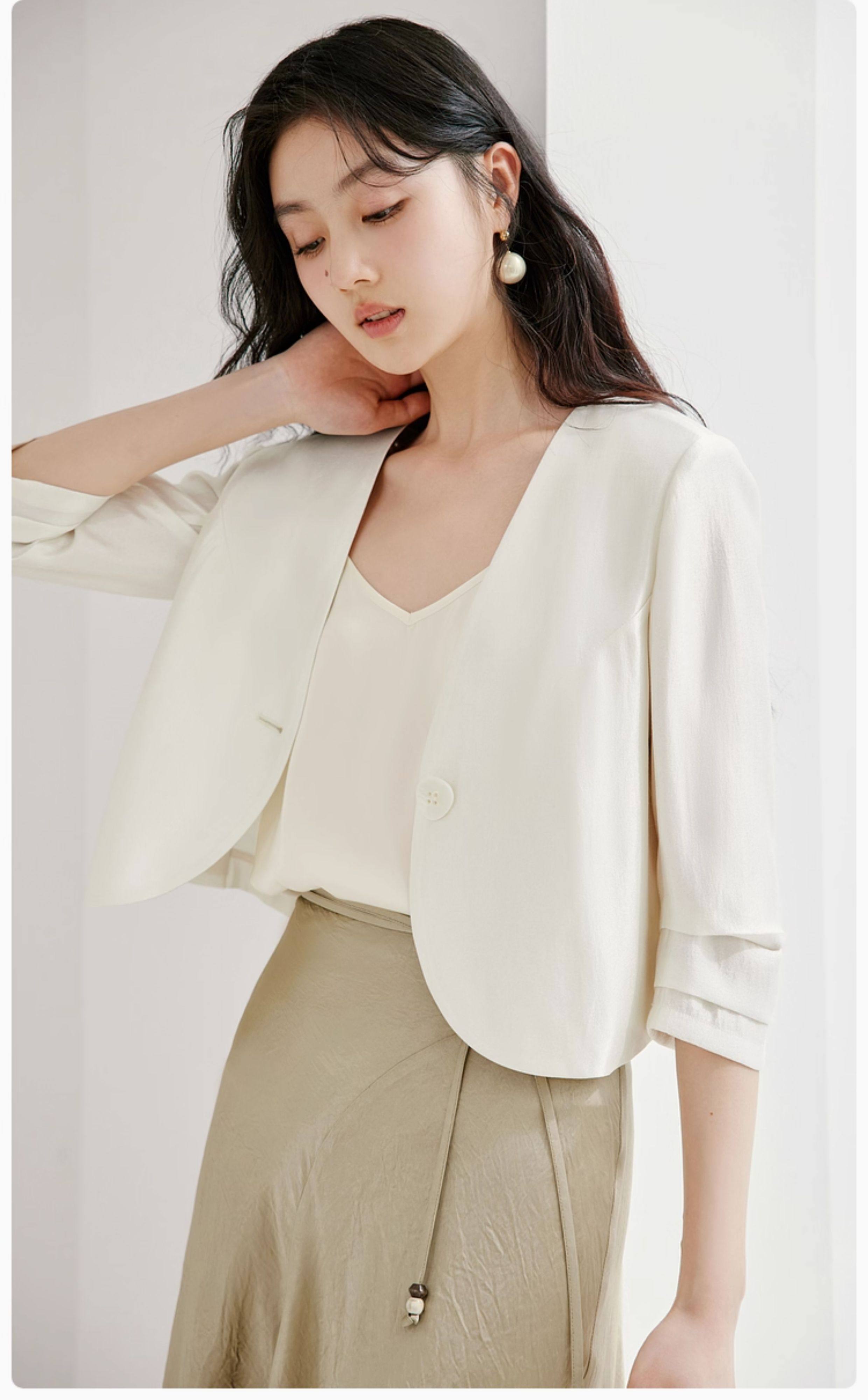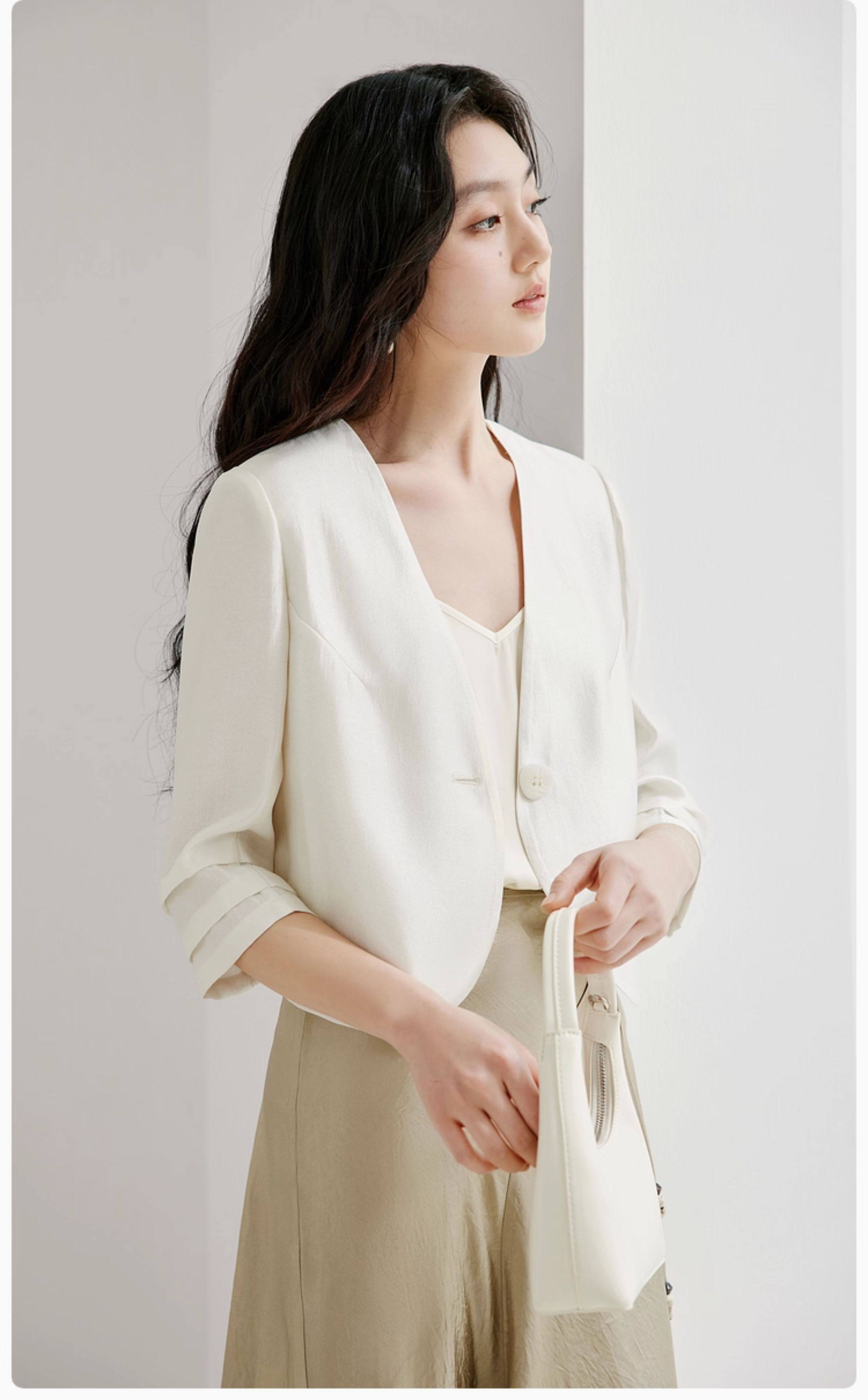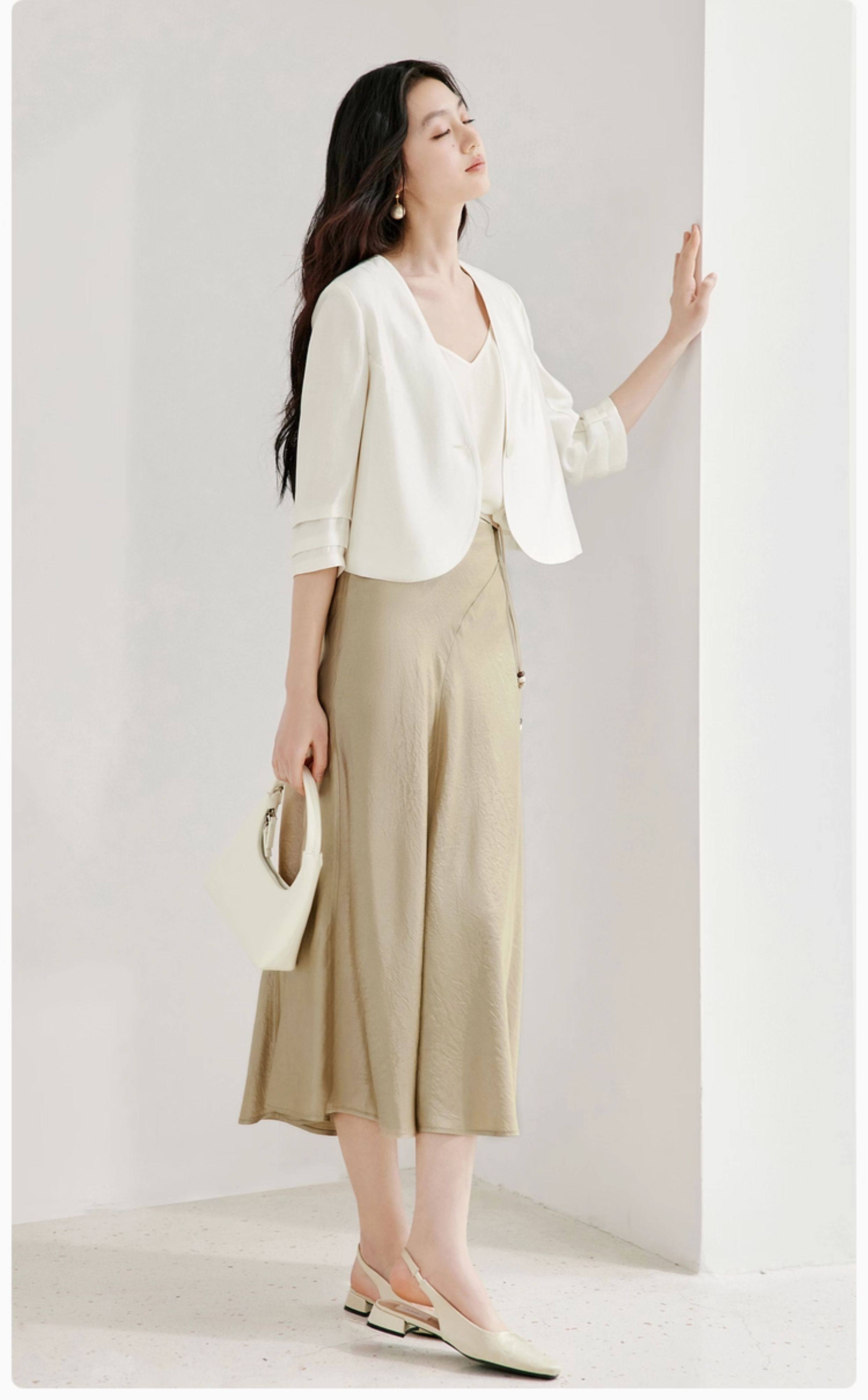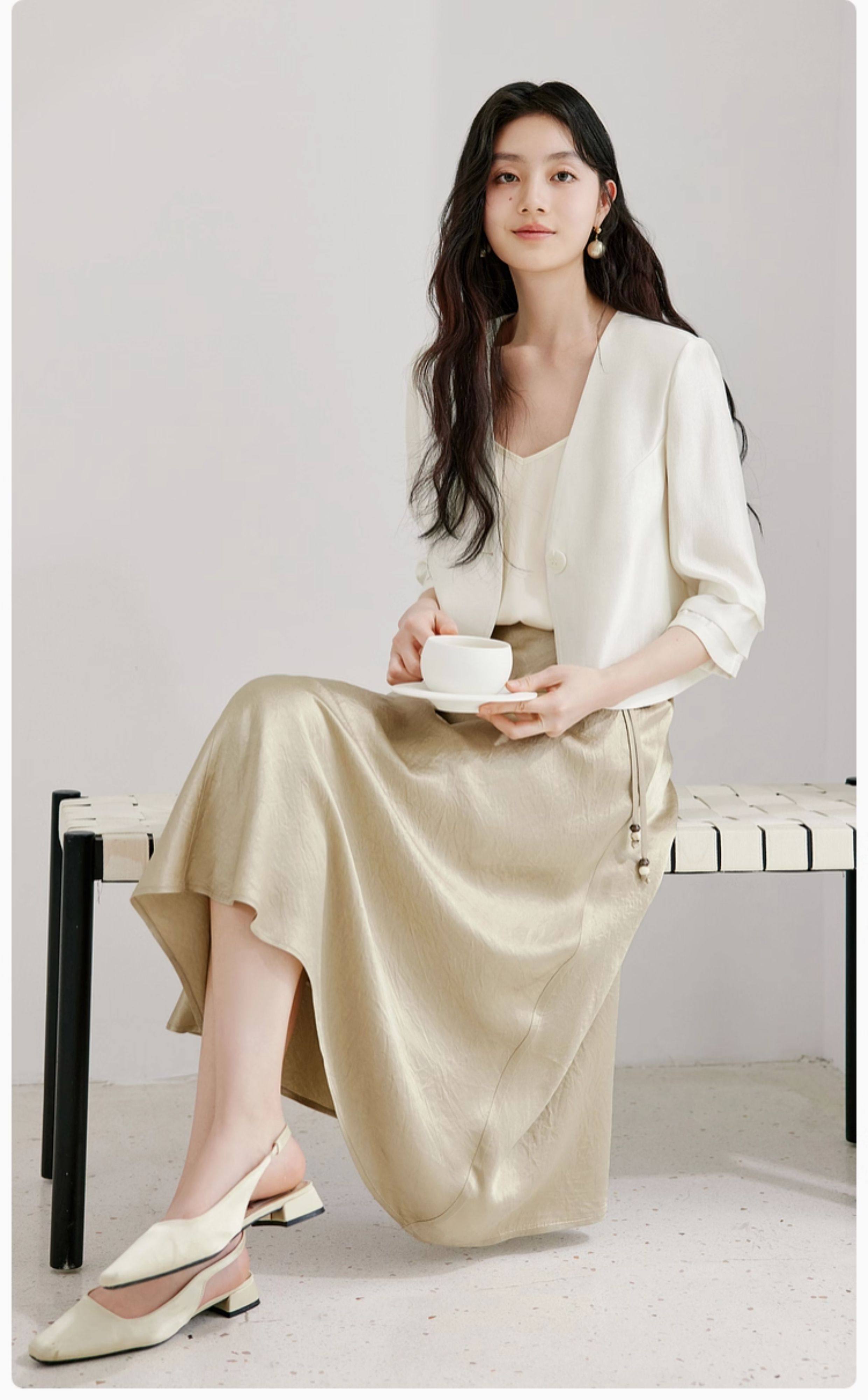 Xiangying, traje pequeño blanco, abrigo fino corto para mujer, primavera 2026, nuevo estilo antiguo de dinero, cinturón con tirantes y top de satén