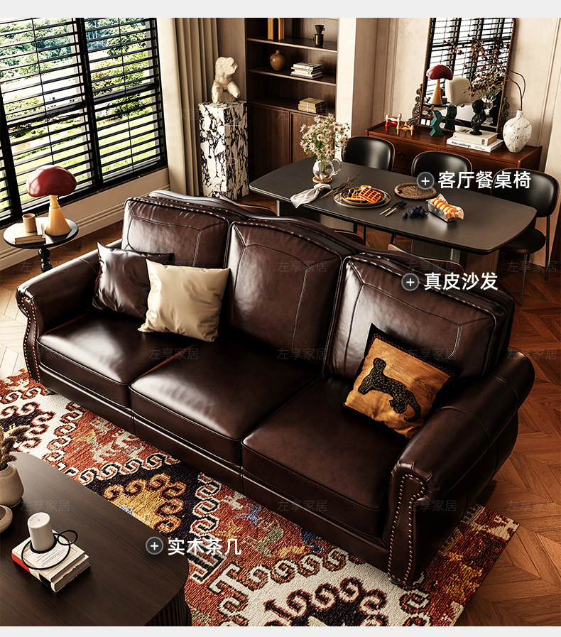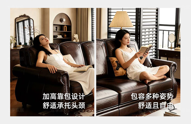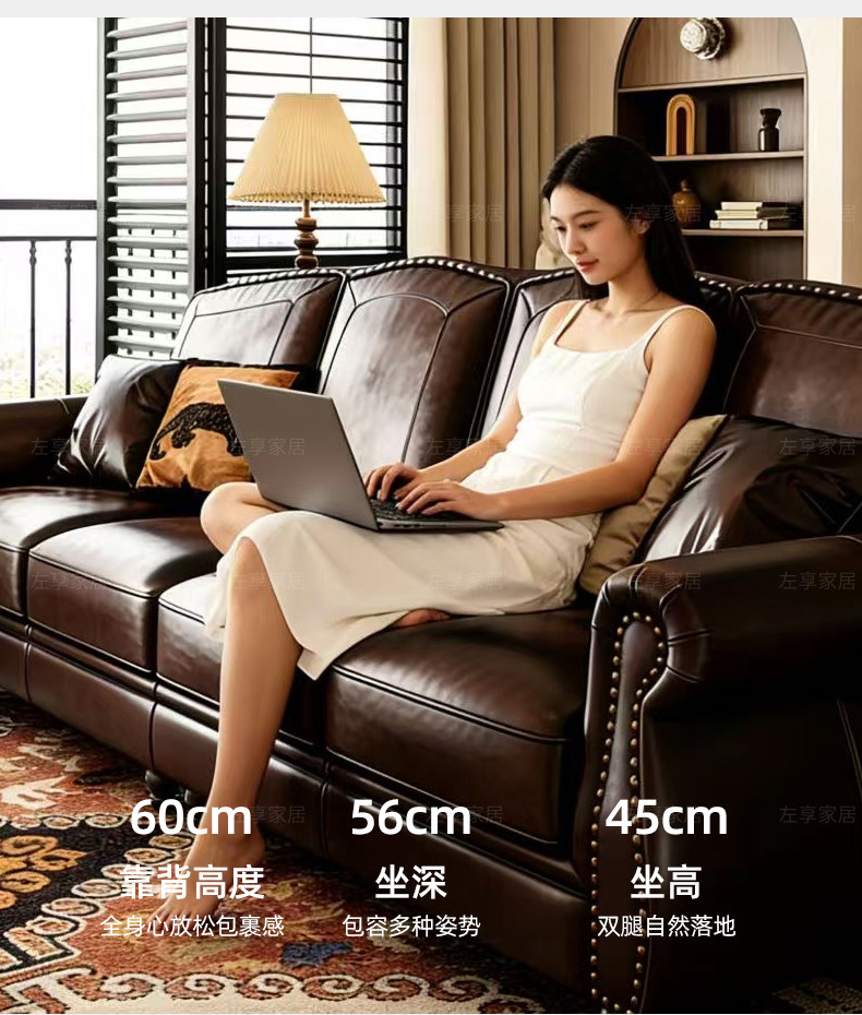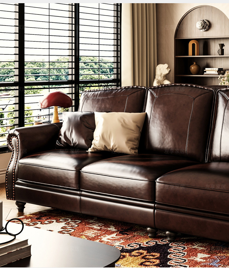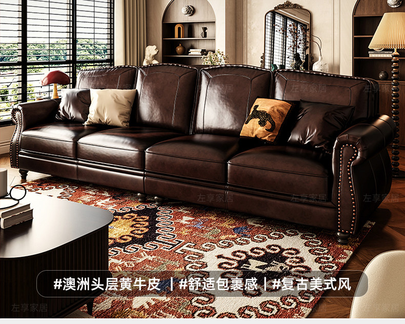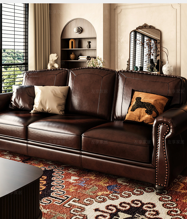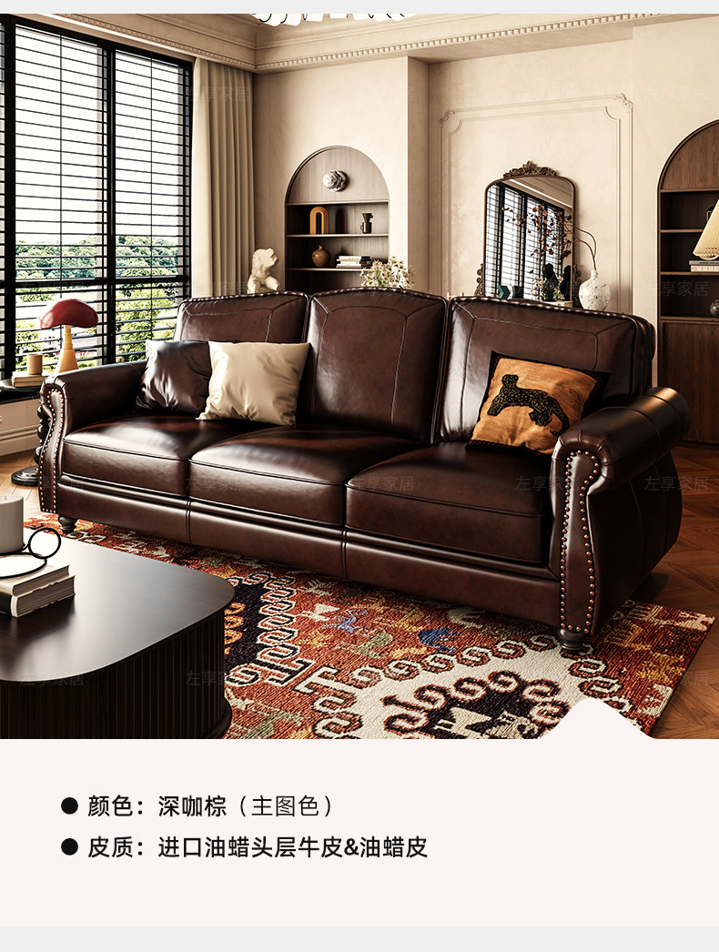 美式真皮沙发复古油蜡皮三人四人位客厅直排棕色高级感别墅家具