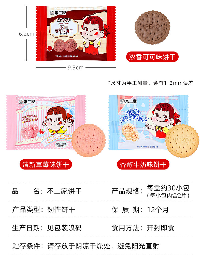 口味 香醇牛奶味饼干*1盒(约30小包),浓香可可味饼干*1盒(约30小包),清新草莓味饼干*1盒(约30小包),香醇牛奶味饼干*2盒,浓香可可味饼干*2盒,清新草莓味饼干*2盒,香醇牛奶味饼干*3盒,浓香可可味饼干*3盒,清新草莓味饼干*3盒,三口味各1盒,香醇牛奶味*1+浓香可可味*1,香醇牛奶味*1+清新草莓味*1,浓香可可味*1+清新草莓味*1,清新草莓味饼干*3盒【
