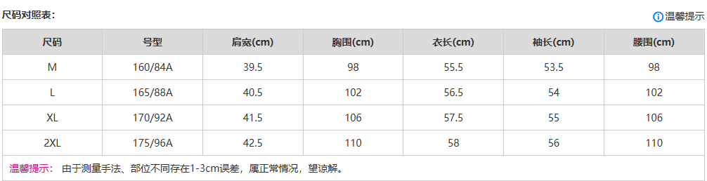 China (cm) 160-165/84-86 165-170 / 88-90 167-172 / 92-96 168-173 / 98-102 170-176 / 106-110