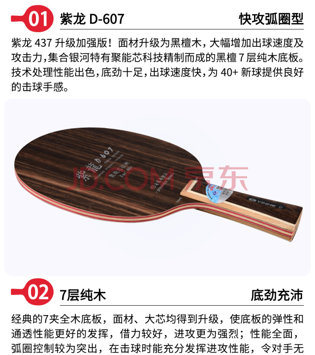 银河 乒乓球底板乒乓球拍横板横拍 紫龙D-607黑檀七 附拍套