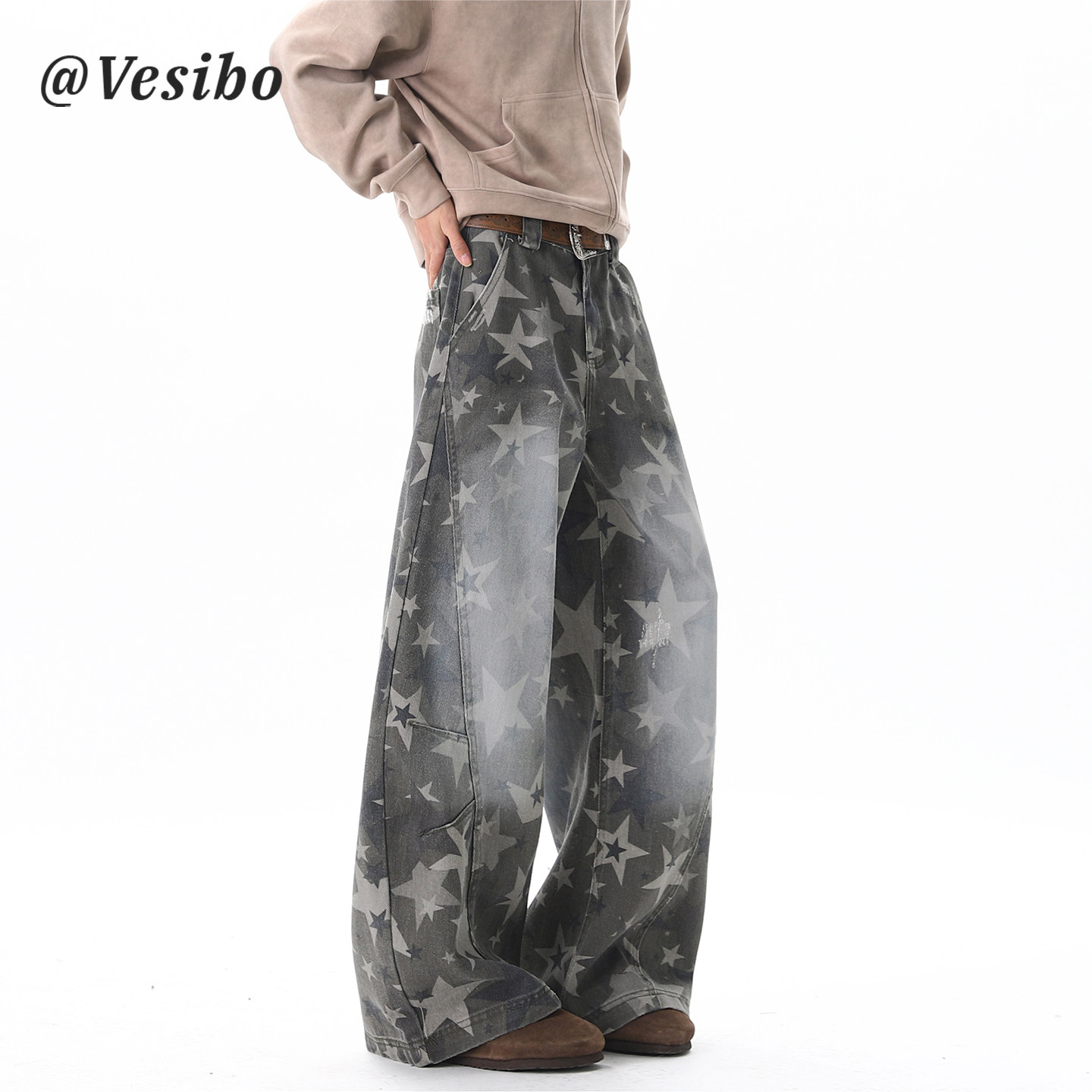 美式复古星星牛仔裤男春季高街hiphop阔腿弯刀裤潮牌做旧拖地裤子