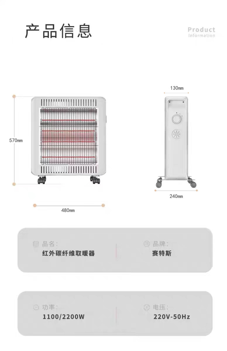 赛特斯碳纤维电暖器家用烤火小太阳浴室婴儿洗澡防水碳素管取暖器
