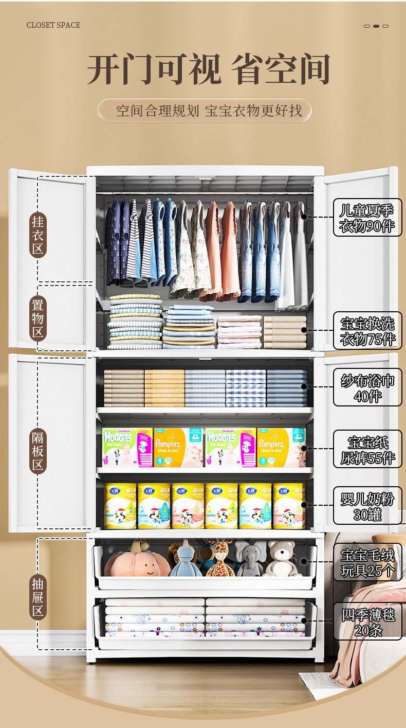 Armario de bebé extra grande de 80 de ancho, armario de almacenamiento para el hogar, dormitorio, armario de ropa, armario de almacenamiento de plástico, ropa colgante, armario para niños