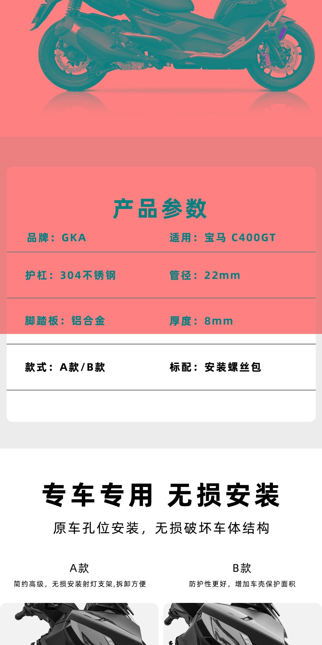 Sort by color GKA-Flagship thickened A-type front and rear bumpers + front and rear pedals, matte black (comes with spotlight bracket), exclusive for BMW C400GT),GKA-Flagship thickened A-type front and rear bumpers + front and rear pedals, matte silver (comes with spotlight bracket), exclusive for BMW C400GT),Highly recommended GKA flagship thickened B-type front and rear bumpers + front and rear pedals, matte black, exclusive for BMW C400GT),Highly recommended GKA flagship thickened B-type front and rear bumpers + front and rear pedals, matte silver, exclusive for BMW C400GT),GKA-BMW C400X special matte black stainless steel guardrail + aluminum alloy pedals),GKA-BMW C400X special frosted silver stainless steel guardrail + aluminum alloy pedal)