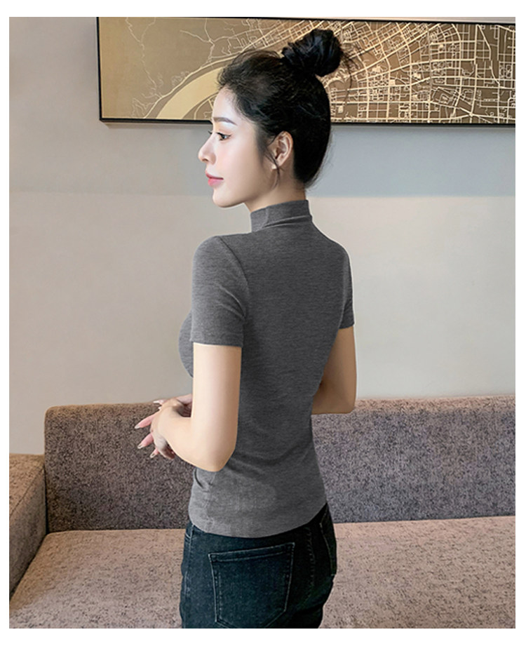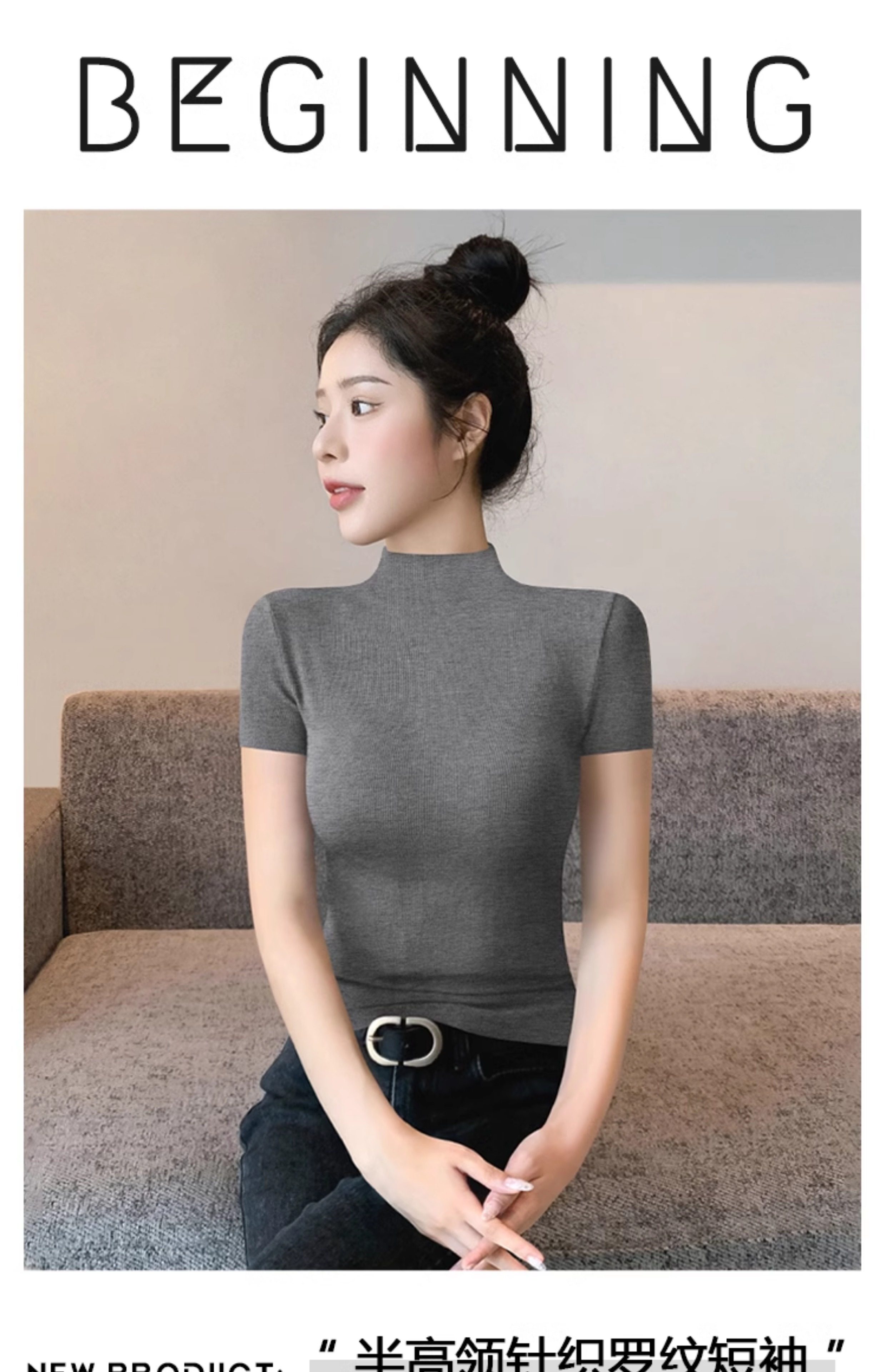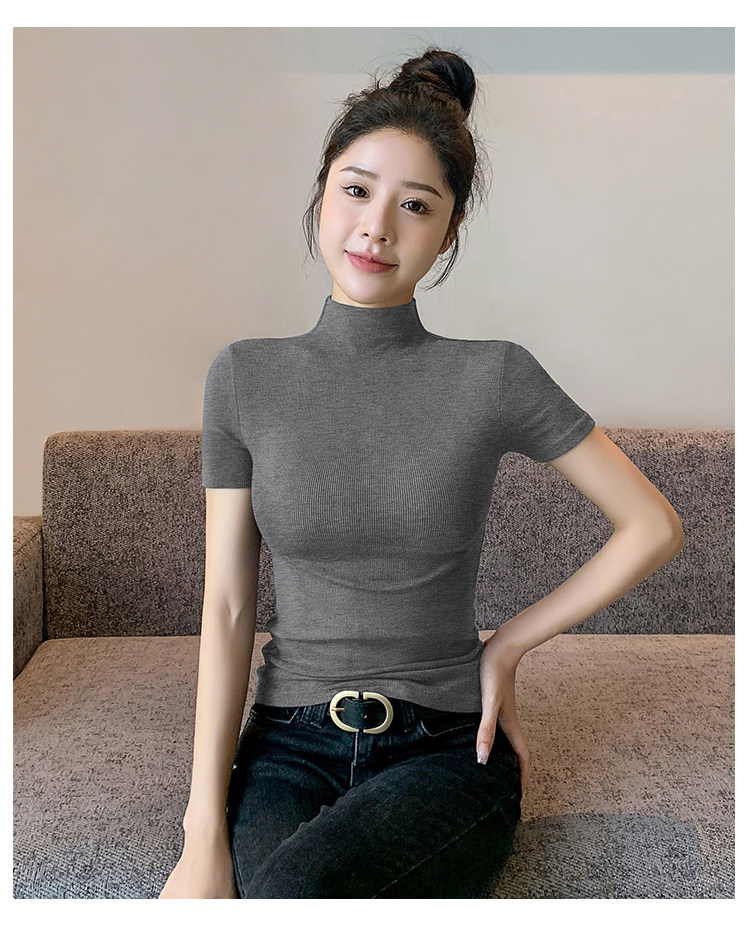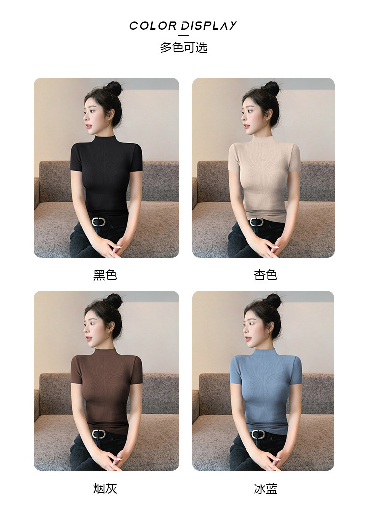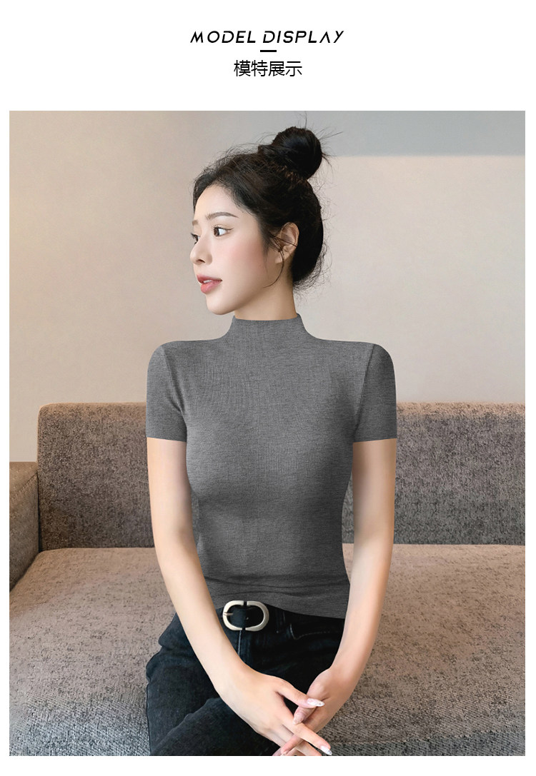 Kurzarm-T-Shirt mit halbem Rollkragen für Damen, Sommer 2026, neuer Stil, schmale rechte Schulter, mit gestricktem schwarzem Oberteil aus Eisseide