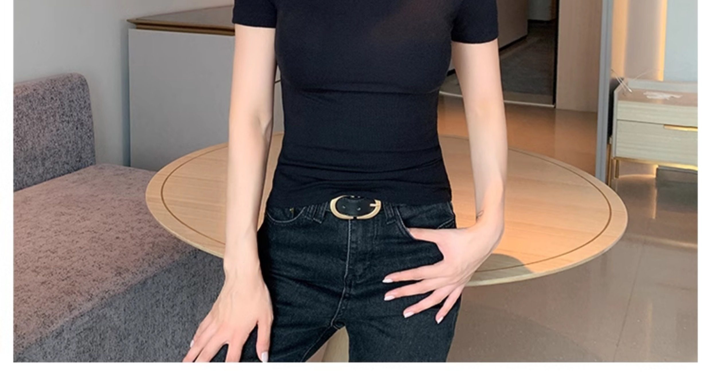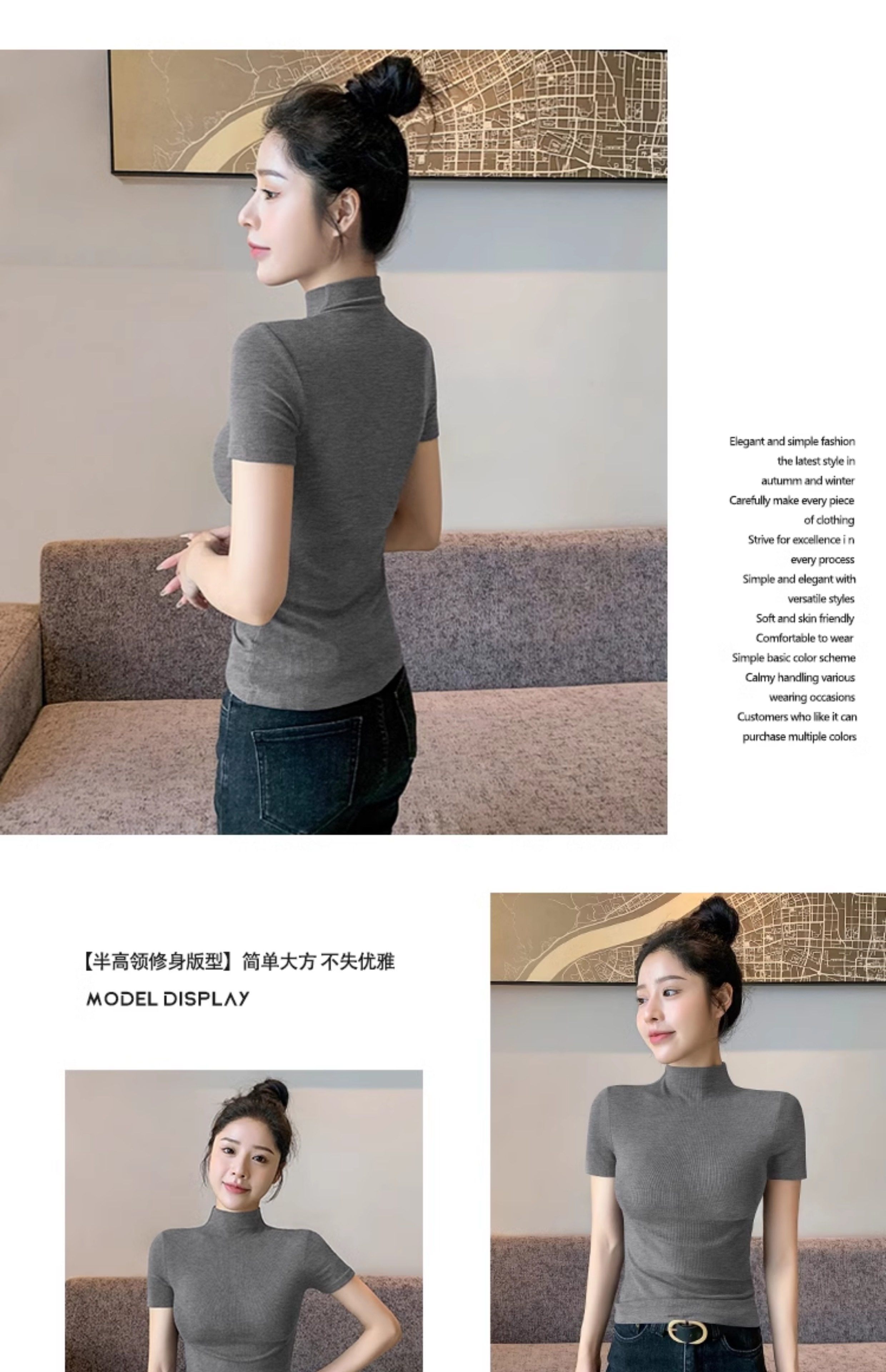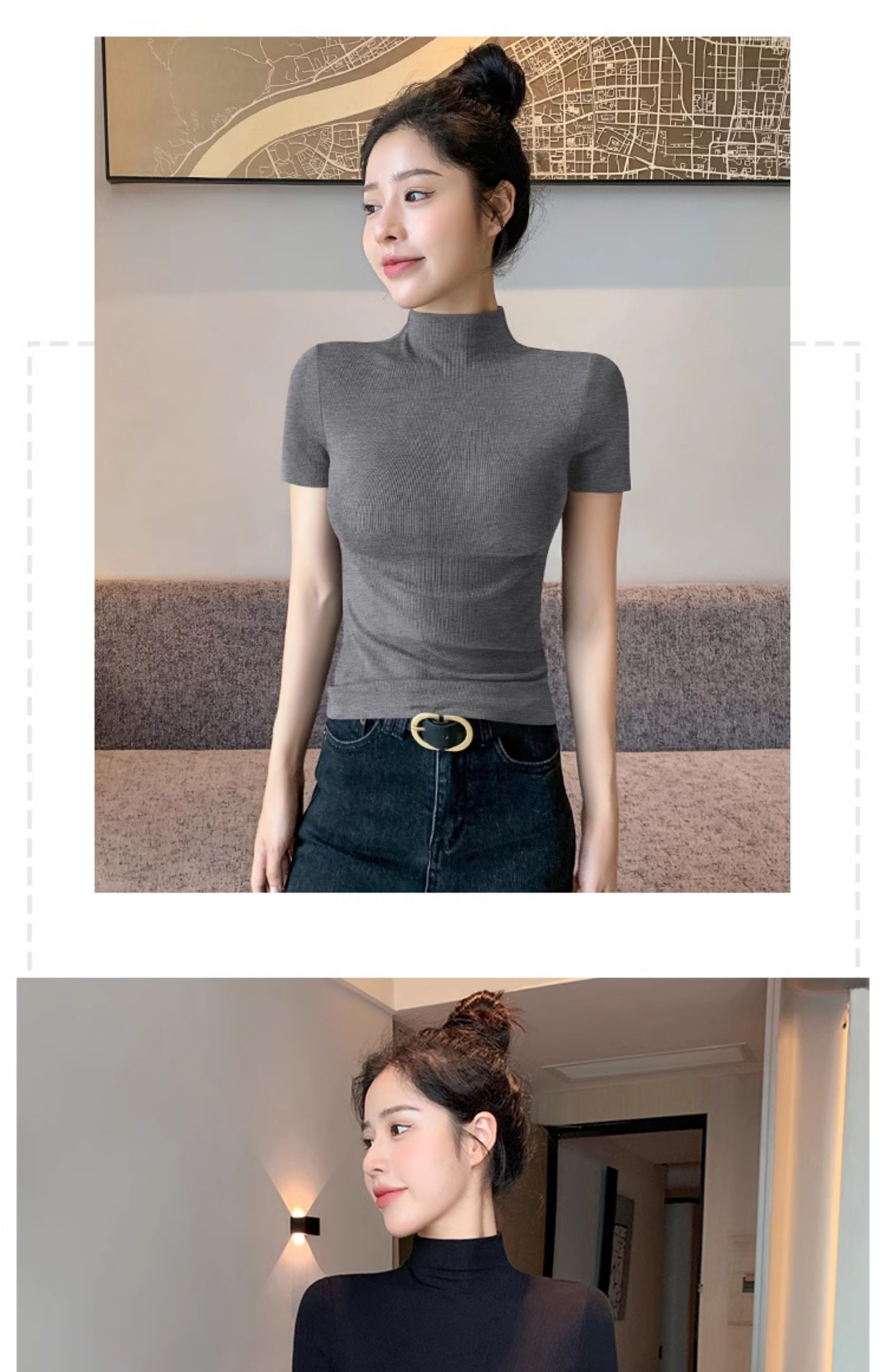 Kurzarm-T-Shirt mit halbem Rollkragen für Damen, Sommer 2026, neuer Stil, schmale rechte Schulter, mit gestricktem schwarzem Oberteil aus Eisseide