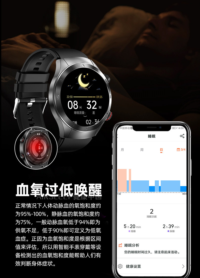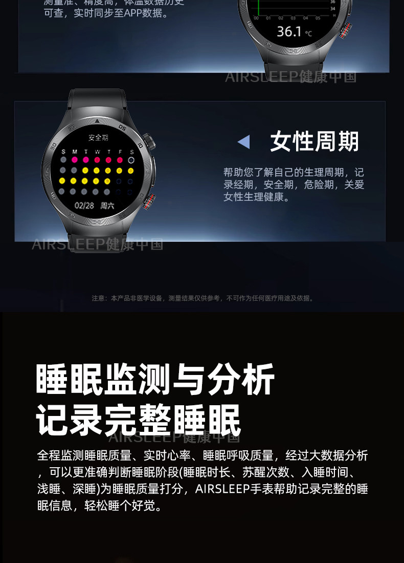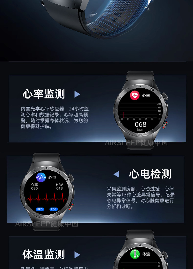 功能 运动追踪,遥控自拍,蓝牙,计步,影音娱乐,健康监测,久坐提醒,社交娱乐,一键求救,防水,血压监测,体温,蓝牙通话,信息推送,心率监测,血氧检测,智能提醒,睡眠监测,智能问答,手表功能
