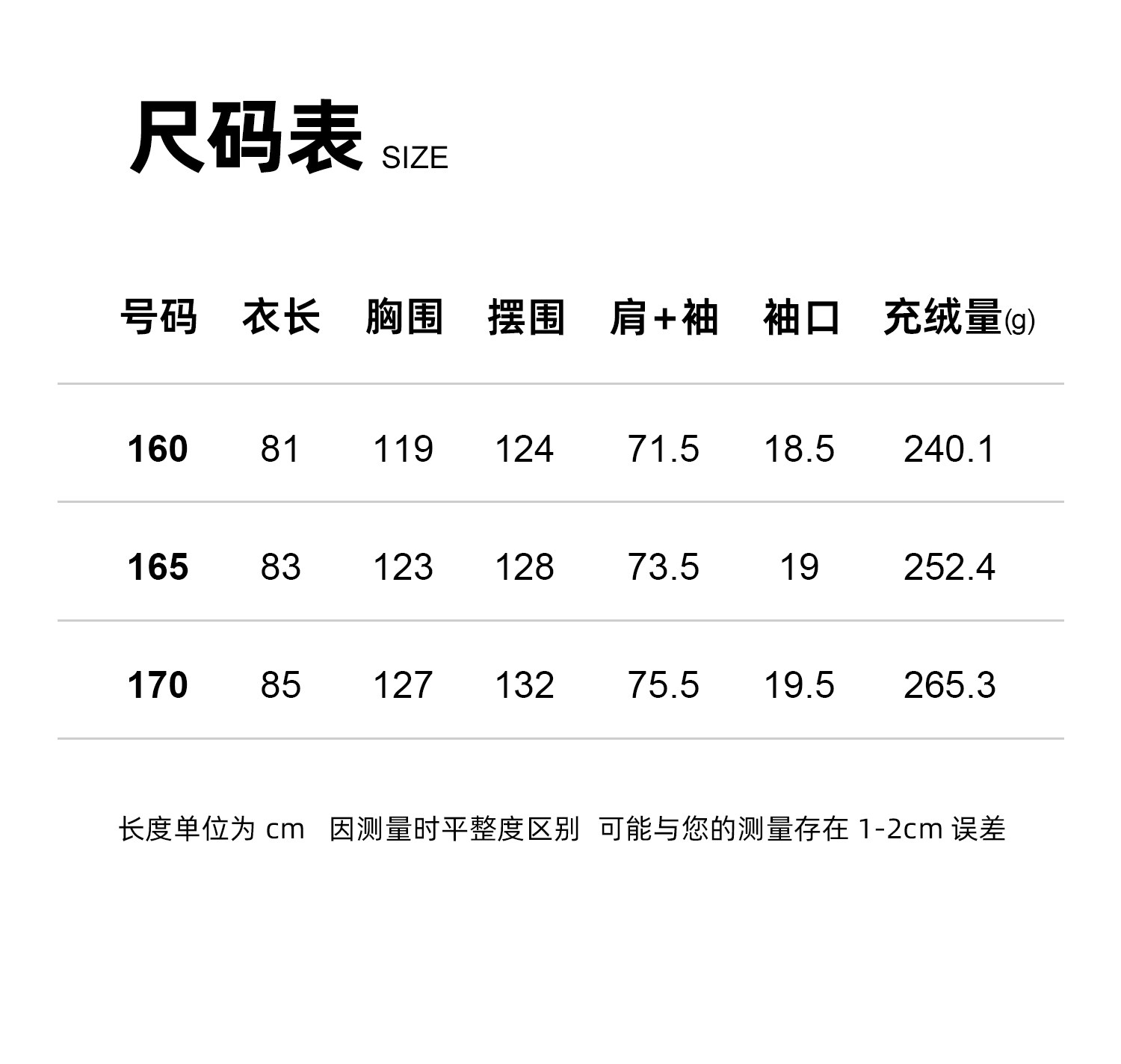 充绒量(g) 240.1-265.3g