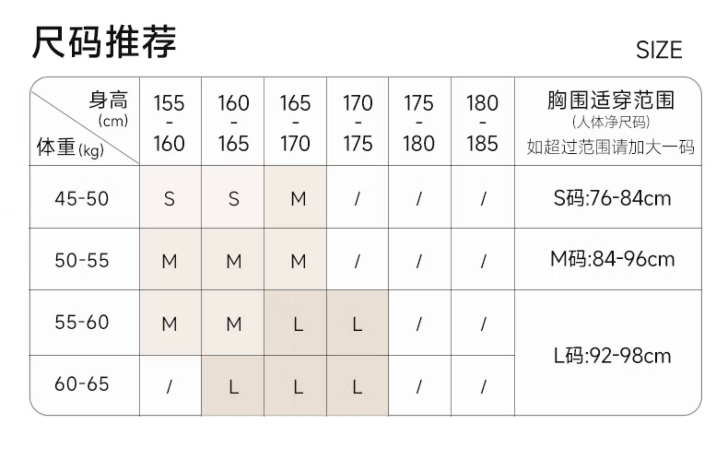 China (cm) 160-165/84-86 165-170 / 88-90 167-172 / 92-96 168-173 / 98-102 170-176 / 106-110