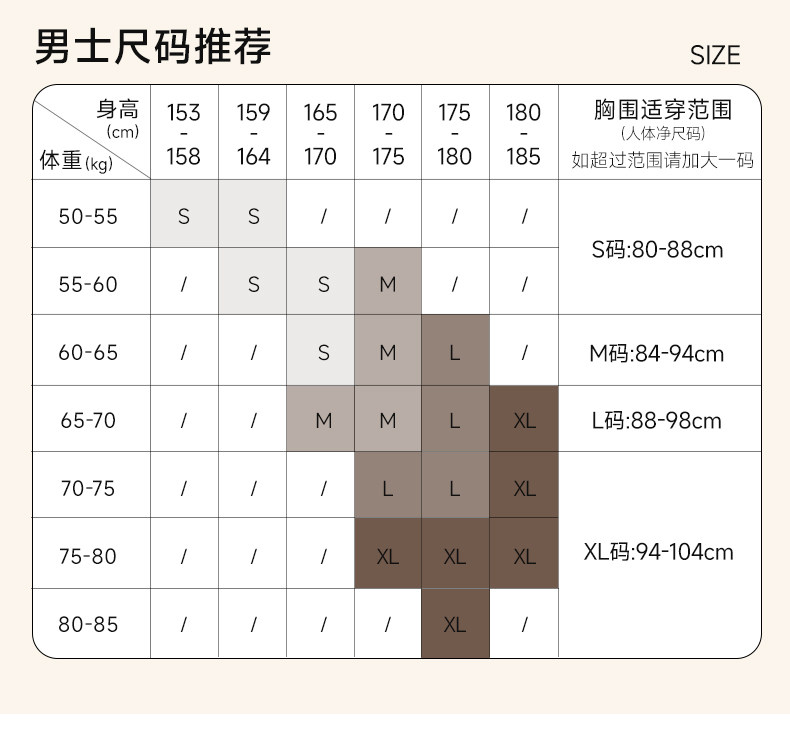 China (cm) 160-165/84-86 165-170 / 88-90 167-172 / 92-96 168-173 / 98-102 170-176 / 106-110