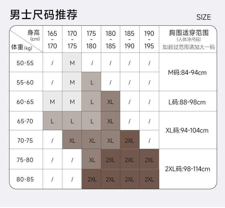 China (cm) 160-165/84-86 165-170 / 88-90 167-172 / 92-96 168-173 / 98-102 170-176 / 106-110