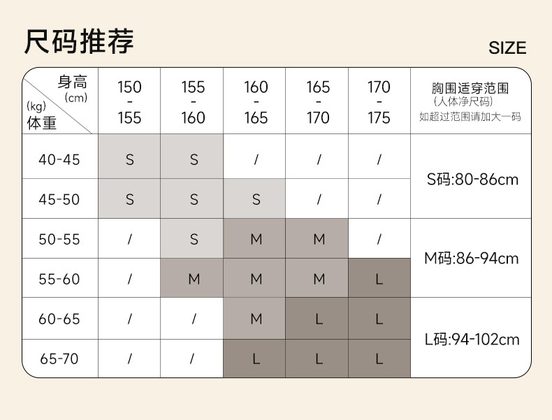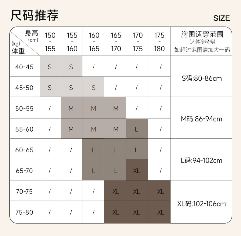 China (cm) 160-165/84-86 165-170 / 88-90 167-172 / 92-96 168-173 / 98-102 170-176 / 106-110