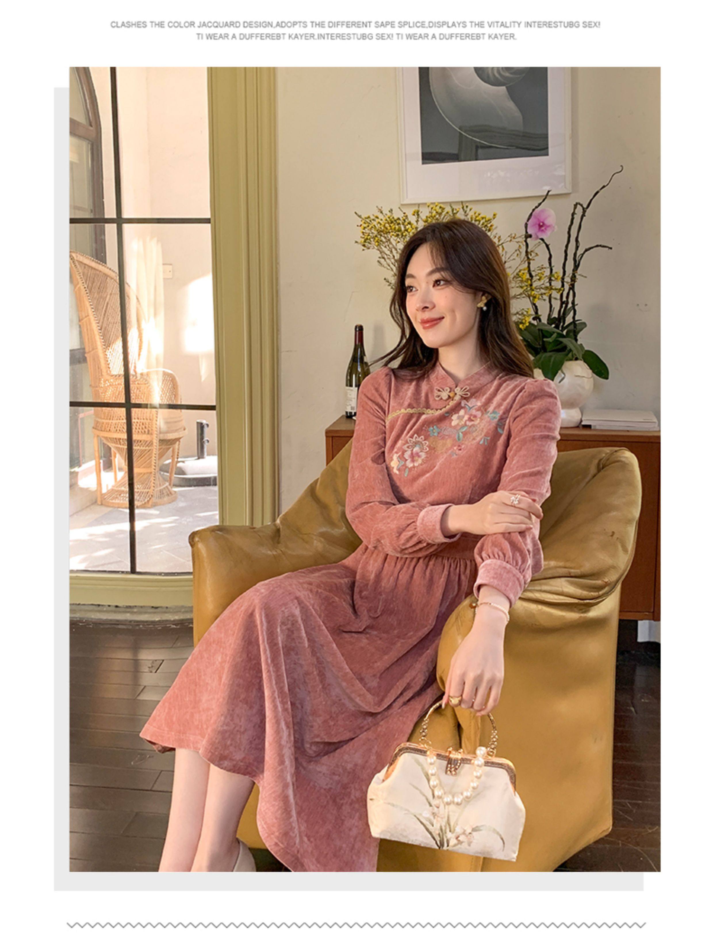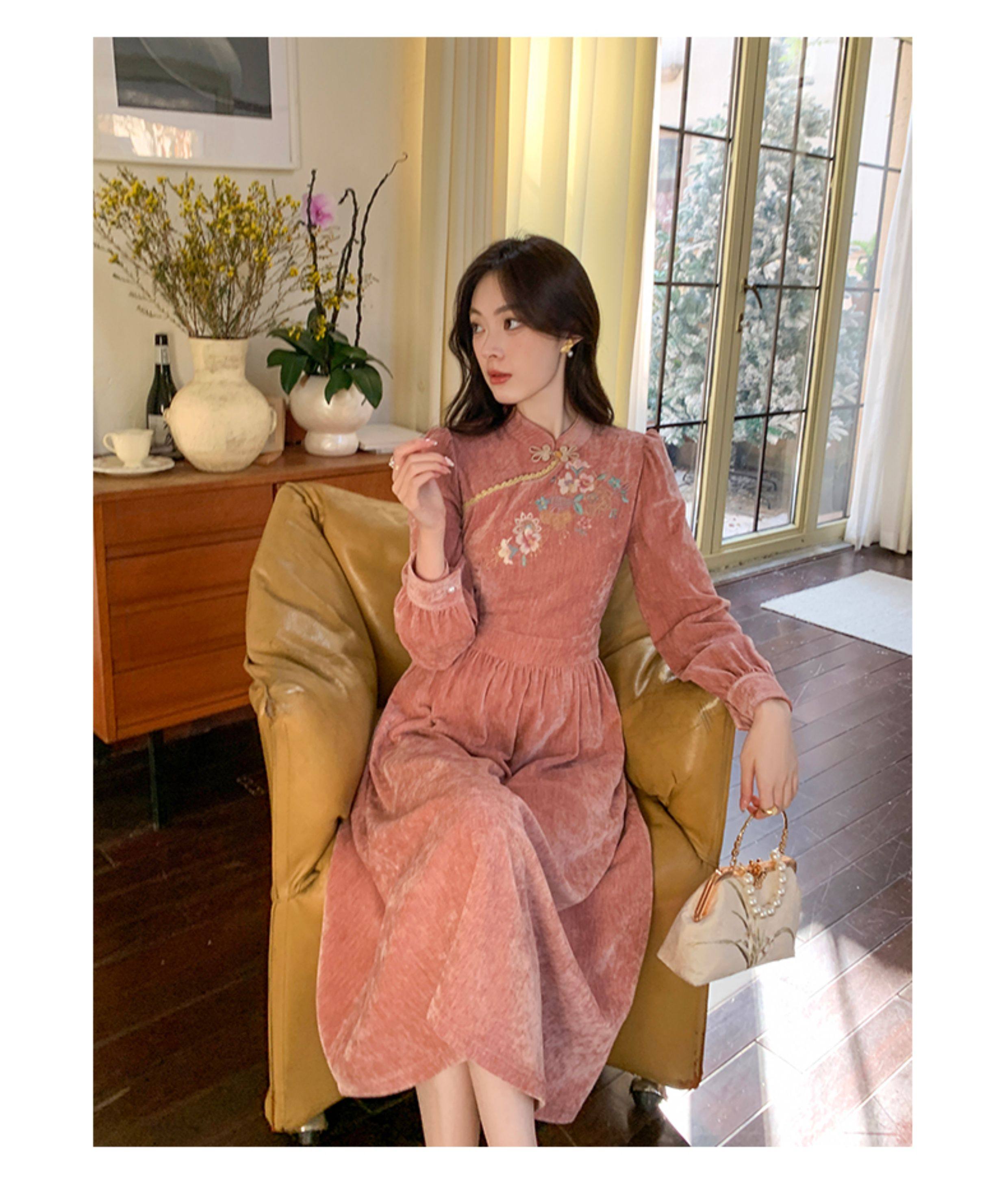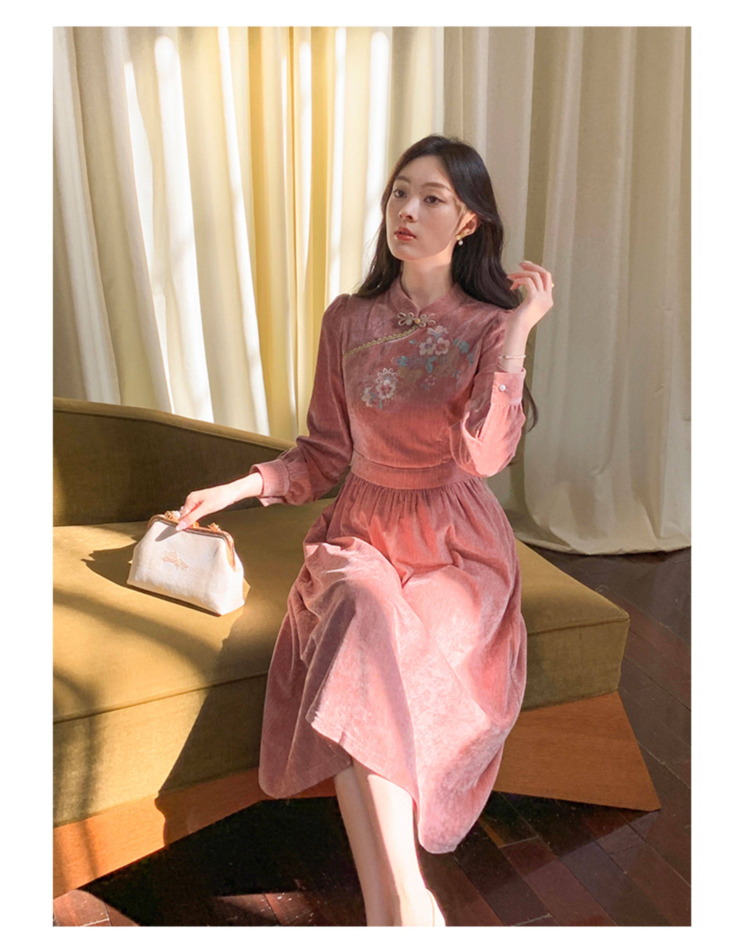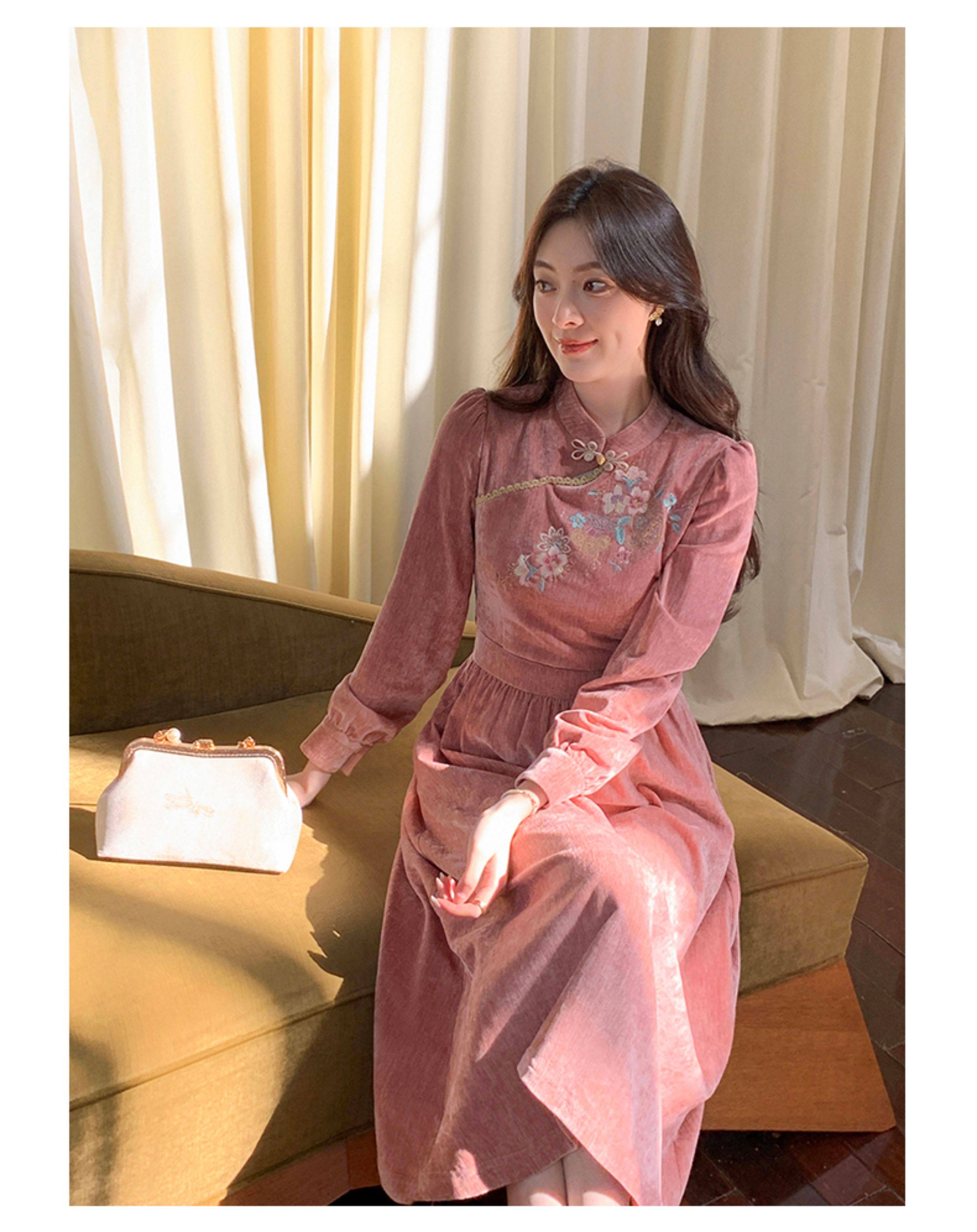 GERTCOREL2025新款冬季原创新中式刺绣浅粉色减龄丝绒连衣裙女装