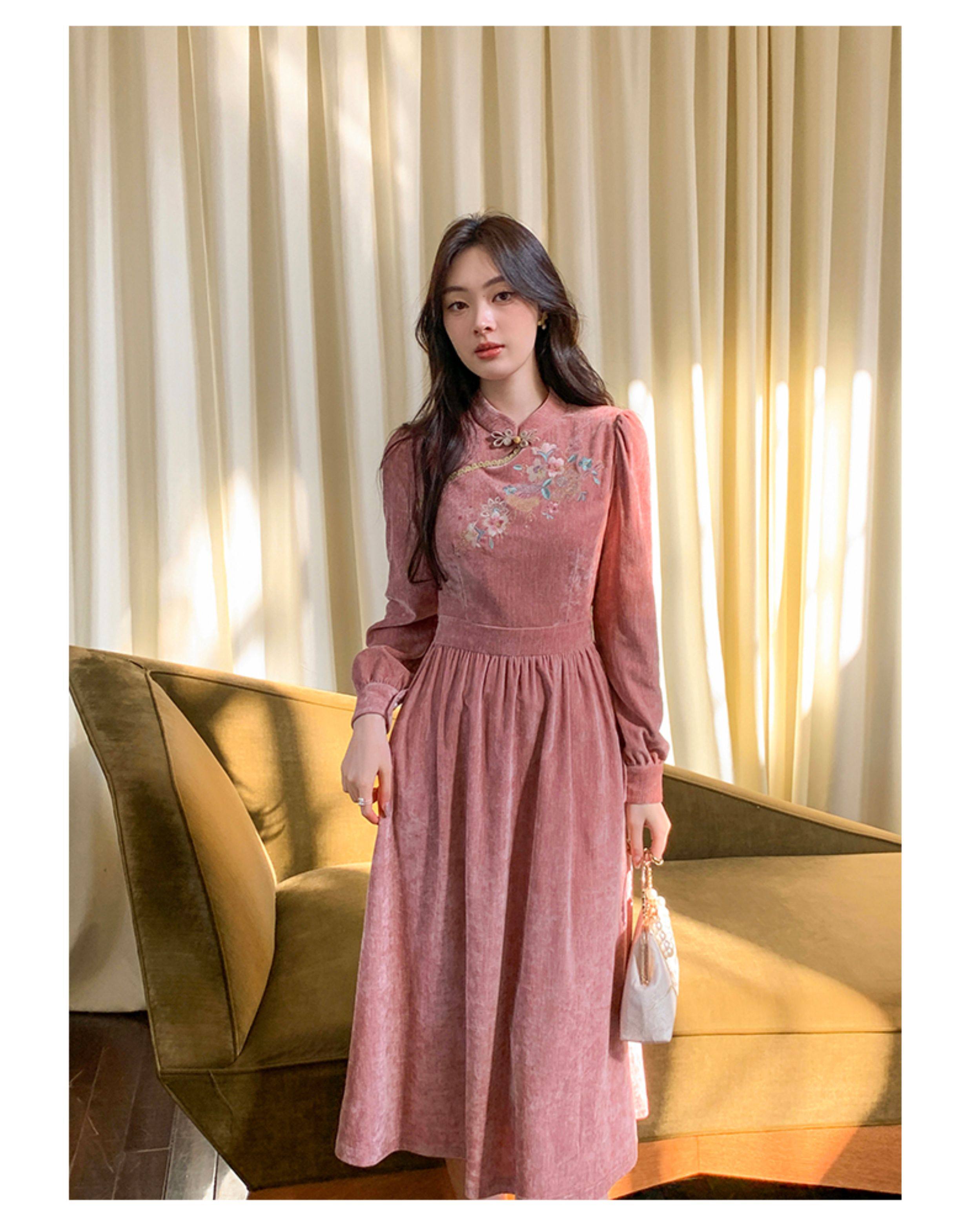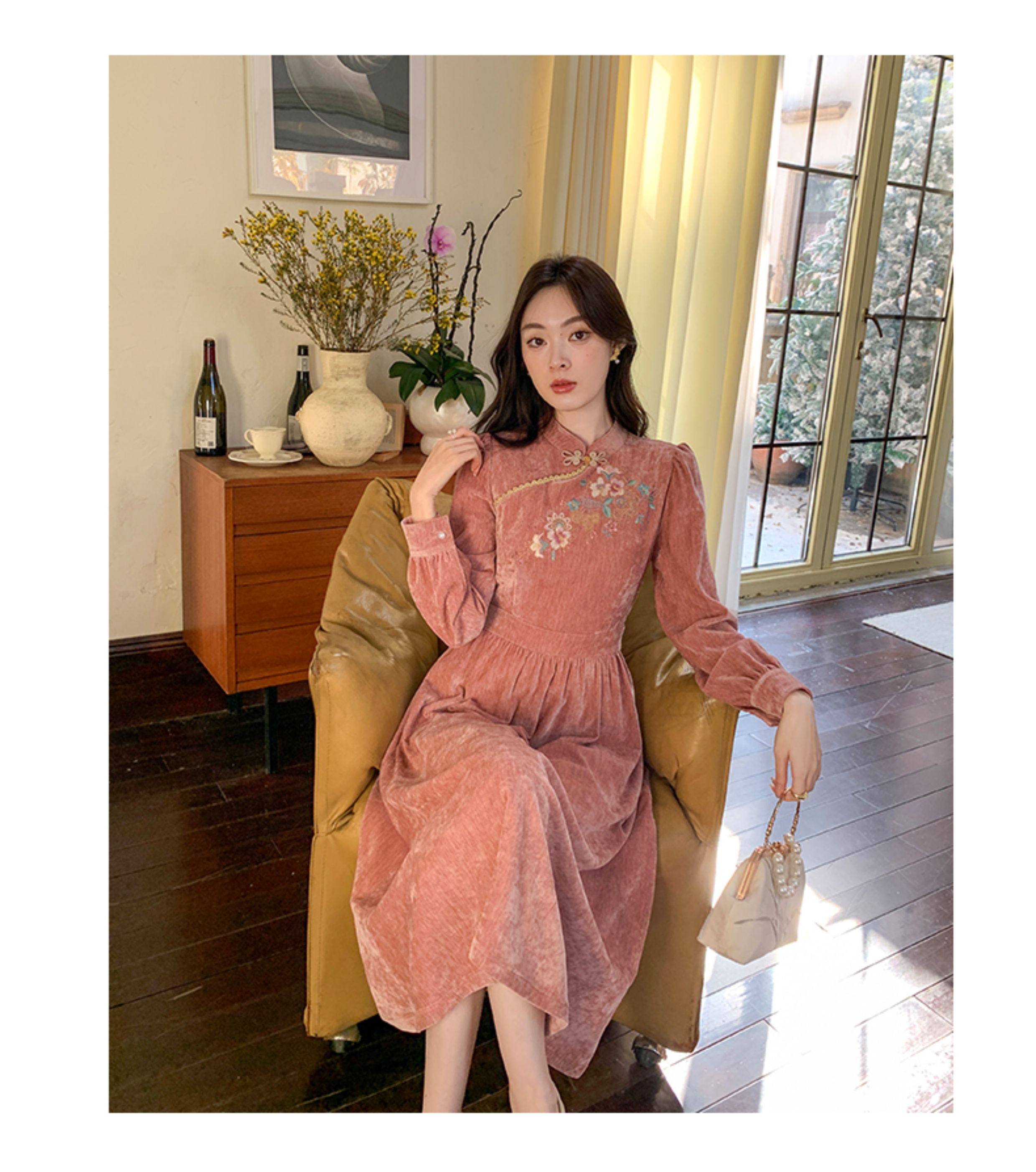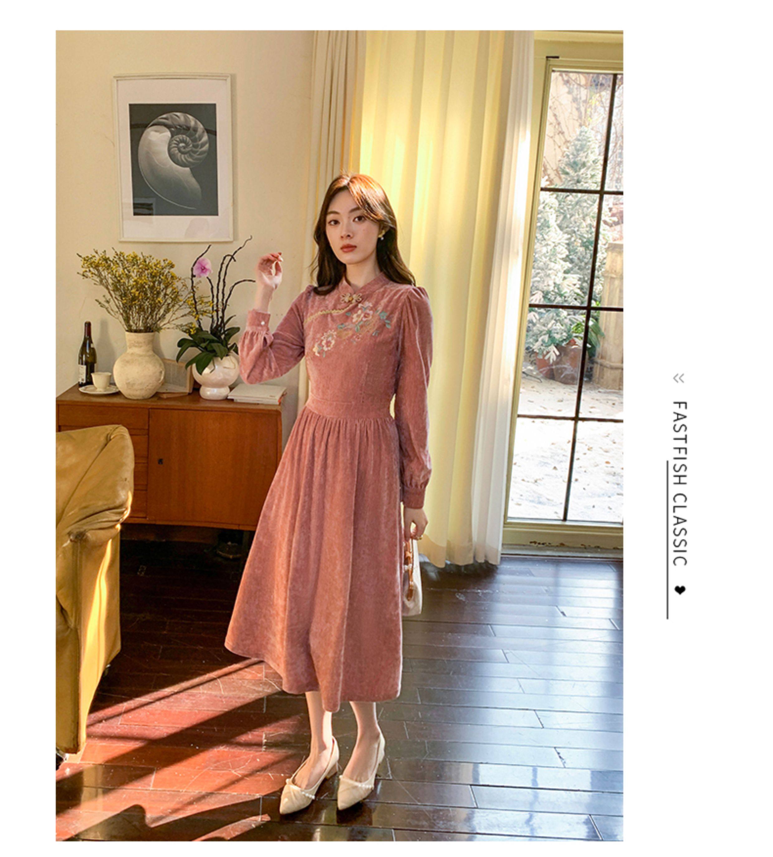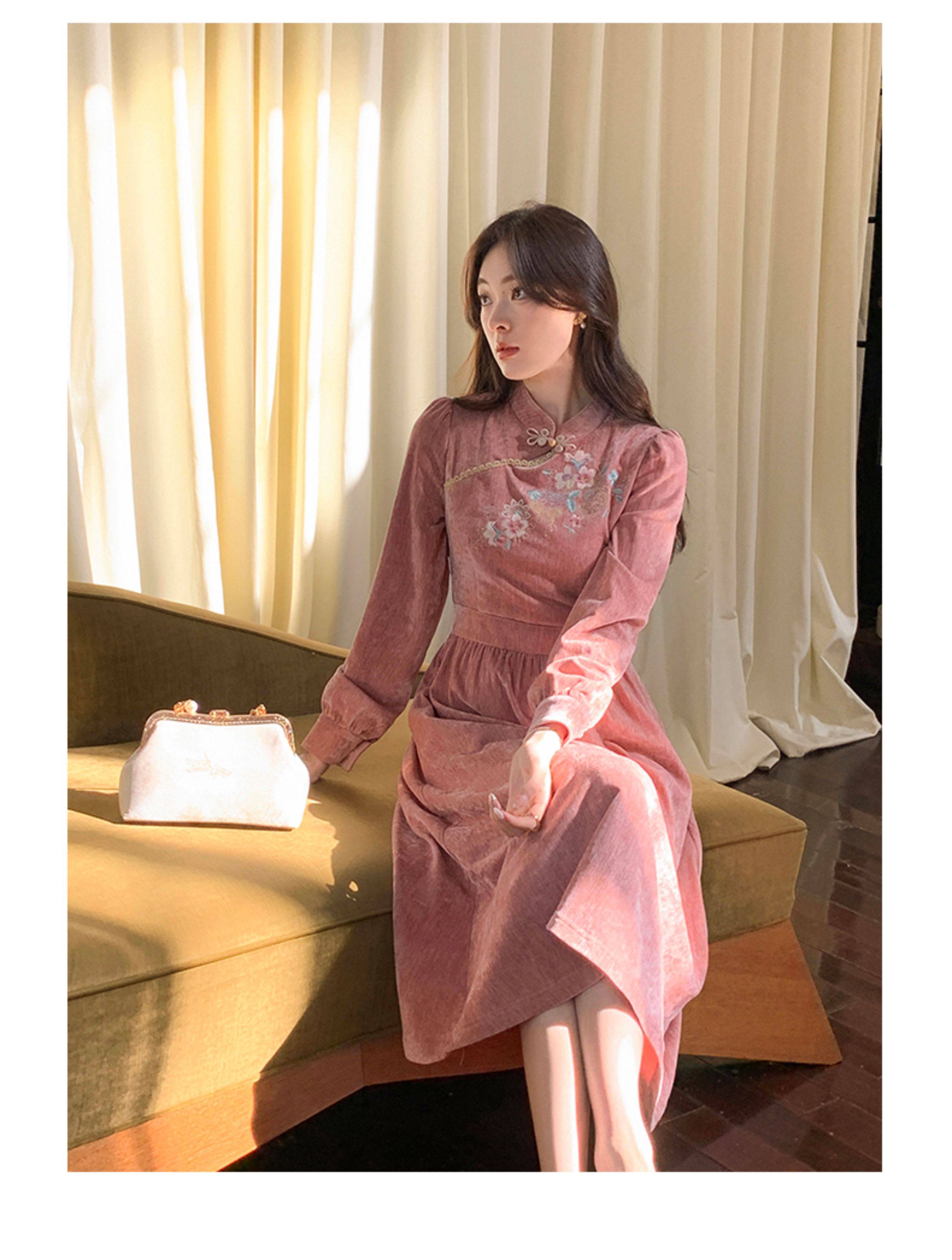GERTCOREL2025新款冬季原创新中式刺绣浅粉色减龄丝绒连衣裙女装