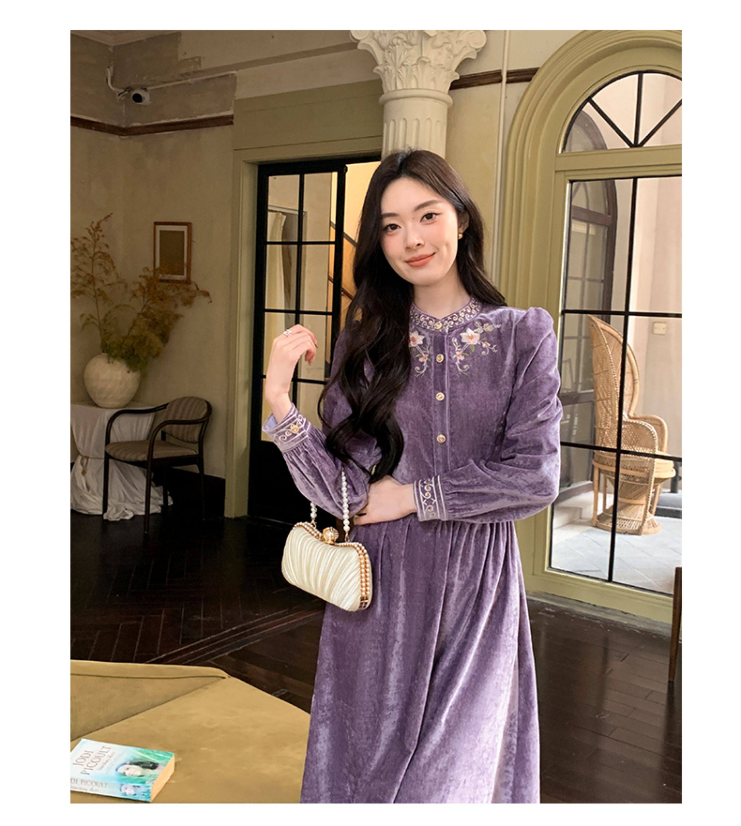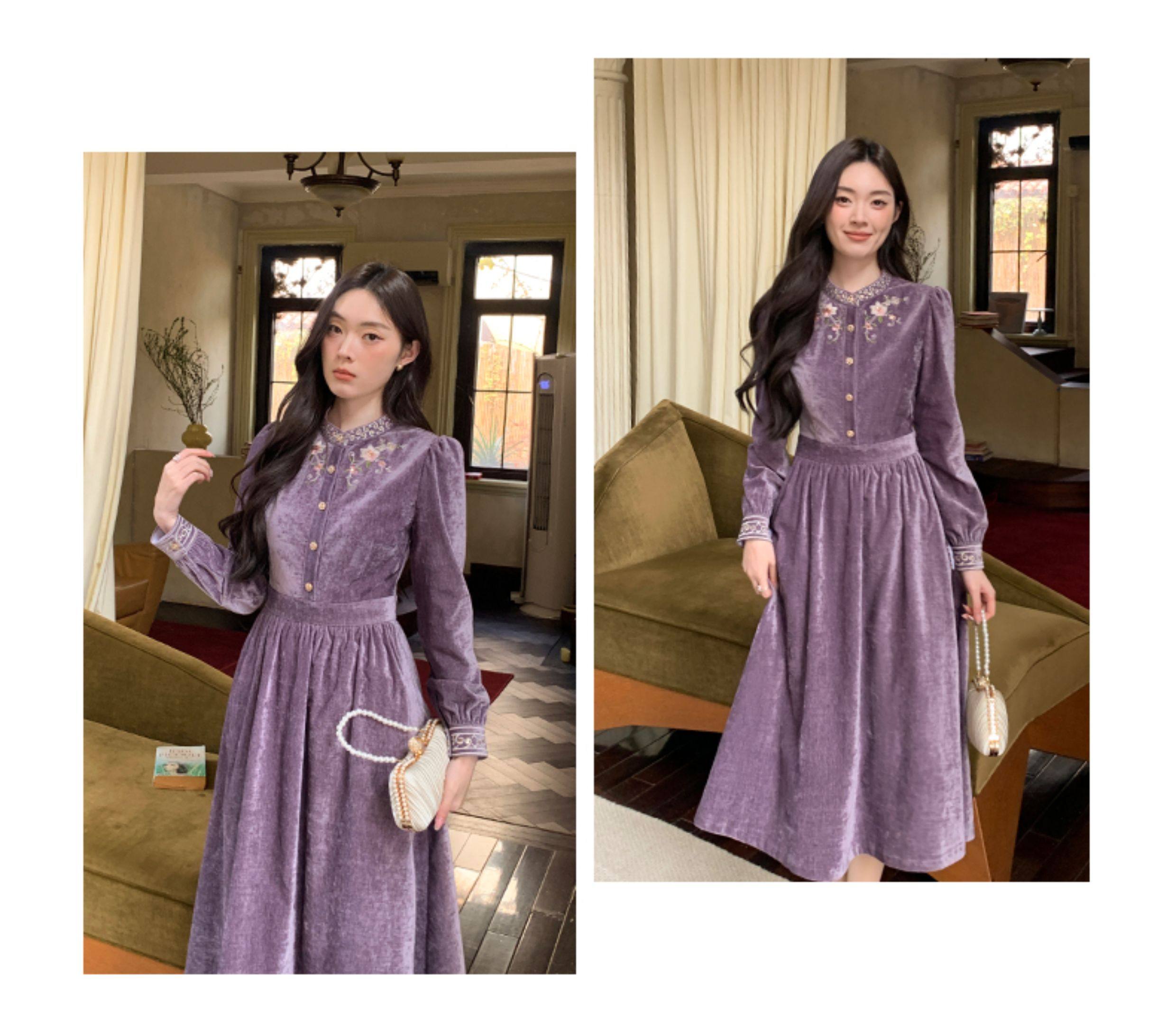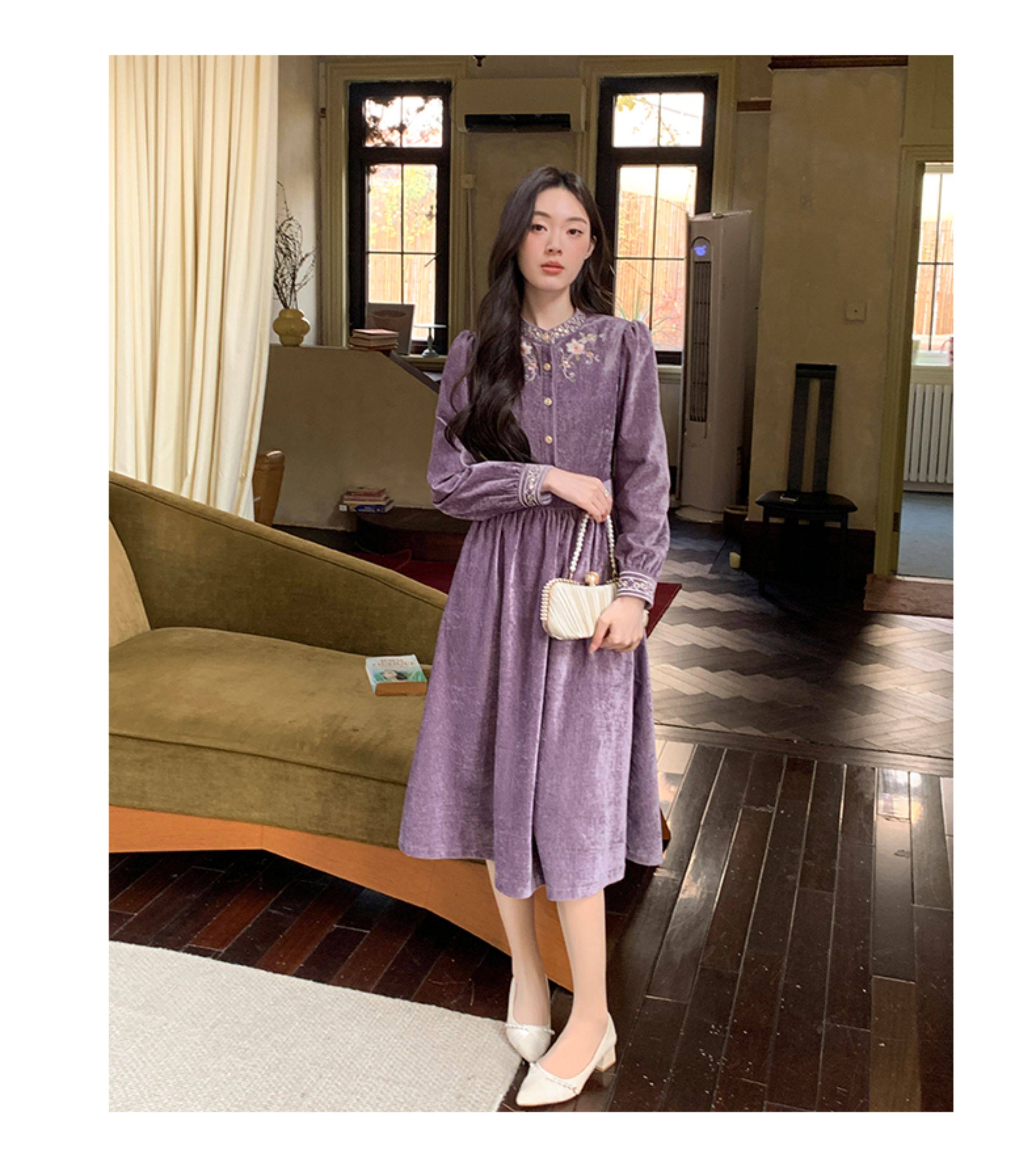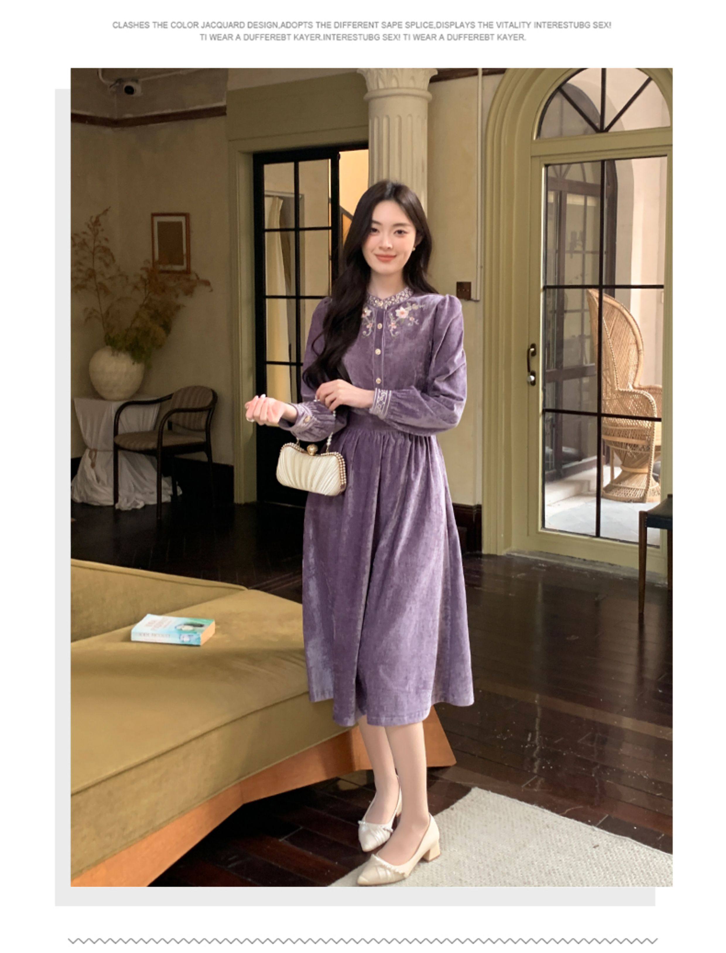 Gertcorel2025 New Winter New Chinese Style Waist-Cinching Long Dress Elegant Dark Purple Chenille Dress for Women