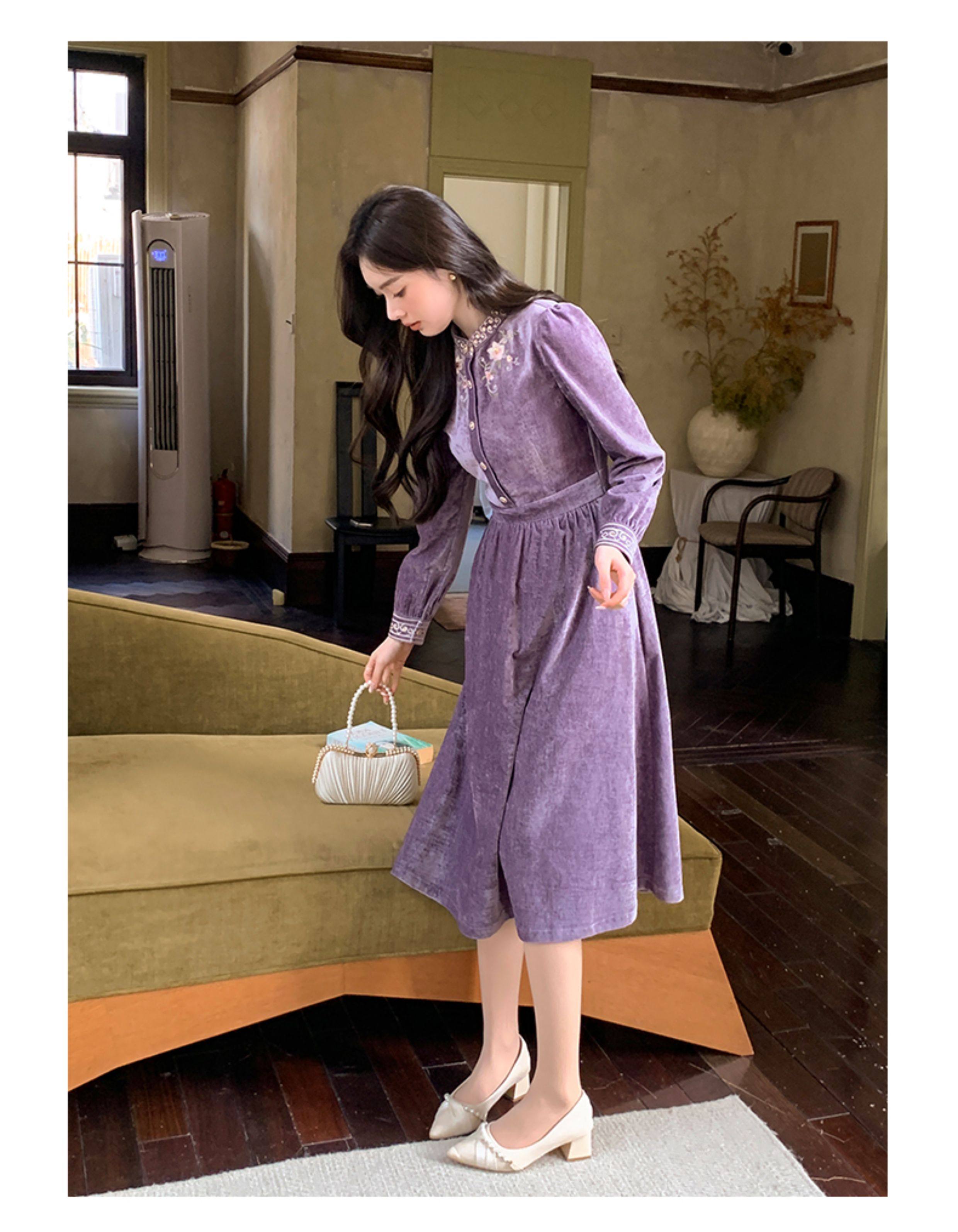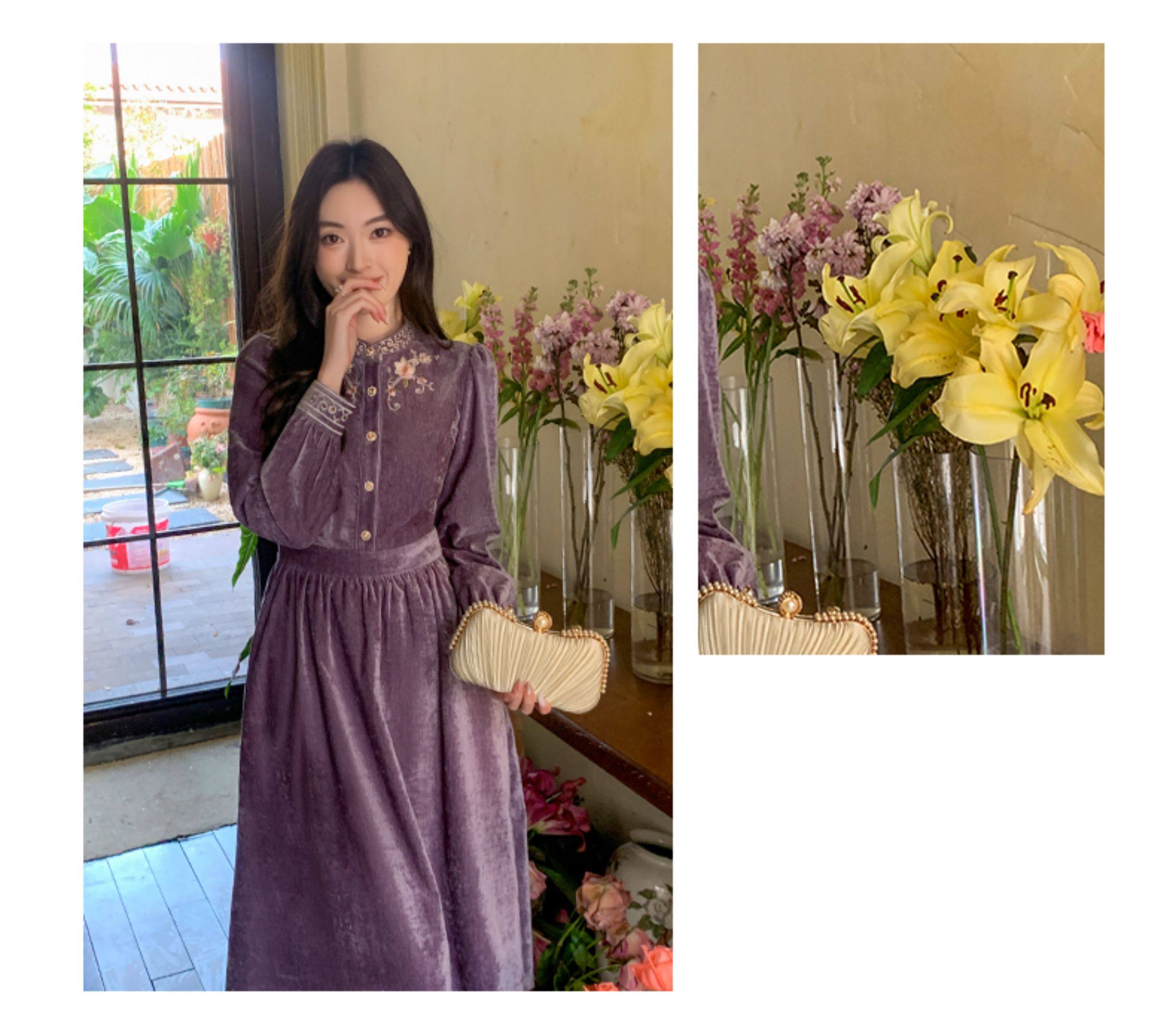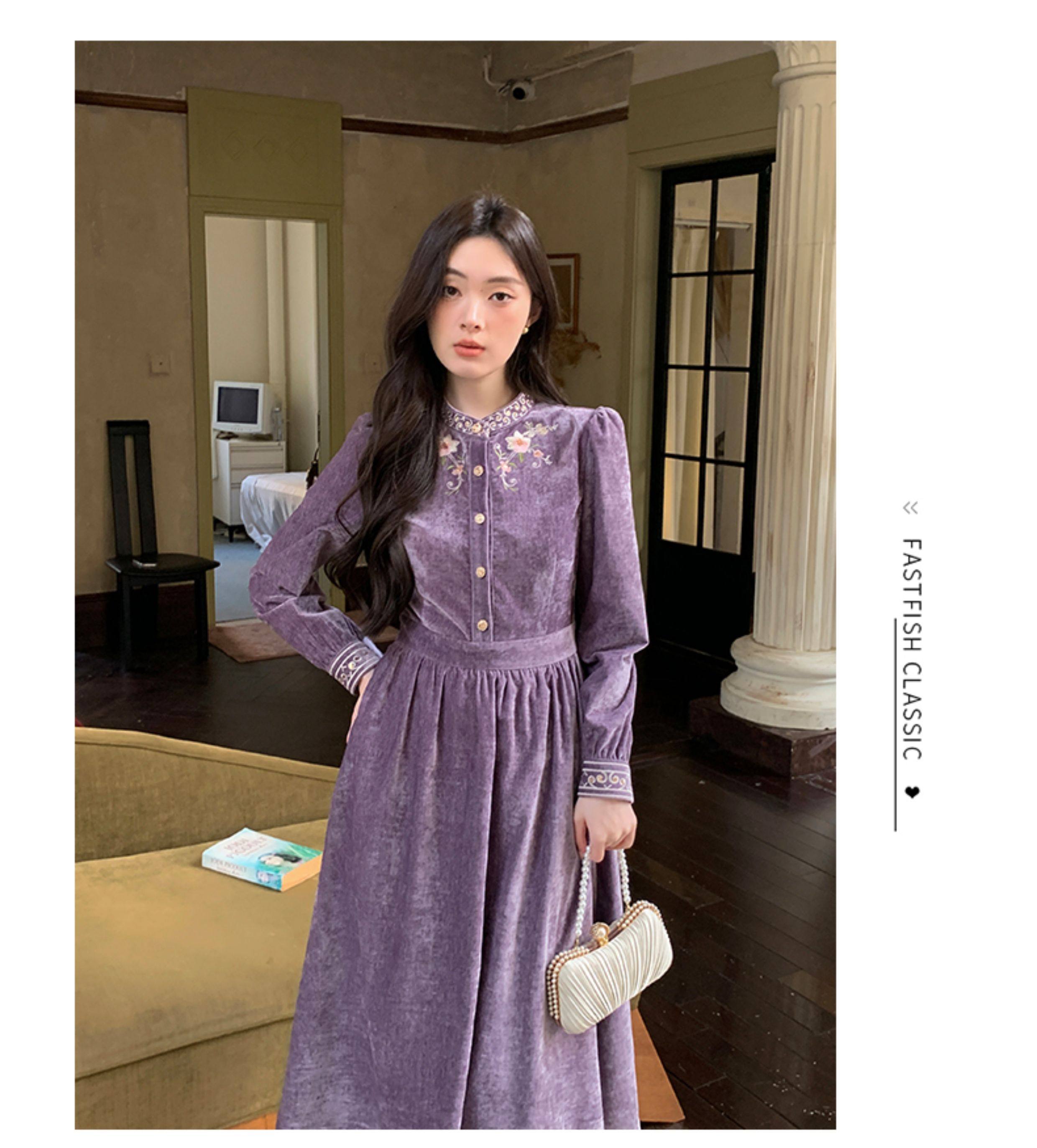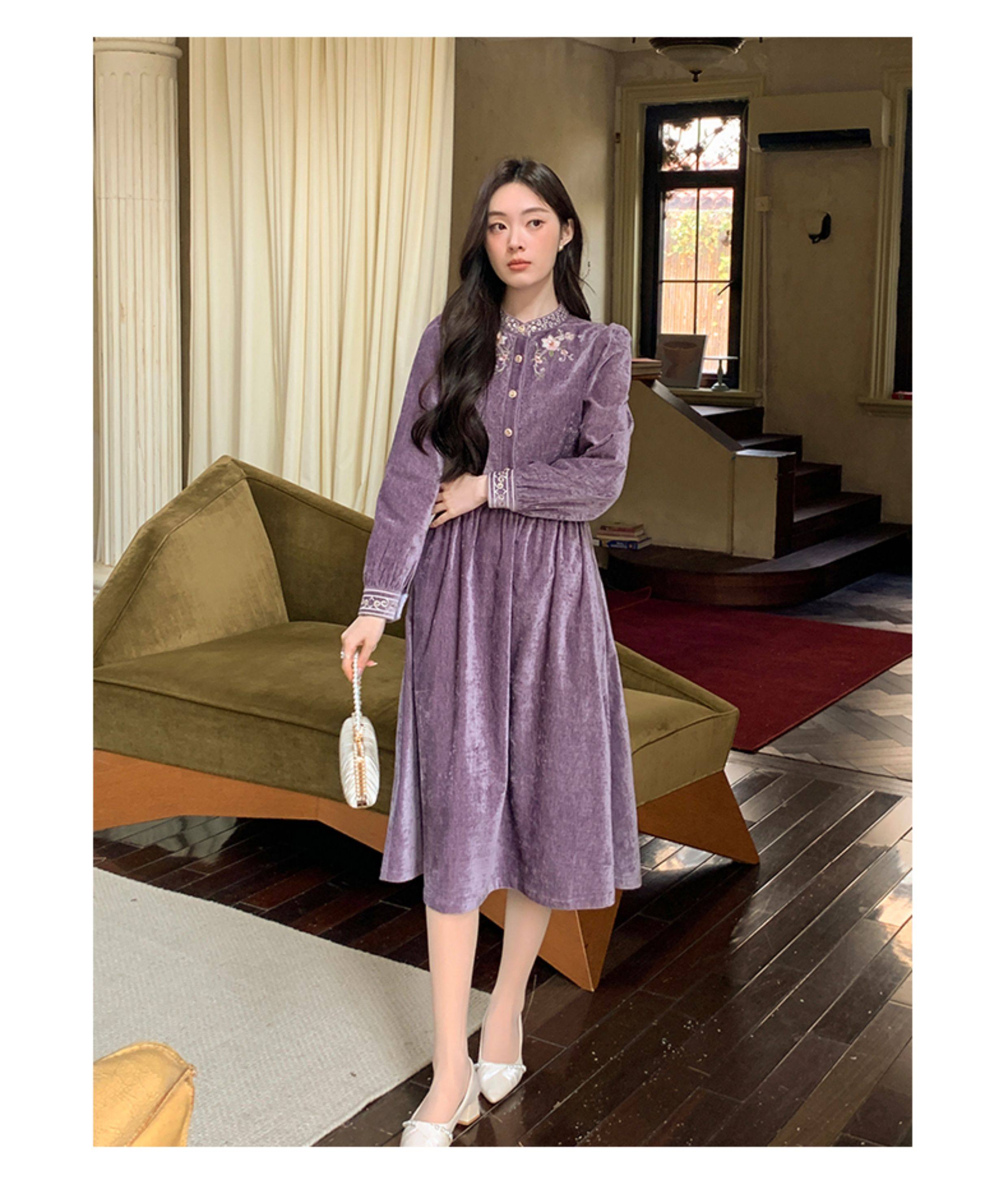 Gertcorel2025 New Winter New Chinese Style Waist-Cinching Long Dress Elegant Dark Purple Chenille Dress for Women