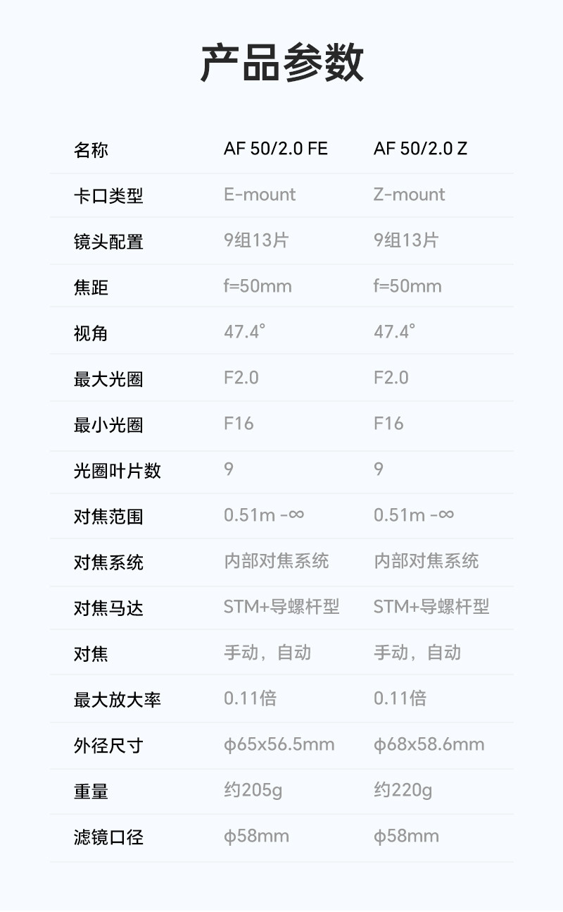 镜头型号 AF 50mm F2.0 Air