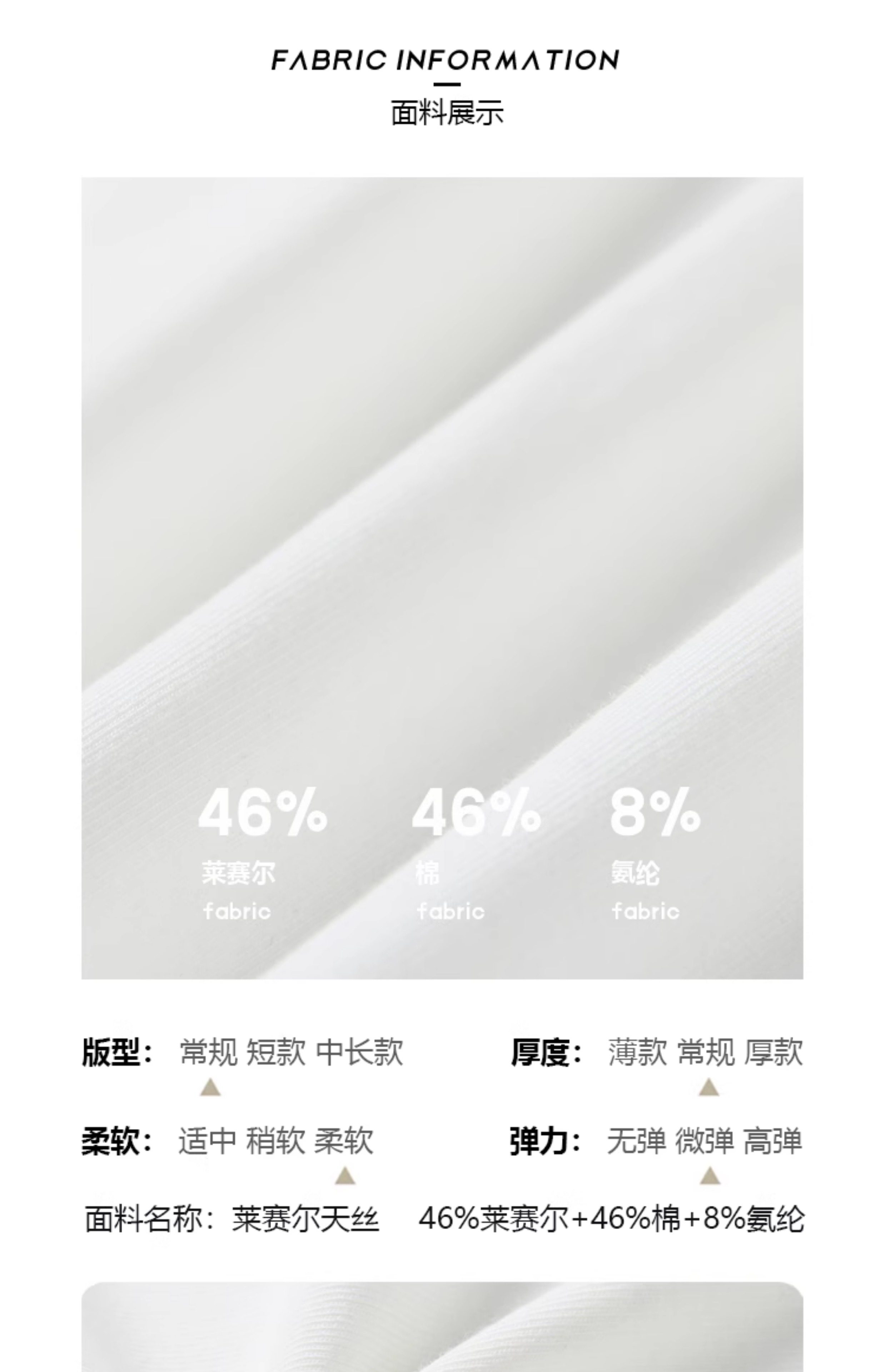 材质成分 莱赛尔纤维(莱赛尔)46% 棉46% 聚氨酯弹性纤维(氨纶)8%