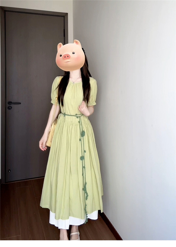 2026新款绿色圆领短袖衬衫连衣裙子女夏高级感小清新收腰法式长裙