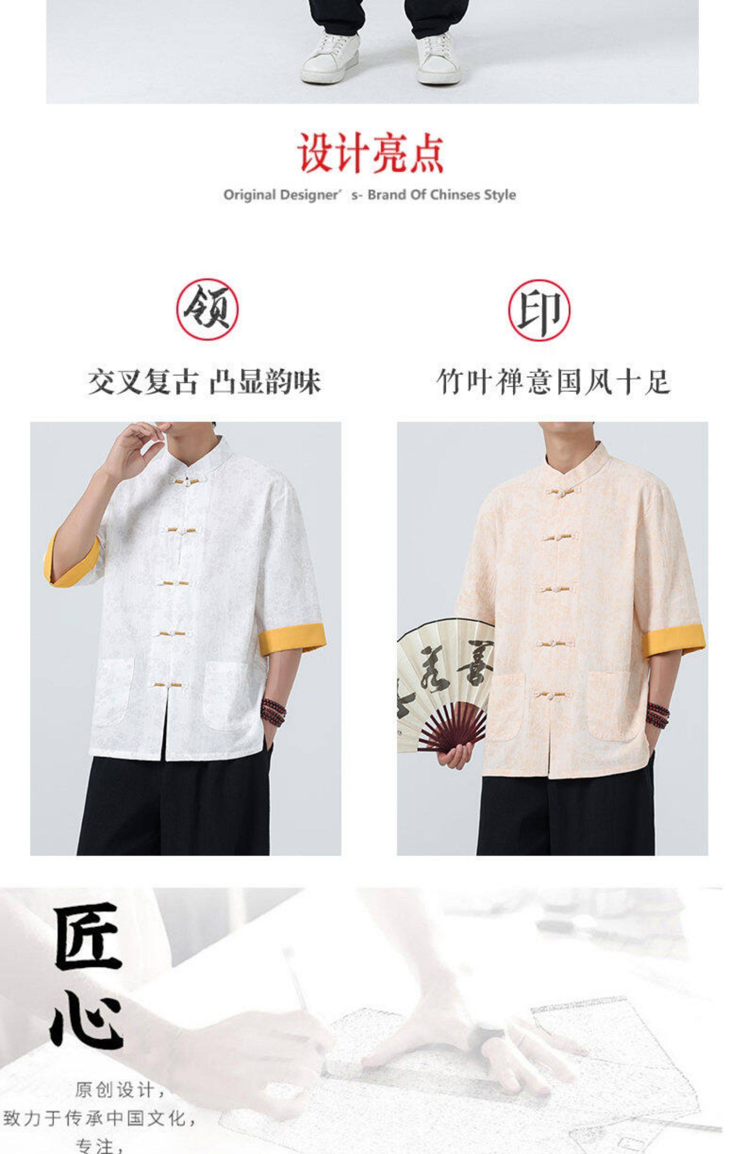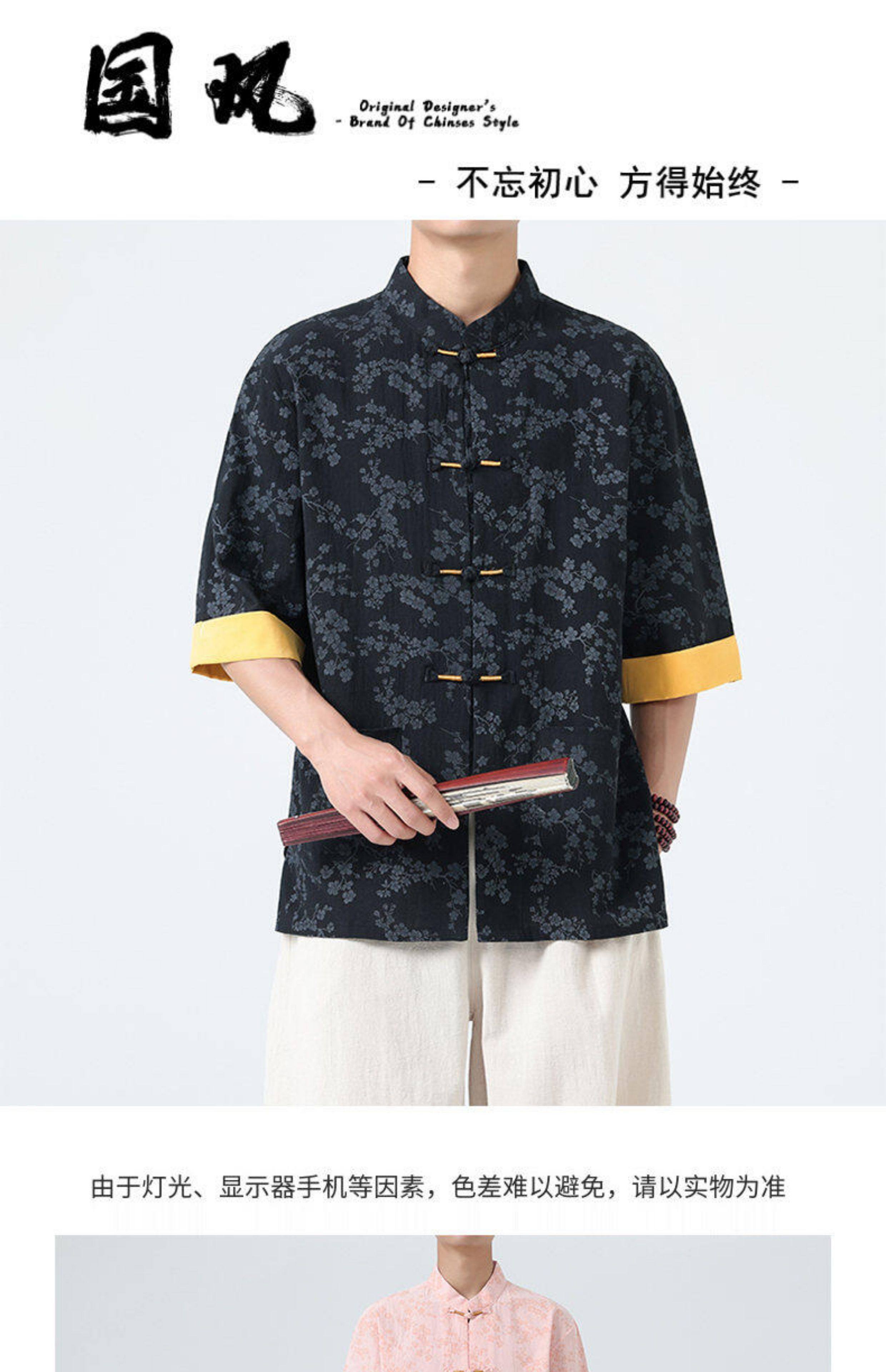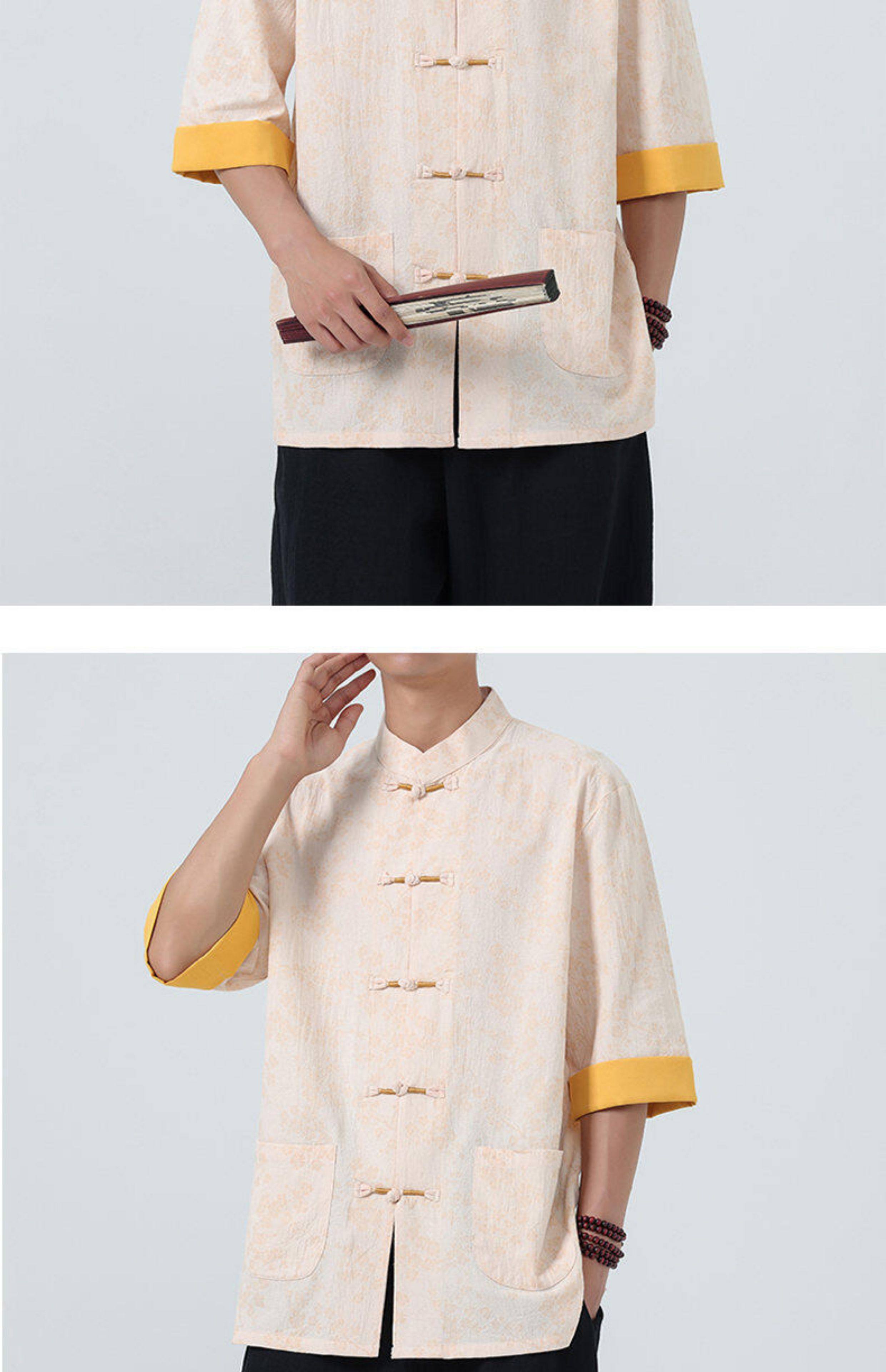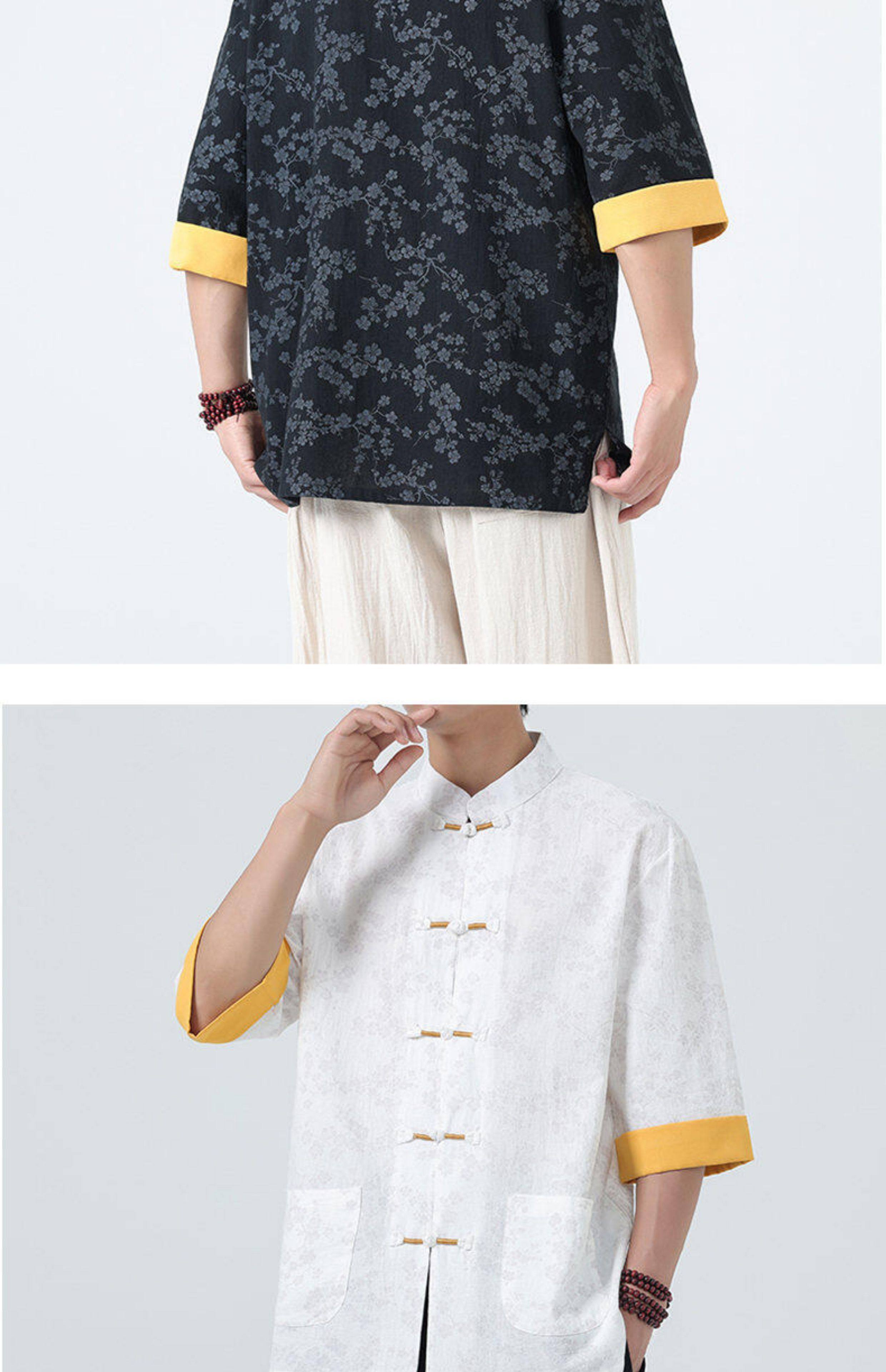 Мужская летняя рубашка в китайском стиле из хлопка и льна, с рукавом до локтя, свободного кроя, в стиле ретро, с воротником-стойкой, на пуговицах, с принтом, в стиле тан-костюм, топ с рукавом до локтя