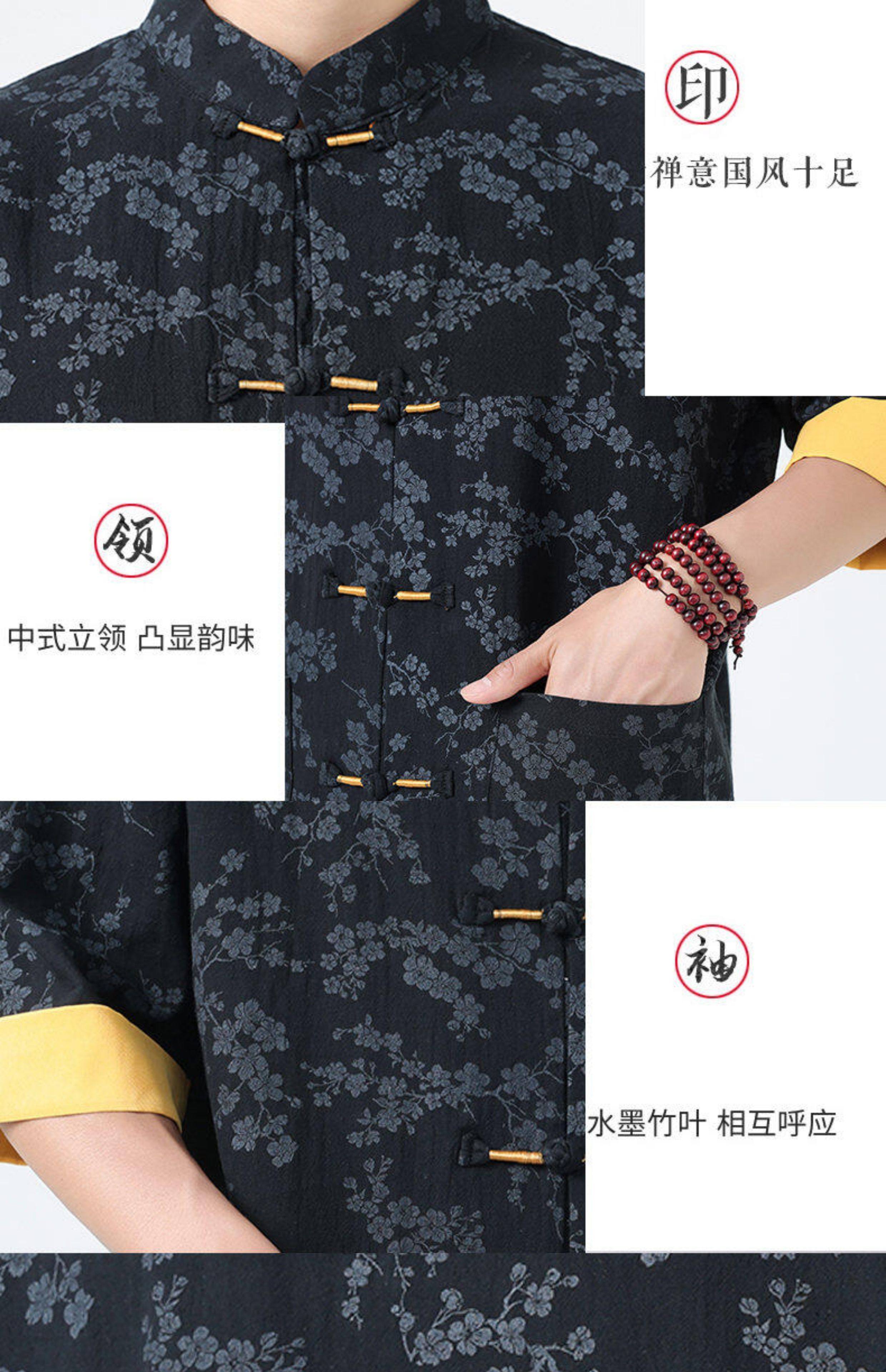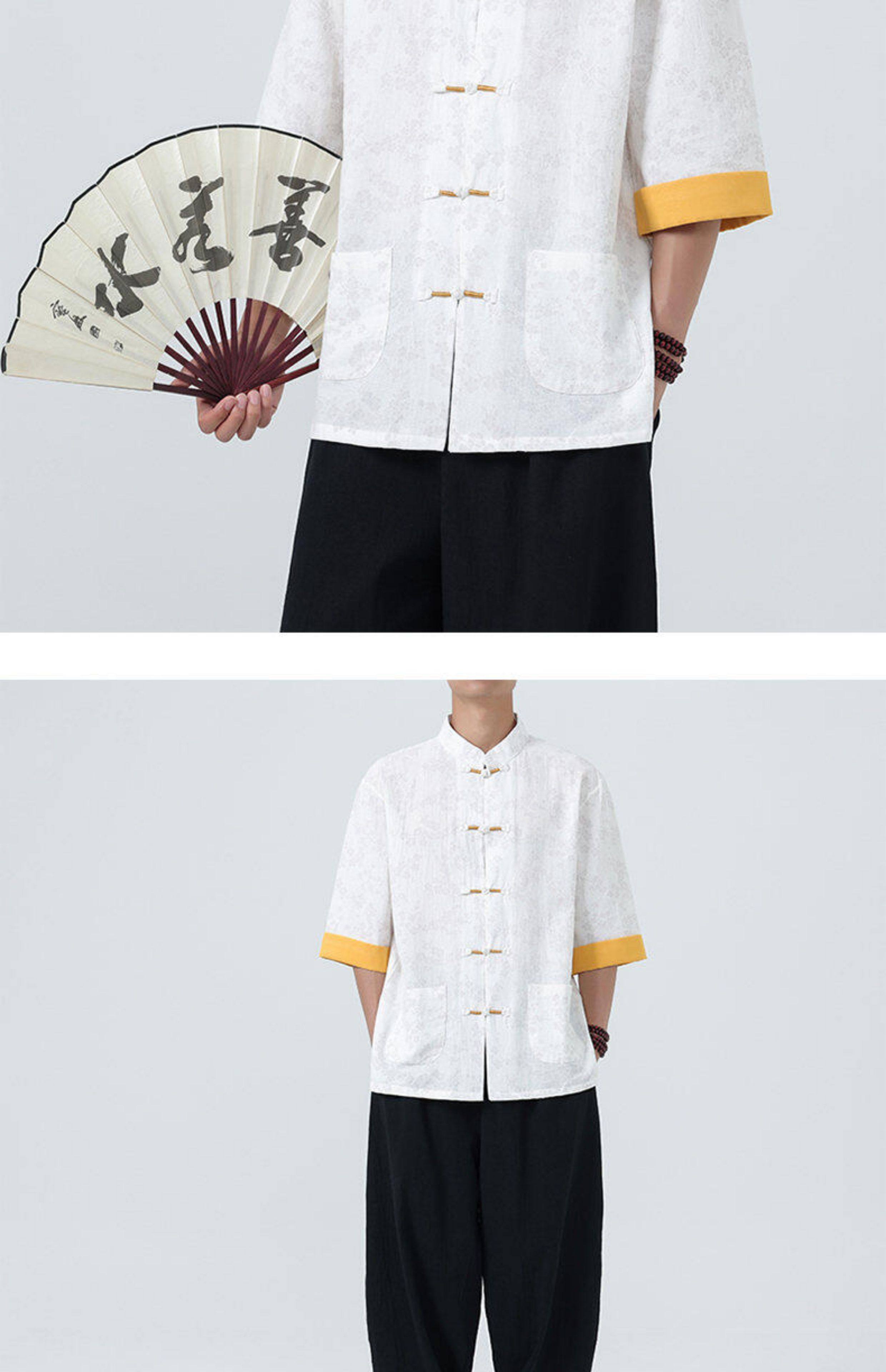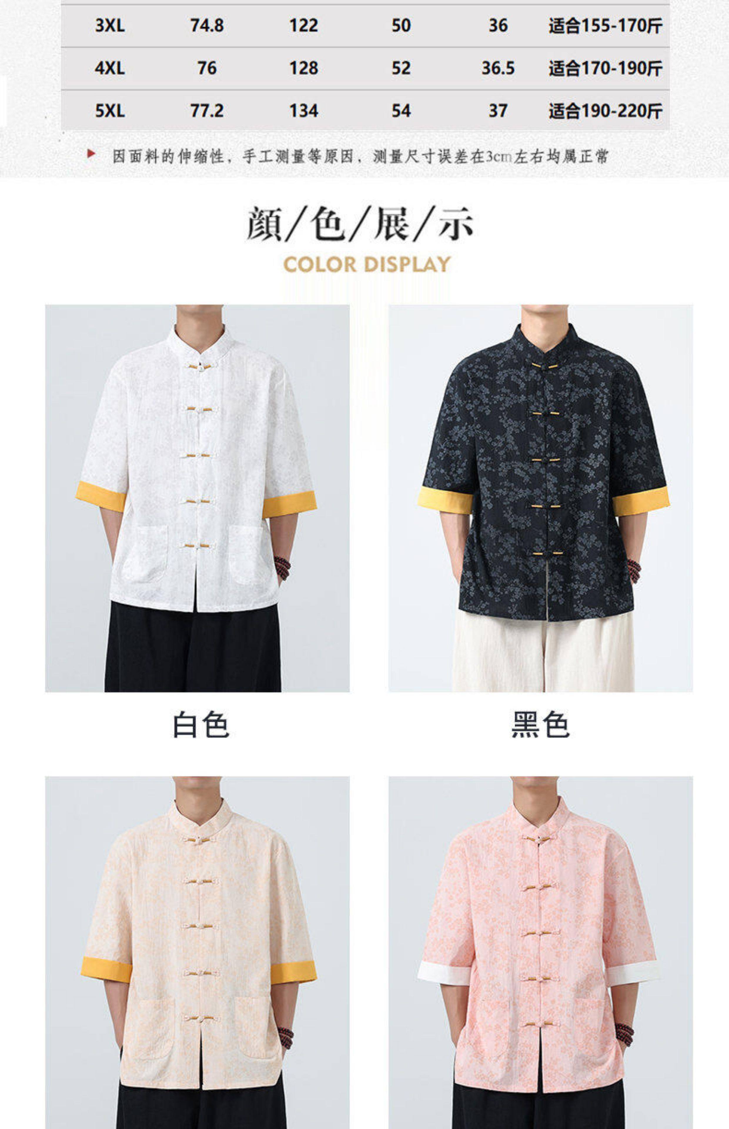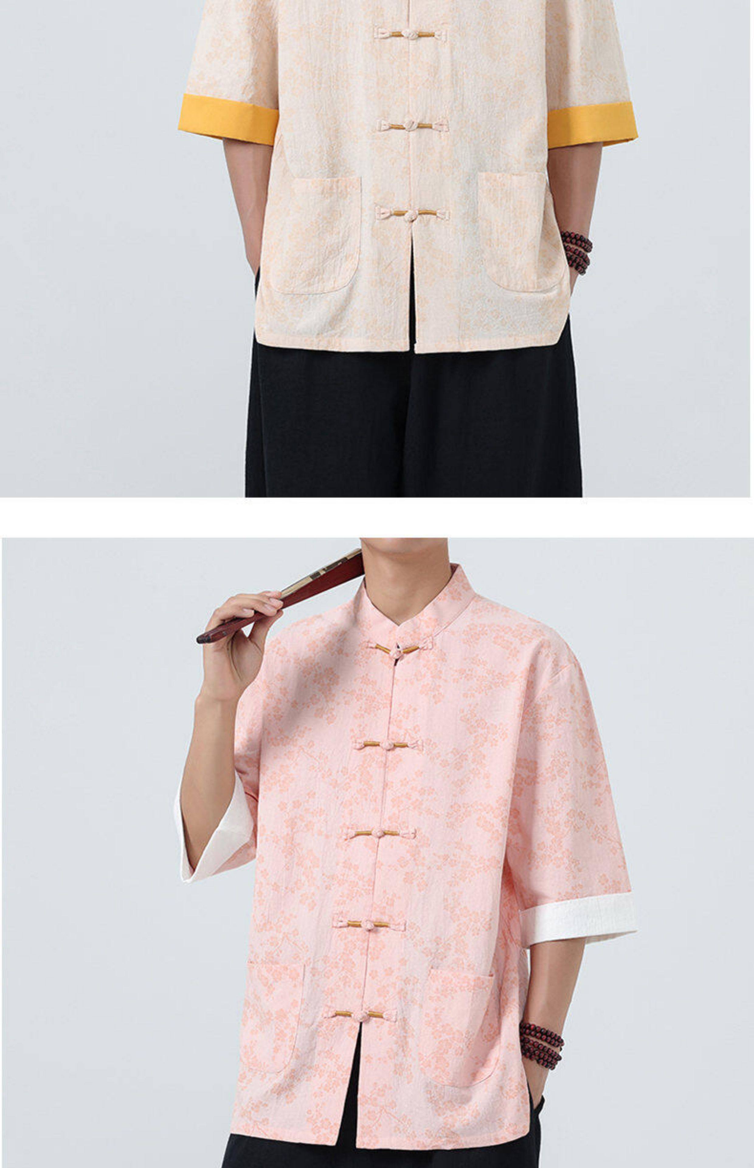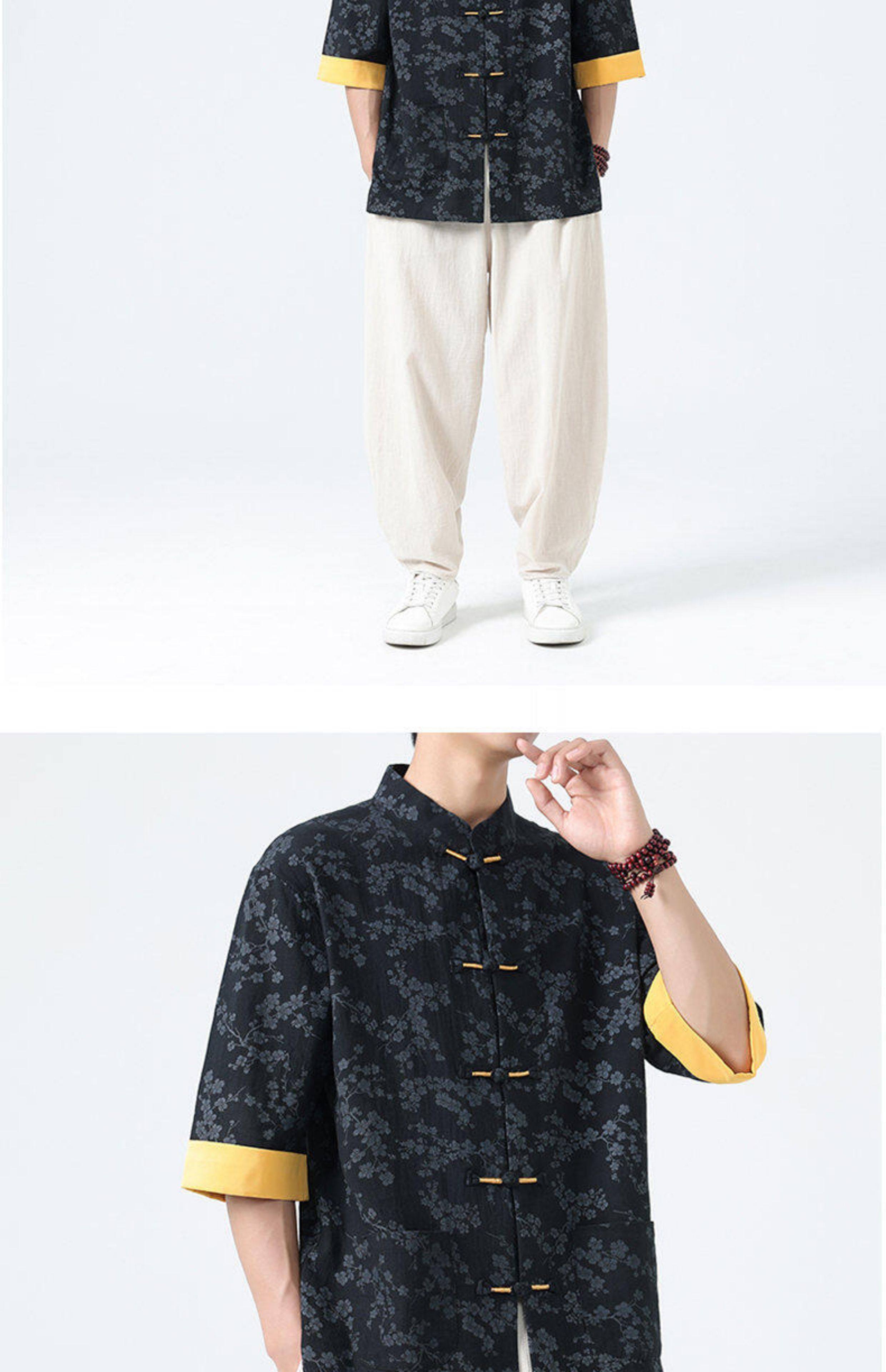 Мужская летняя рубашка в китайском стиле из хлопка и льна, с рукавом до локтя, свободного кроя, в стиле ретро, с воротником-стойкой, на пуговицах, с принтом, в стиле тан-костюм, топ с рукавом до локтя