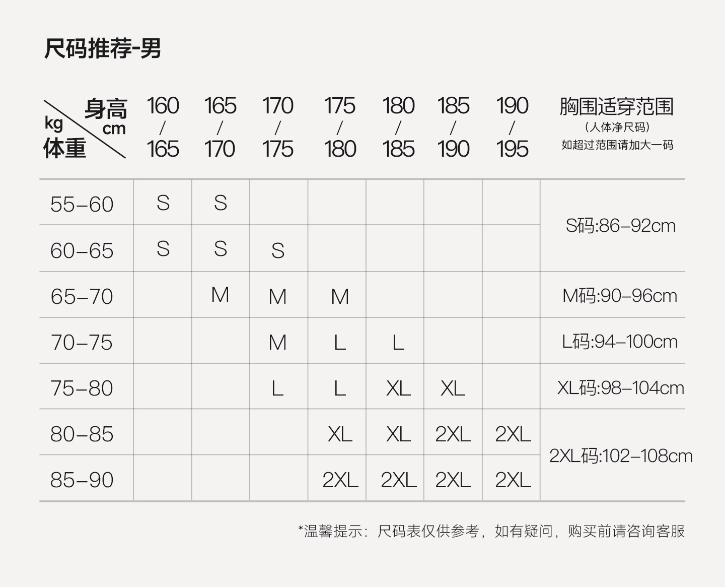 China (cm) 165 / 88-90 170 / 96-98 175 / 108-110 180 / 118-122 185 / 126-130
