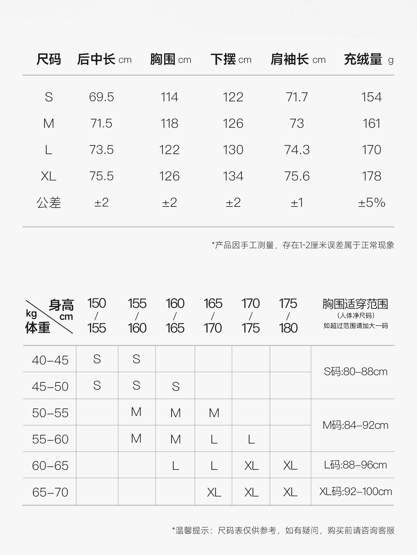 China (cm) 160-165/84-86 165-170 / 88-90 167-172 / 92-96 168-173 / 98-102 170-176 / 106-110