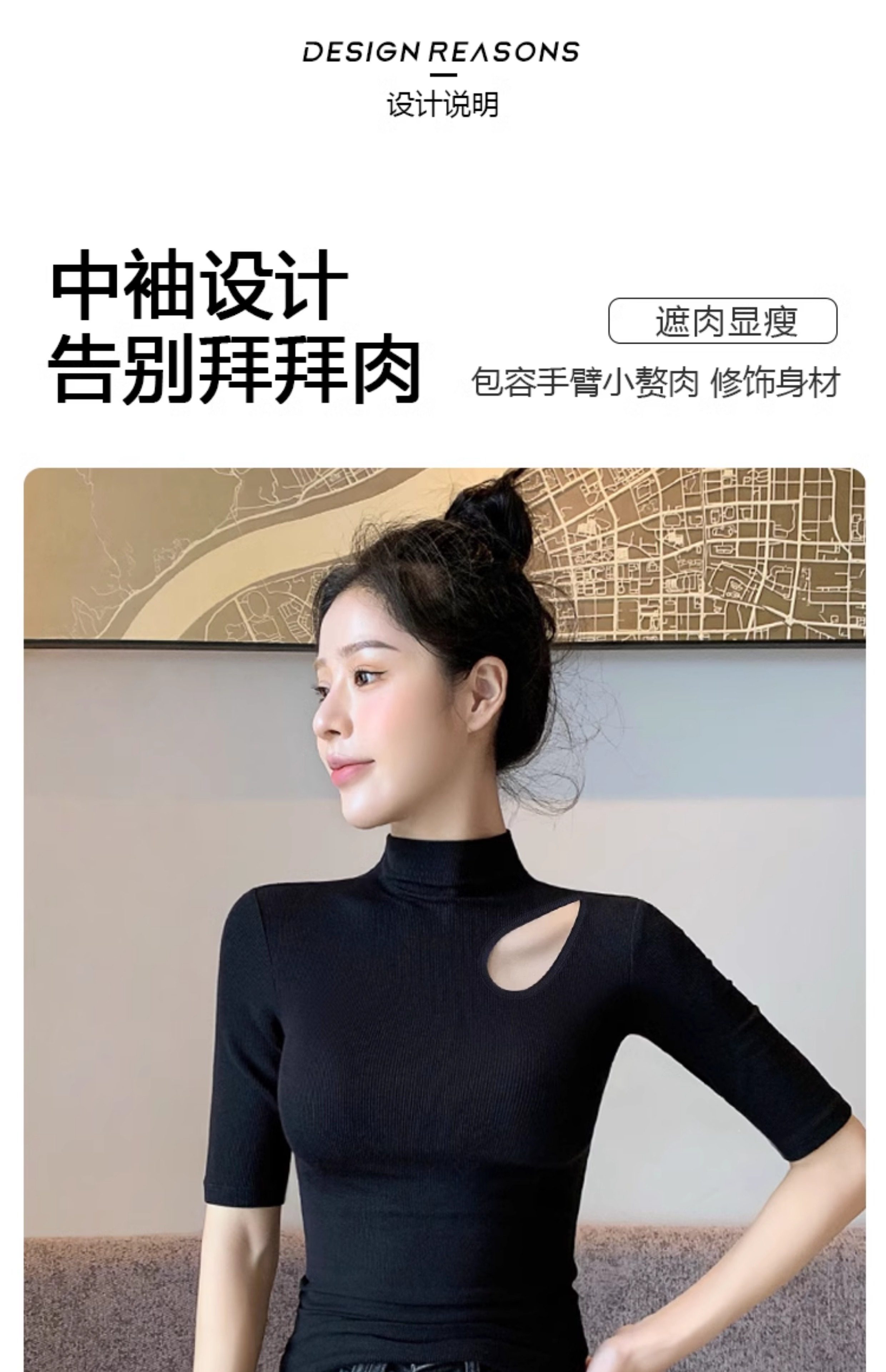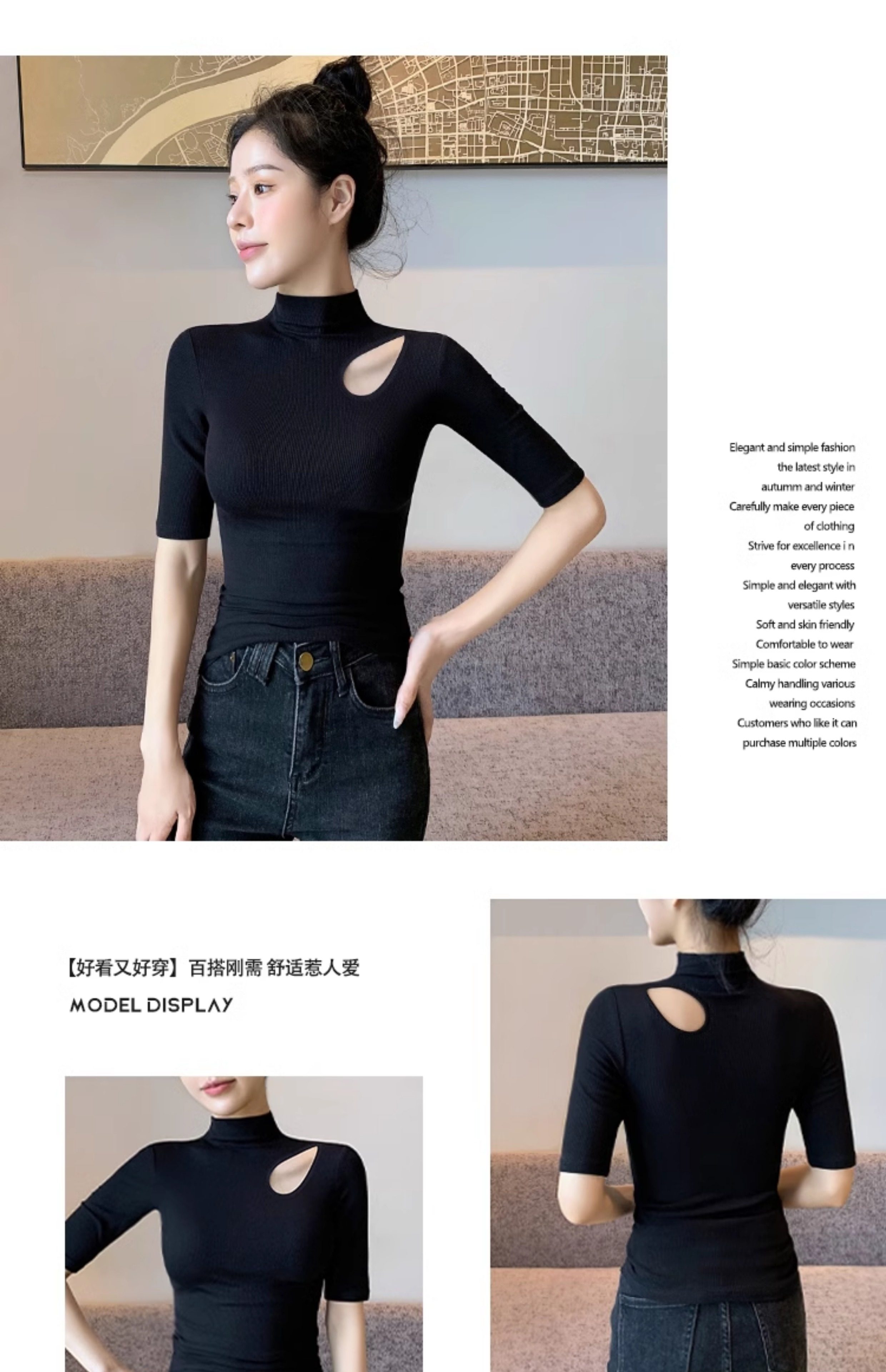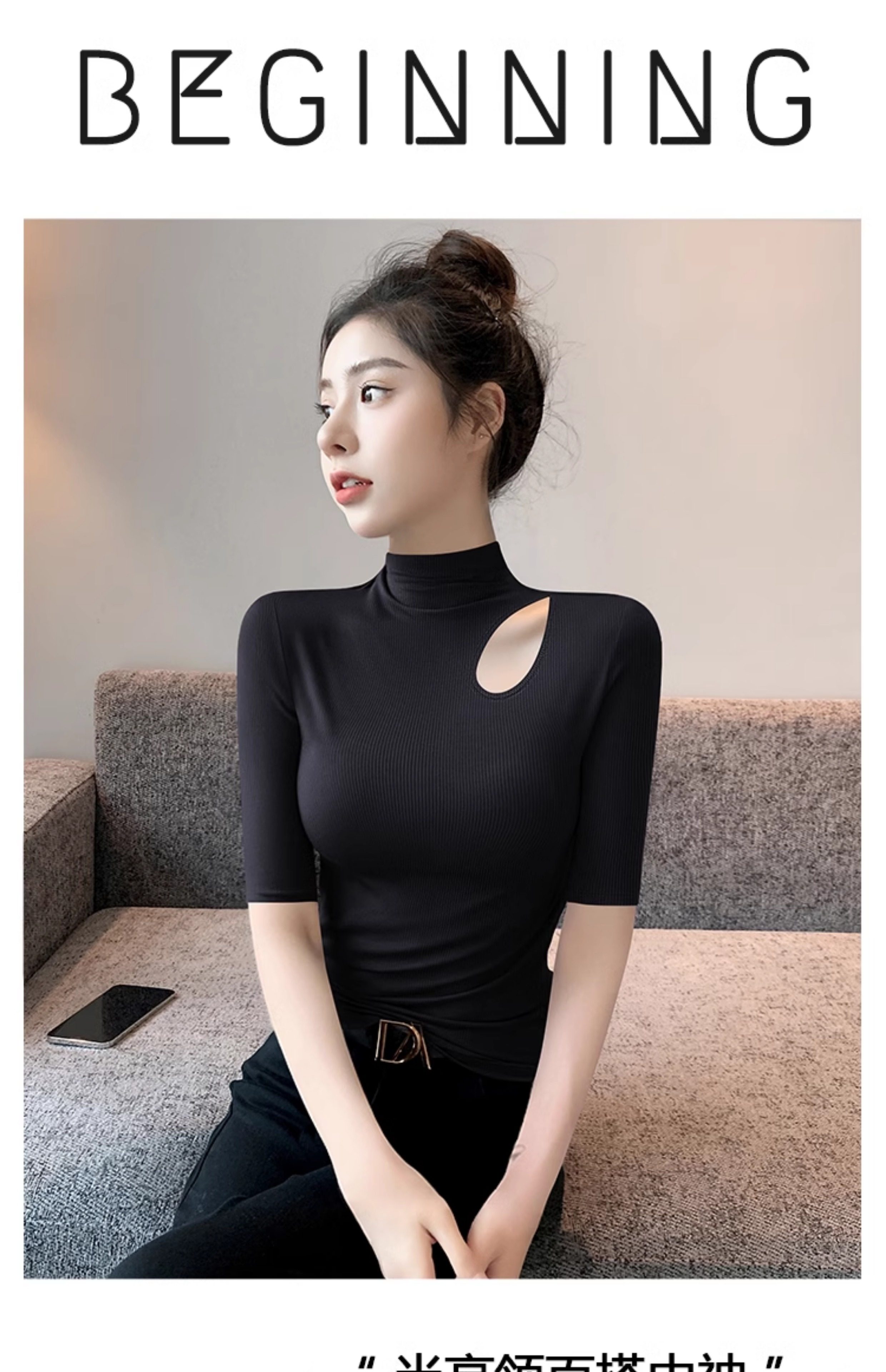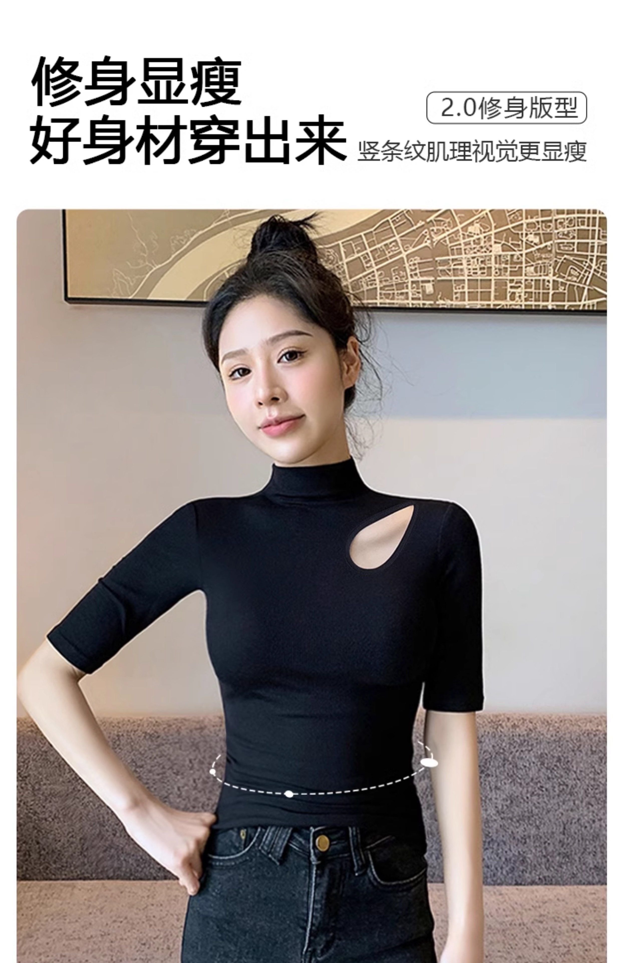 镂空半高领黑色打底衫女2026新款中袖t恤五分袖针织打底内搭上衣