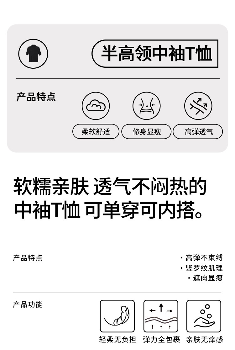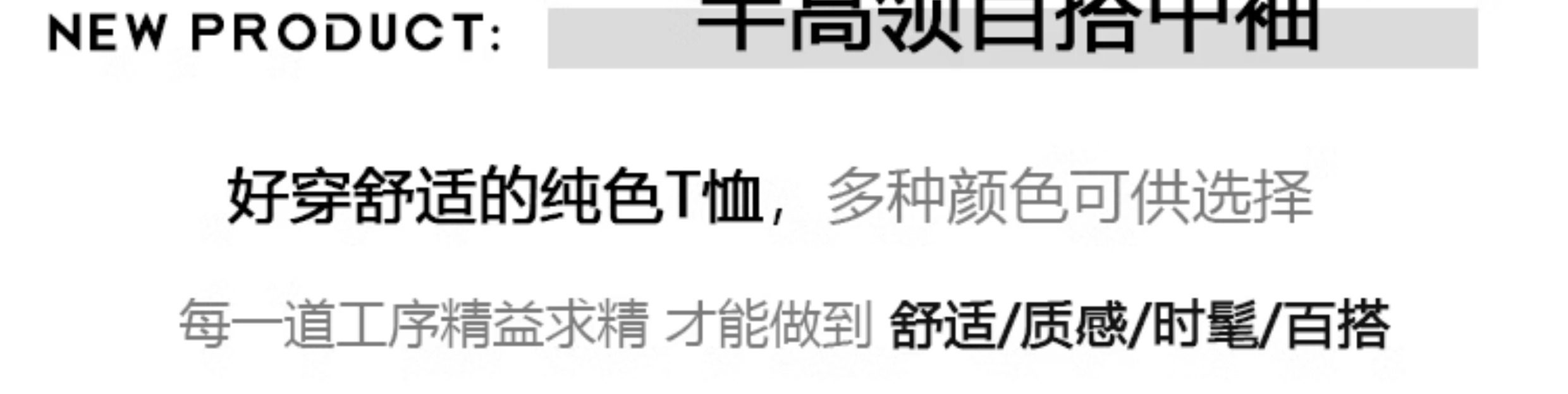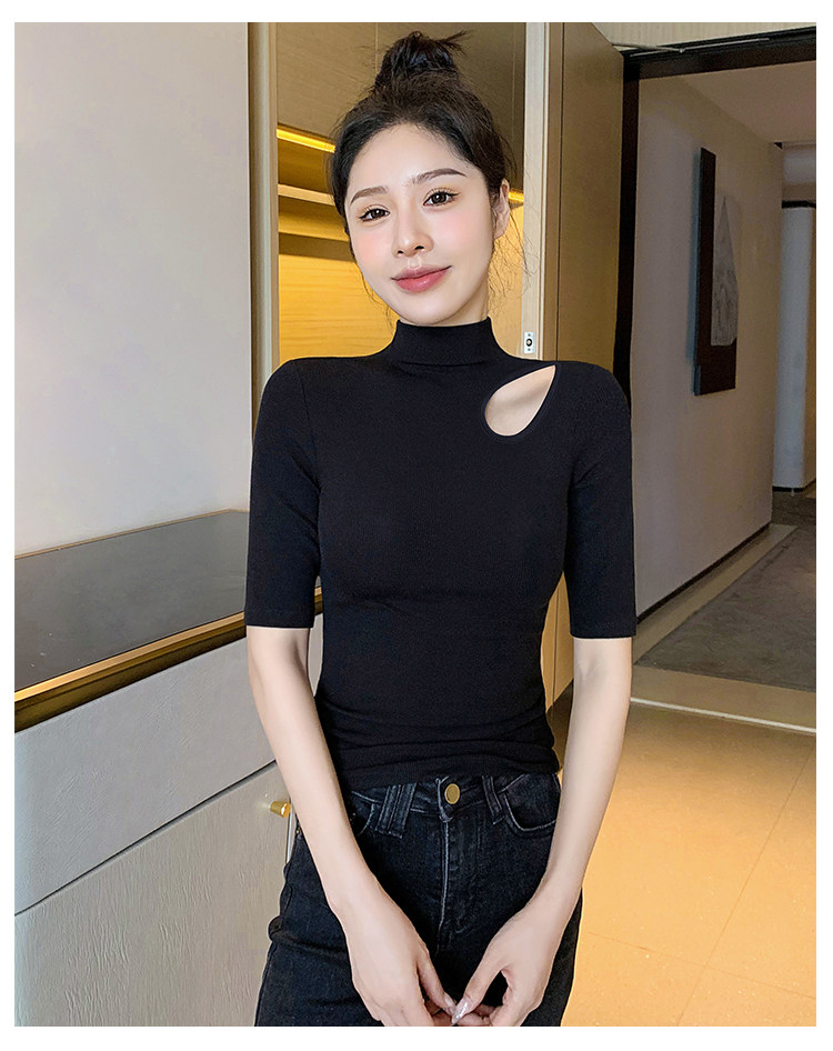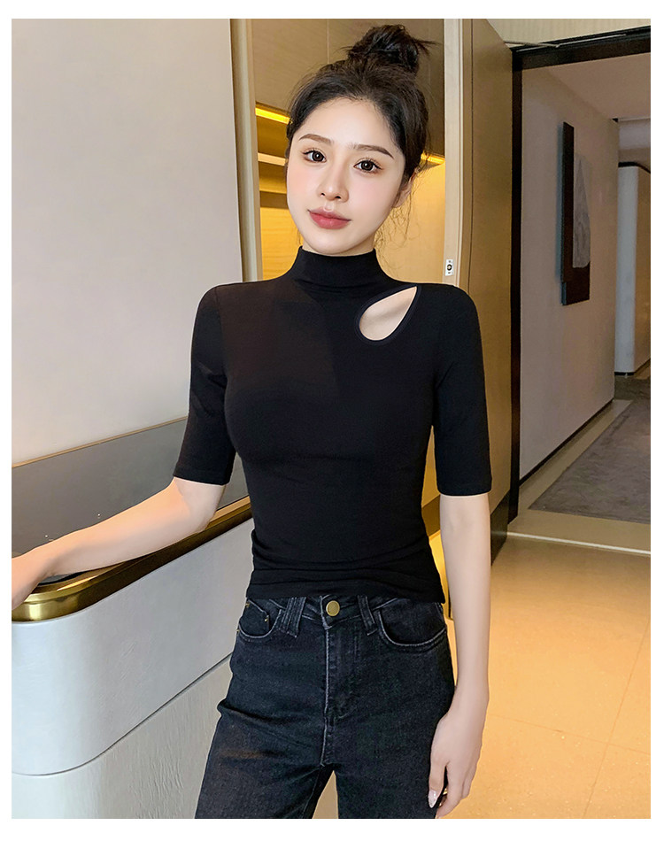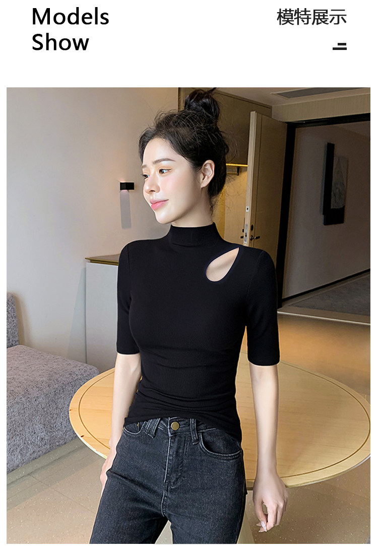 镂空半高领黑色打底衫女2026新款中袖t恤五分袖针织打底内搭上衣