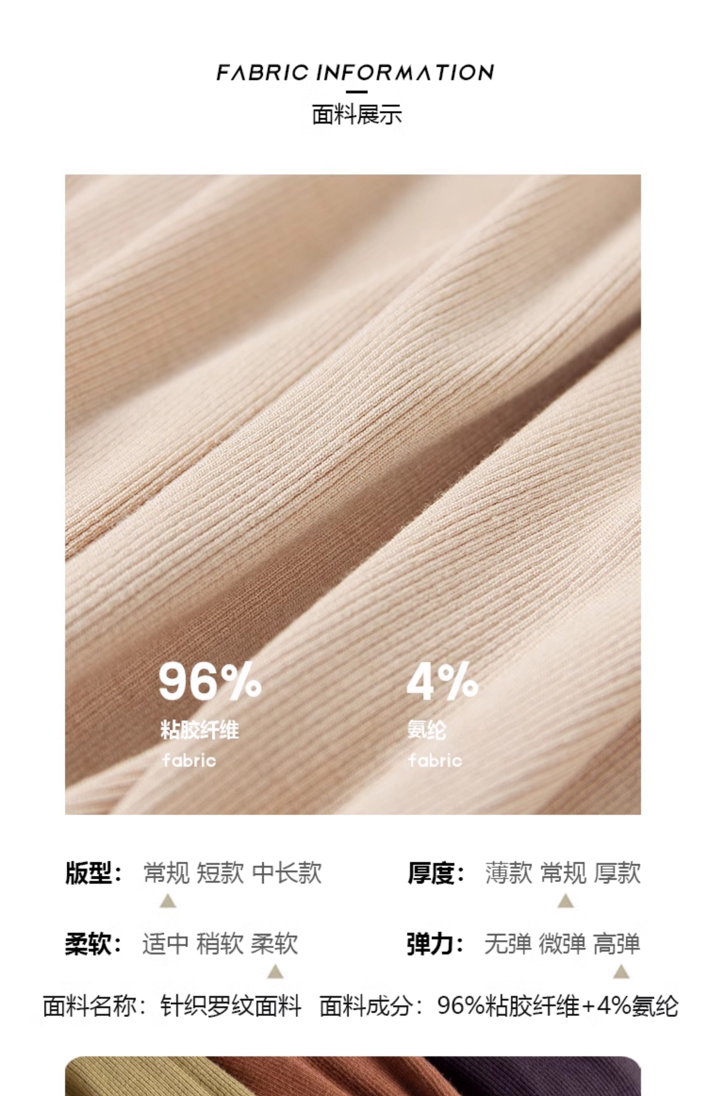 材质成分 粘胶纤维(粘纤)96% 聚氨酯弹性纤维(氨纶)4%