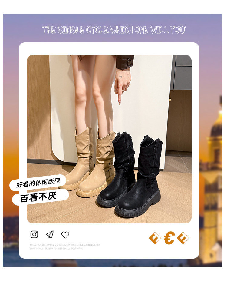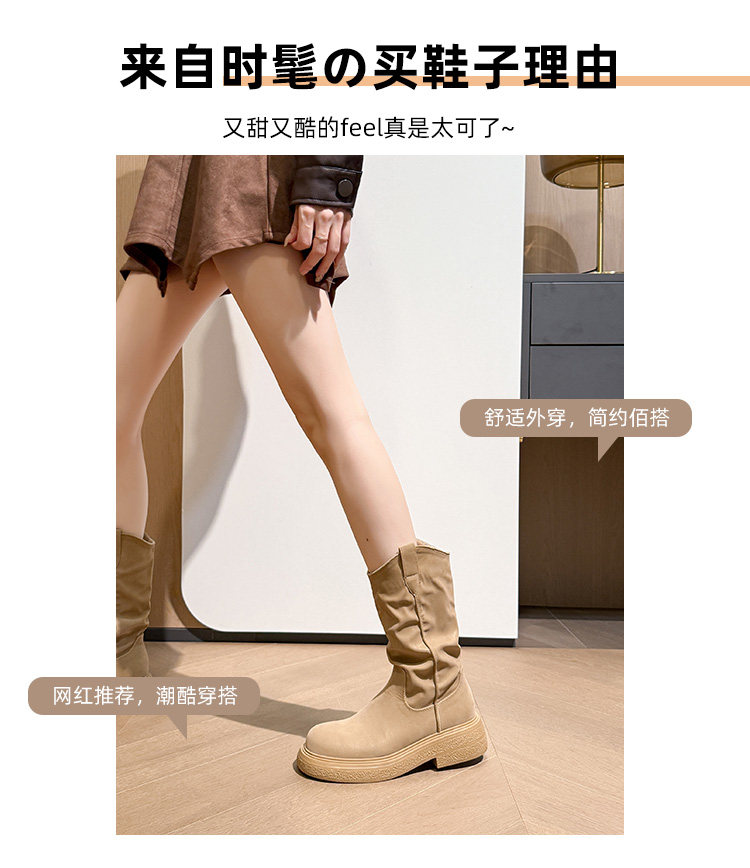 废土风圆头厚底中筒靴女2025新款春秋单靴小个子褶皱堆堆靴新疆靴