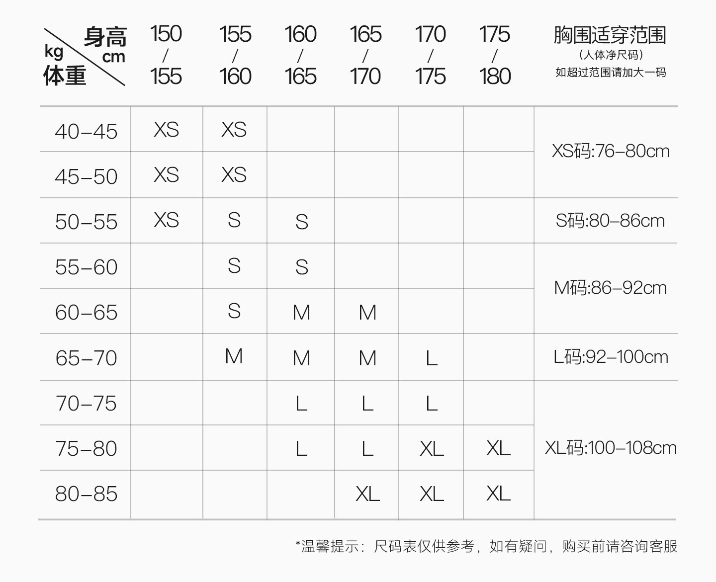 China (cm) 160-165/84-86 165-170 / 88-90 167-172 / 92-96 168-173 / 98-102 170-176 / 106-110