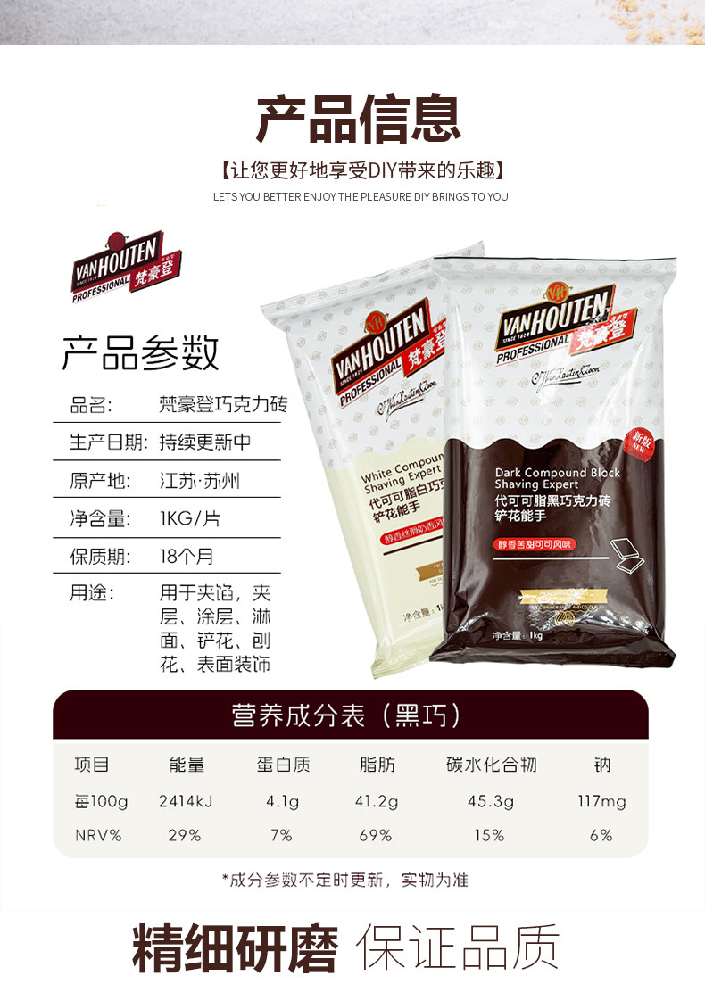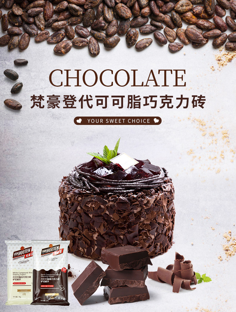 梵豪登巧克力砖黑白巧烘焙代可可脂巧克力块1kg*10袋铲花刨花商用