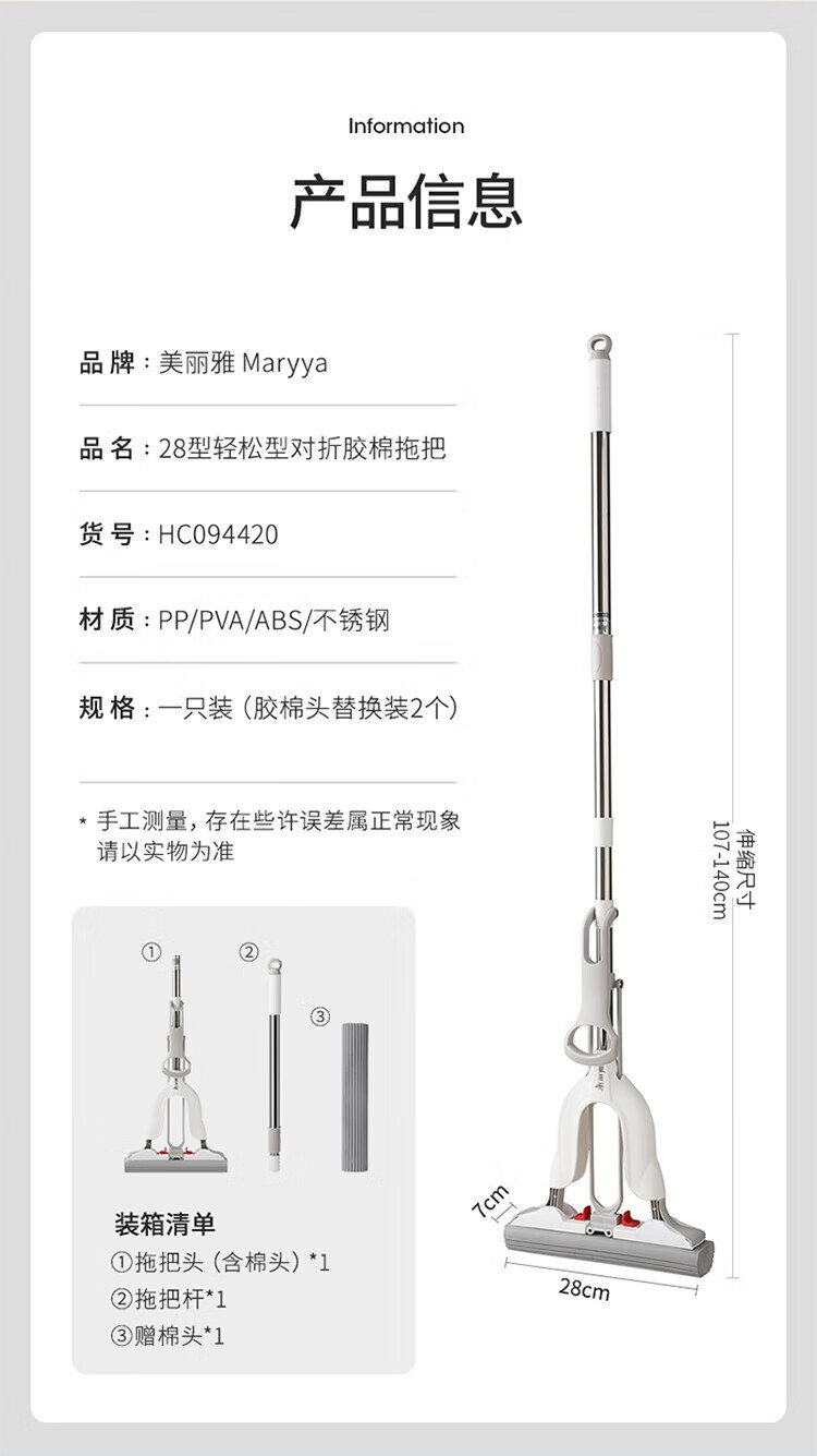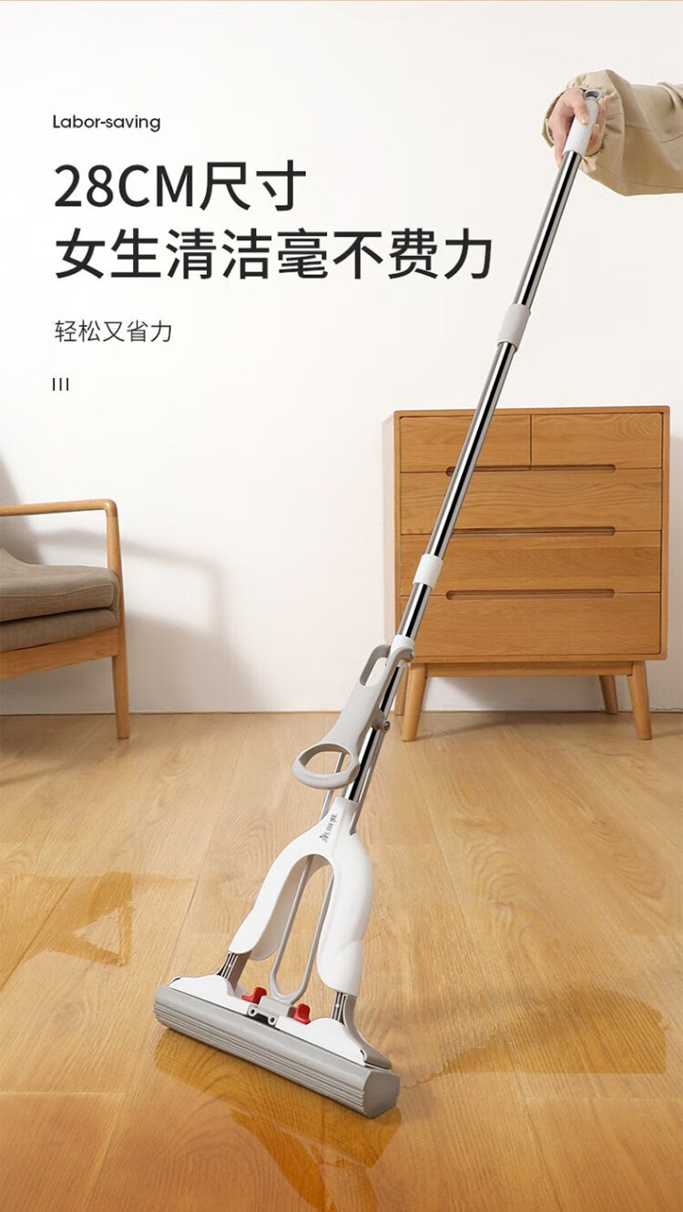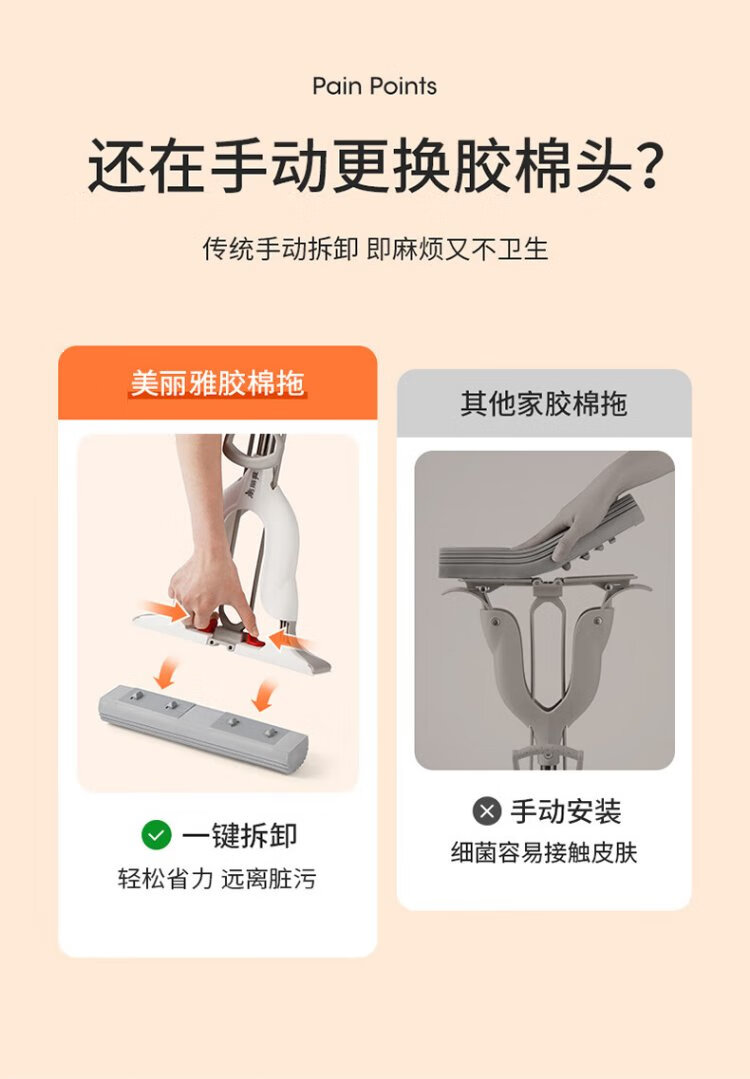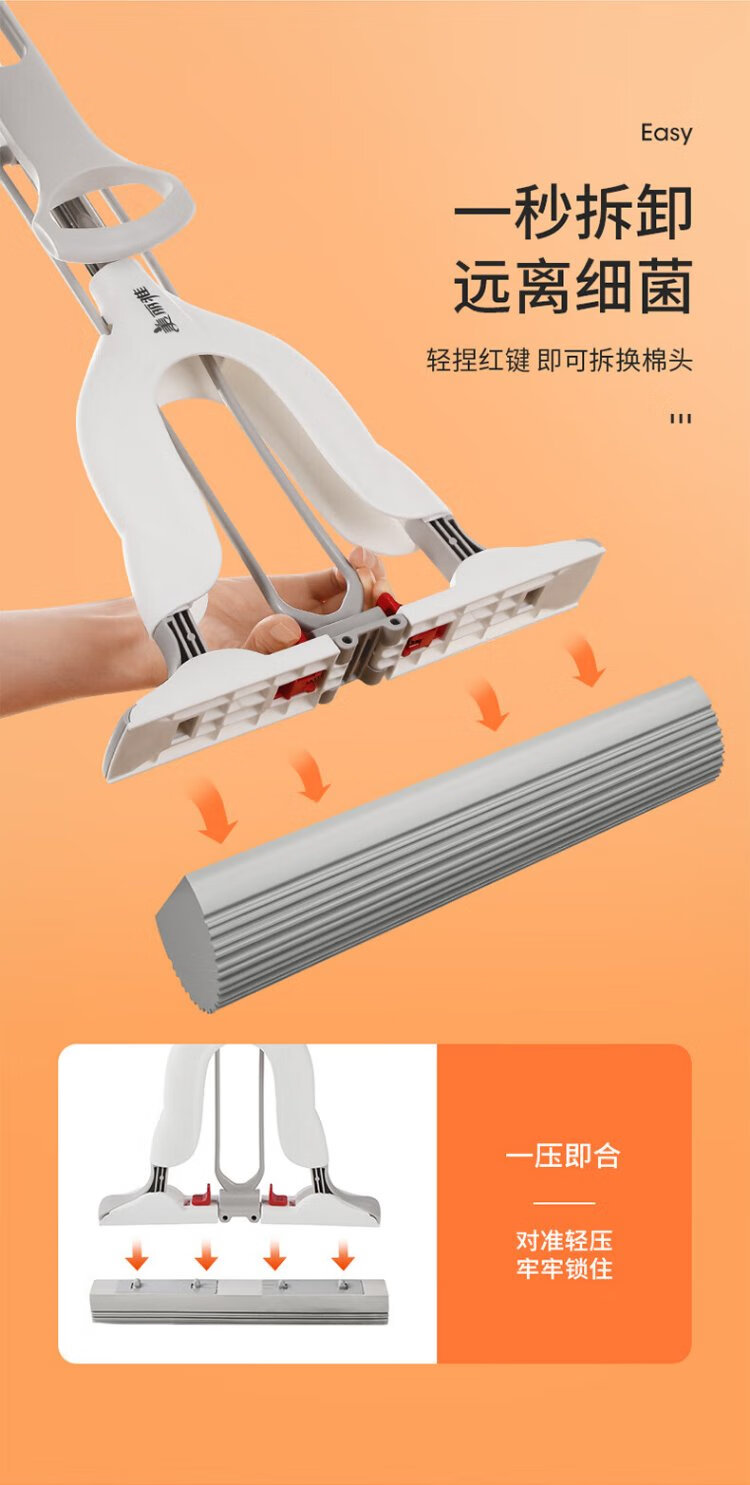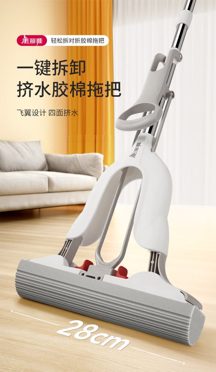 美丽雅胶棉拖把28cm2拖头吸水海绵一键卸头免手洗一拖净2025干湿两用