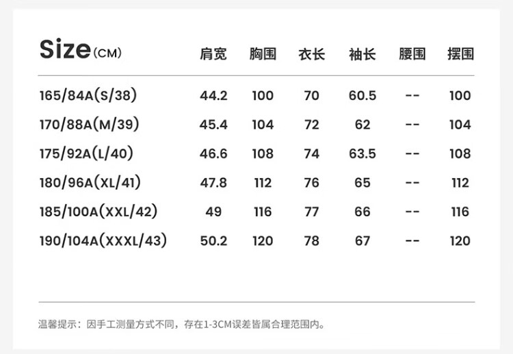 China (cm) 160-165/84-86 165-170 / 88-90 167-172 / 92-96 168-173 / 98-102 170-176 / 106-110