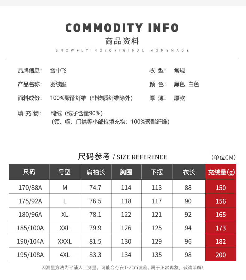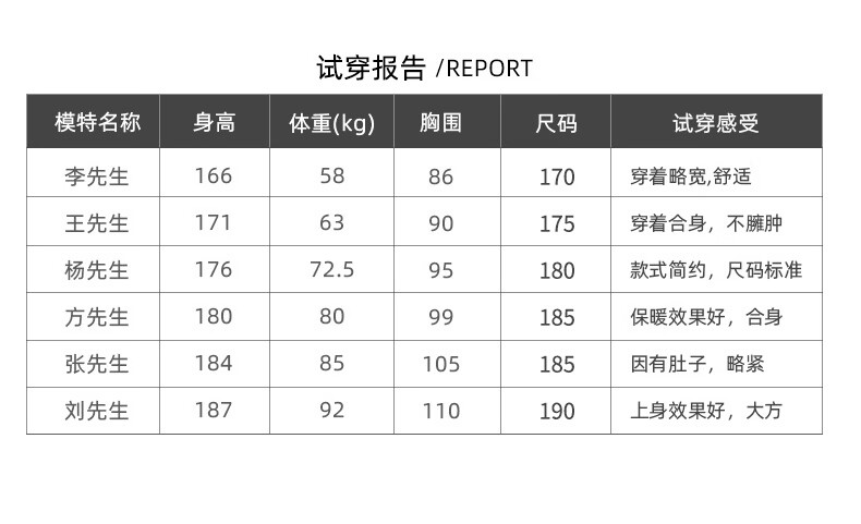 China (cm) 165 / 88-90 170 / 96-98 175 / 108-110 180 / 118-122 185 / 126-130