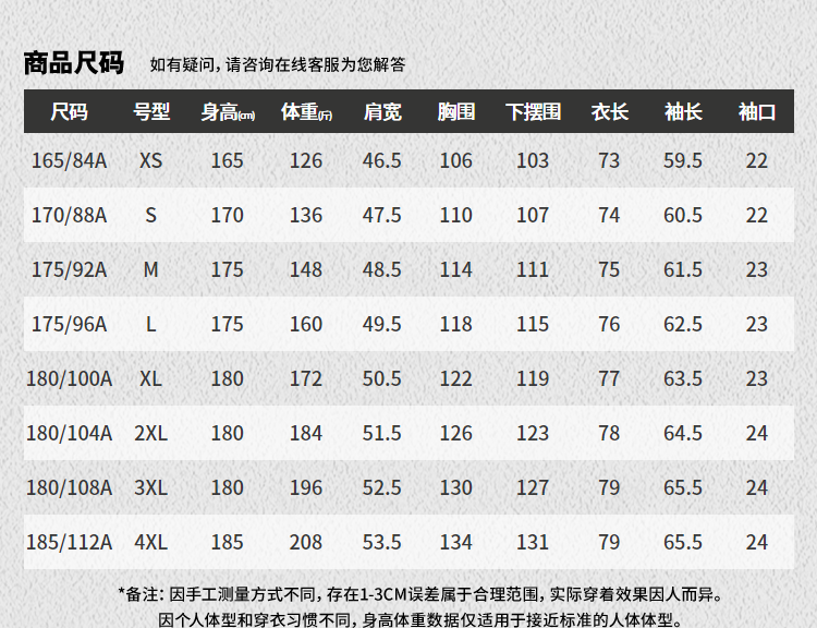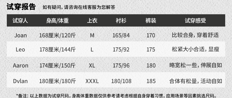 China (cm) 165 / 88-90 170 / 96-98 175 / 108-110 180 / 118-122 185 / 126-130