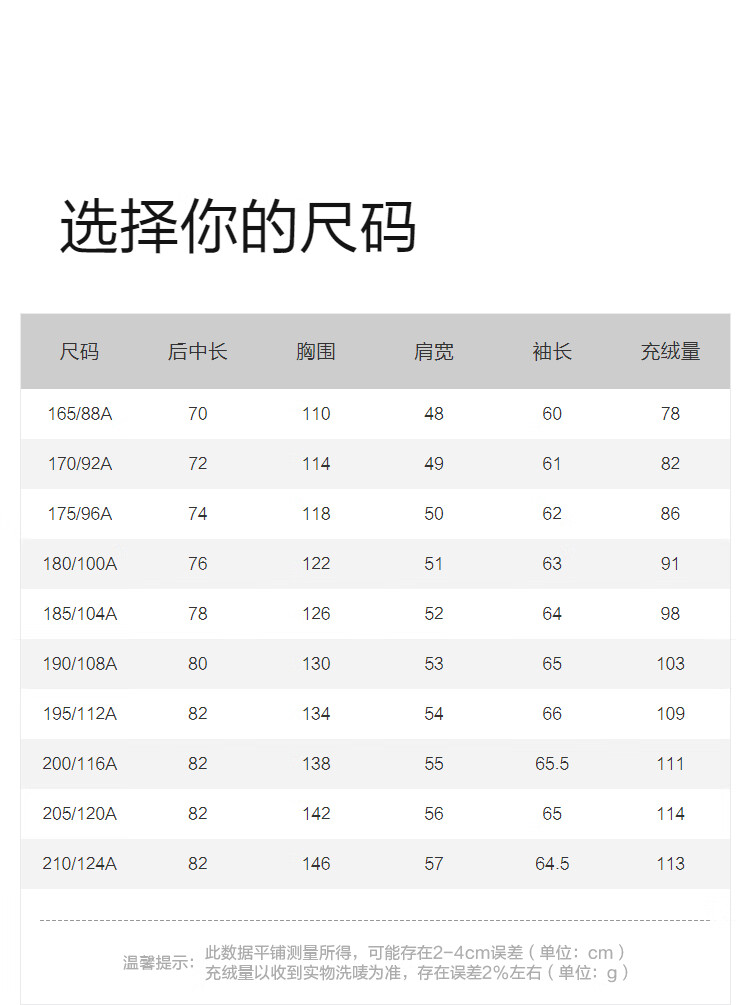 China (cm) 165 / 88-90 170 / 96-98 175 / 108-110 180 / 118-122 185 / 126-130