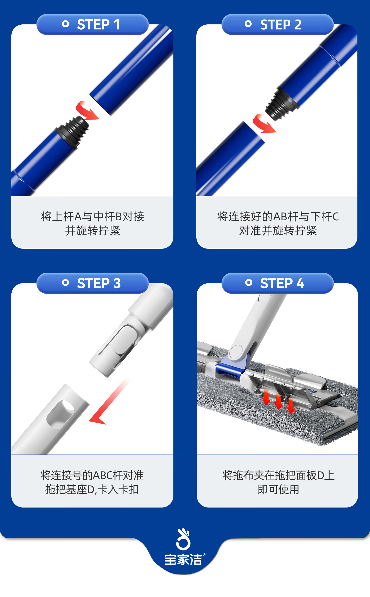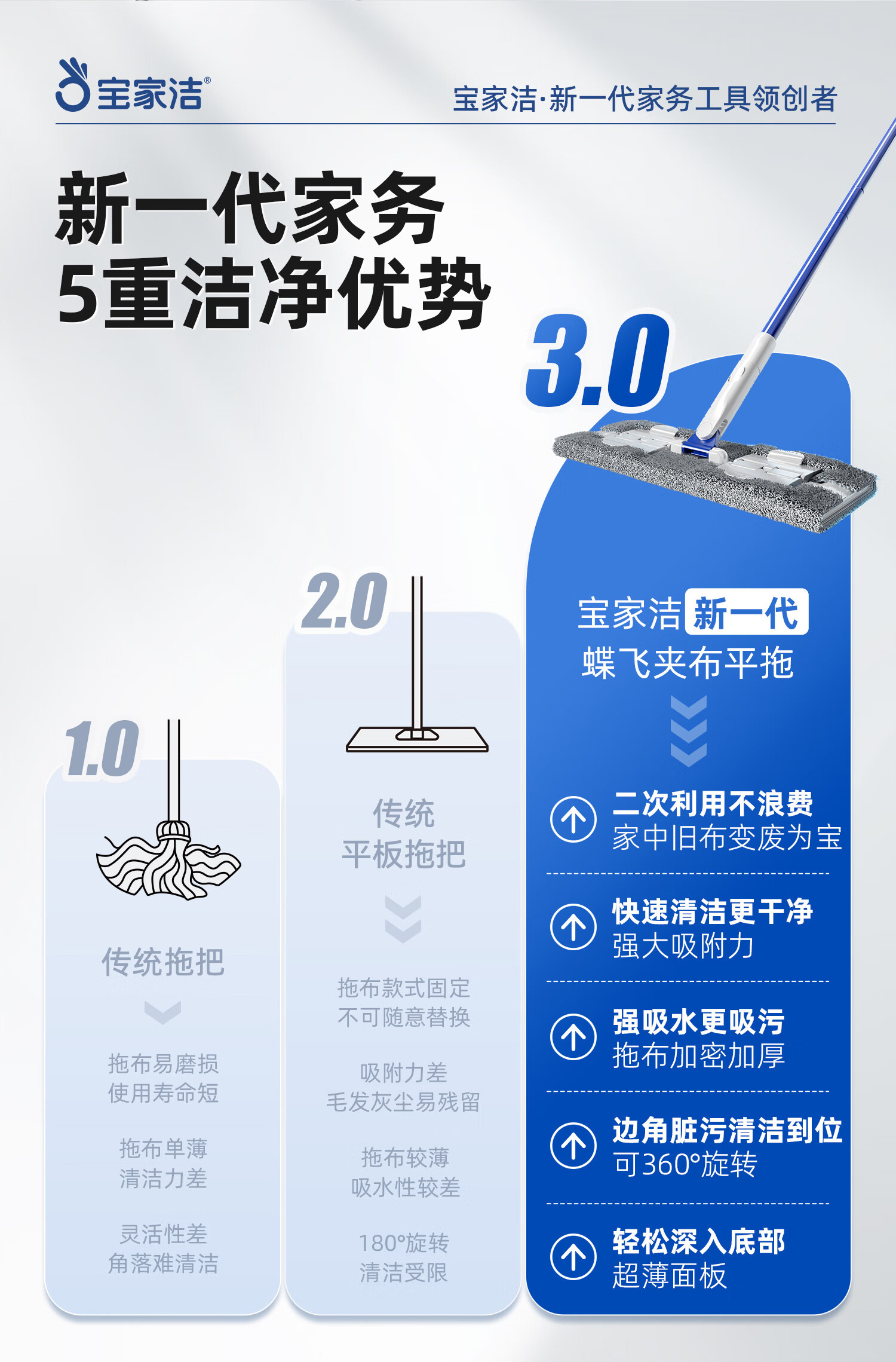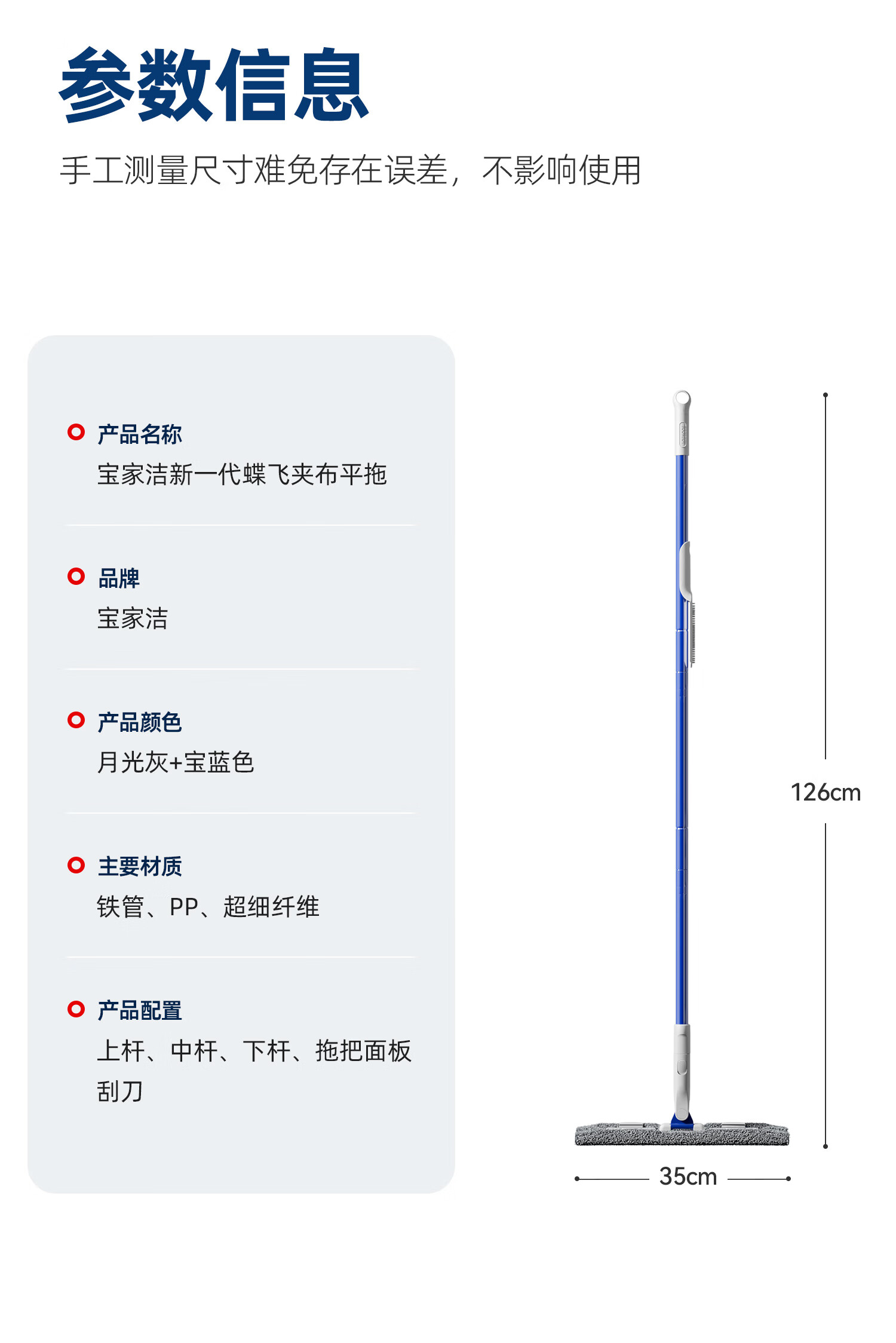 宝家洁平板拖把35cm杆长126cm配1片布XE06夹布除尘拖把